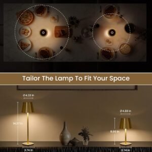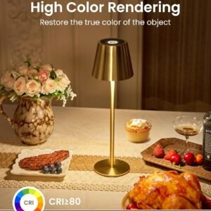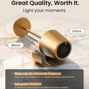 Control táctil y memoria: Esta lámpara de mesa inalámbrica ofrece 3 temperaturas de color (Cálido / Neutro / Fresco) con atenuación continua suave (10% 100%) para adaptarse a tus necesidades. La función de memoria recuerda tu última configuración para una comodidad instantánea Carga rápida y larga duración: se recarga completamente en solo 5 horas a través de la carga rápida tipo C (máximo 5 V y 2 A). Utiliza el cable de carga incluido para un rendimiento óptimo. La batería recargable incorporada proporciona de 6 a 75 horas de uso, por lo que es la lámpara inalámbrica perfecta para uso doméstico Diseño de cristal refinado: la parte superior de vidrio mejorada y la pantalla LED esmerilada ofrecen una luz suave y sin parpadeos. Con almohadillas antideslizantes para mayor estabilidad, esta lámpara de mesa LED permanece firmemente en su lugar, combinando funcionalidad con elegancia atemporal Uso en interiores y exteriores: disfrute de la libertad de iluminación con esta lámpara inalámbrica, sin límites. Inalámbrica y resistente al agua para cualquier espacio. El cuerpo de metal duradero y el acabado de vidrio se adaptan perfectamente a la decoración interior o a las reuniones al aire libre Servicio confiable: Cada lámpara operada por batería está respaldada por soporte 24/7. Póngase en contacto con nosotros en cualquier momento: nos aseguraremos de una solución rápida y amigable para sus necesidades de iluminación.