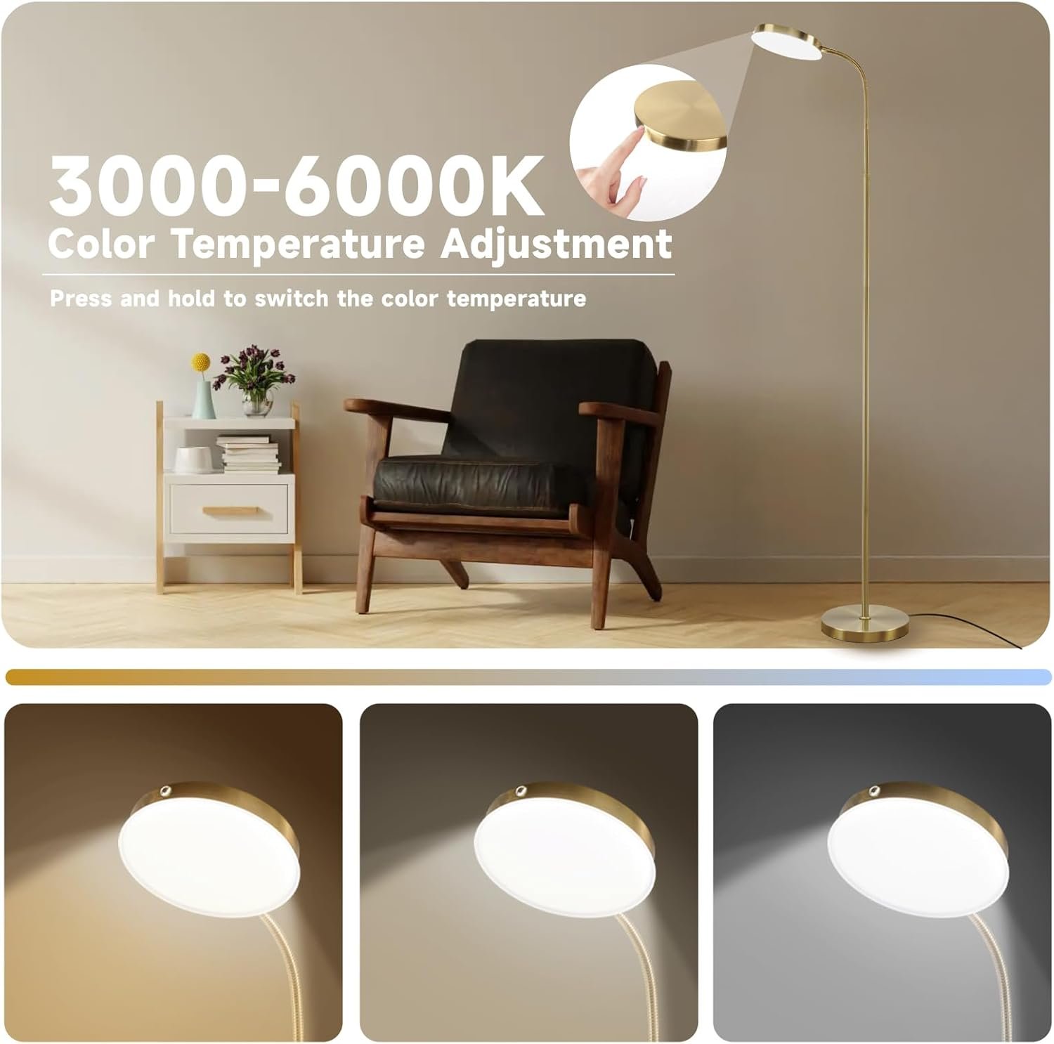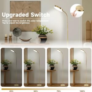 LAMPARA DE PIE LED CON CONTROL TÁCTIL MEJORADO : Mejorada con una función de control táctil en la pantalla, nuestra lámpara de pie LED te permite ajustar los niveles de brillo sin esfuerzo. Con una simple pulsación, encuentra y establece fácilmente el brillo y la temperatura de color perfectos para leer, trabajar, relajarse, aplicar maquillaje, manualidades o dormir. Disfruta de la comodidad al alcance de tu mano con un control preciso para cada tarea y ambiente. Colores y brillo regulables continuos : nuestra lámpara de pie de arco cuenta con atenuación sin costuras y tres opciones de temperatura de color. Sumérgete en el ambiente ideal con un brillo ajustable del 5% al 100% y tres temperaturas de color que van desde 3000K hasta 6500K. Ya sea que estés creando un acogedor rincón de lectura o un espacio de trabajo enfocado, nuestra lámpara ofrece modos de escena preestablecidos para lectura, guardería, trabajo y luz nocturna. Con una práctica función de memoria, recuerda tu última configuración para una comodidad sin esfuerzo. LÁMPARA AJUSTABLE EN ALTURA 2-EN-1 Nuestro diseño innovador cuenta con una varilla removible, lo que te da la libertad de ajustar la altura de esta versátil lámpara según tu preferencia. Cambie sin esfuerzo entre una lámpara de pie y una lámpara de escritorio girando y desmontando las varillas desmontables. Con tres alturas ajustables que van desde 105,5 cm a 131,5 cm, y una altura máxima de 157,5 cm, esta lámpara ofrece flexibilidad para adaptarse perfectamente a tu espacio y necesidades. Cuello de cisne de 360° y diseño moderno: con su cuello de cisne ajustable y rotación de 360 grados, esta lámpara de pie te permite dirigir la luz donde la necesites. Su diseño elegante y moderno se mezcla sin esfuerzo con varios estilos de muebles, desde contemporáneo hasta minimalista o ecléctico. Ya sea para tu apartamento, dormitorio universitario o cualquier espacio habitable, esta lámpara añade tanto función como estilo, elevando el ambiente con su diseño versátil y elegante. Fácil instalación y operación : Nuestra lámpara de pie presume de un diseño simple pero elegante, con una varilla fácilmente desmontable para una instalación y uso sencillos. Disfruta de una configuración y operación sin complicaciones, proporcionando una iluminación brillante para tu sala de estar con facilidad.