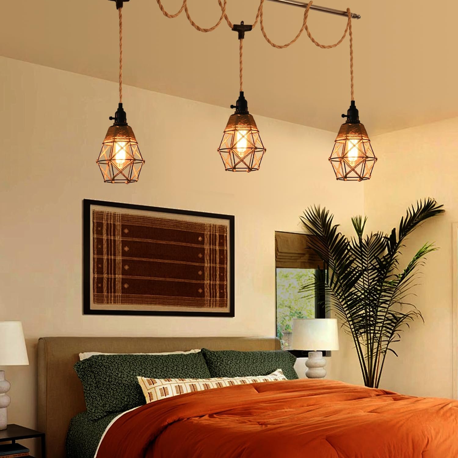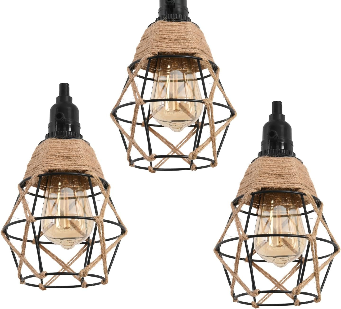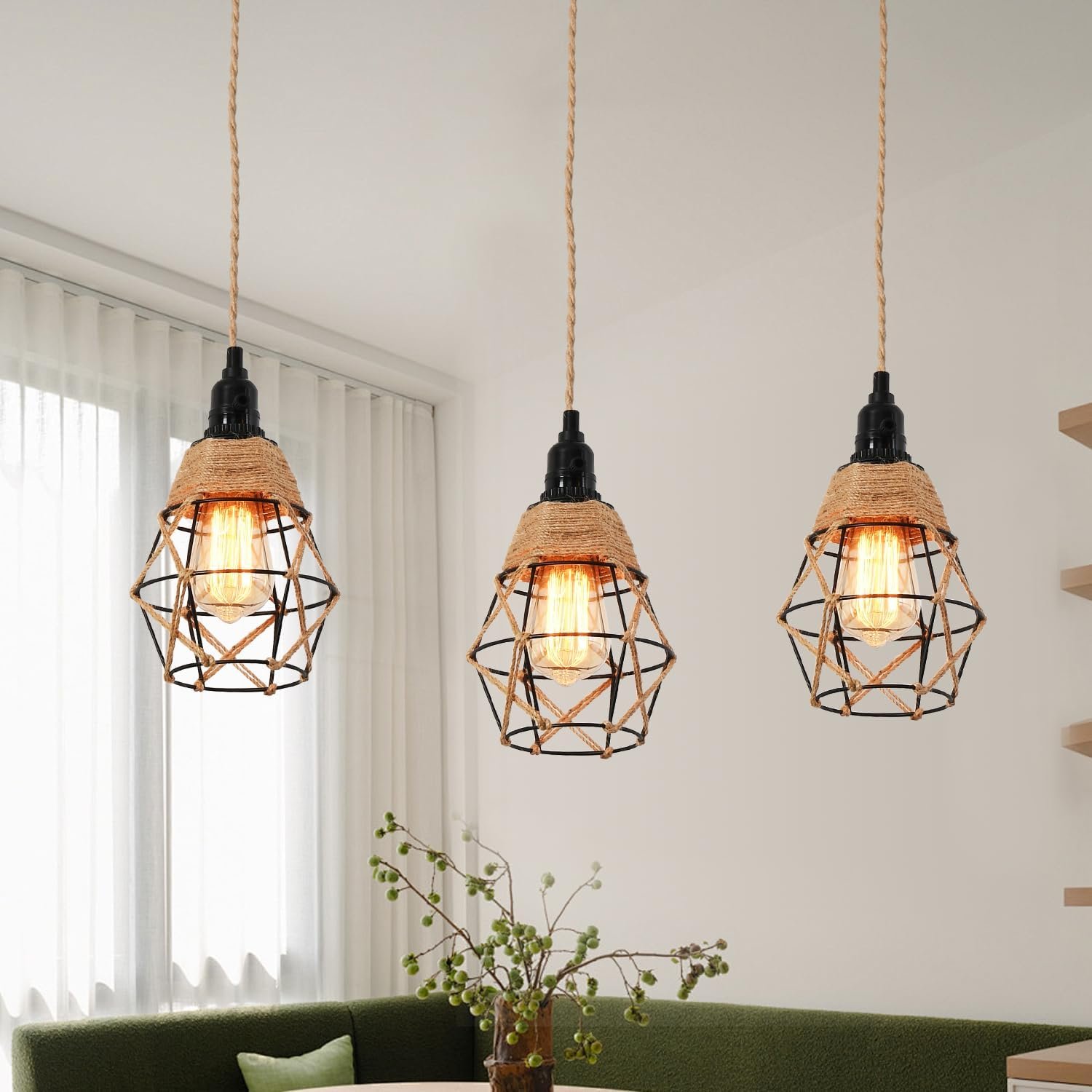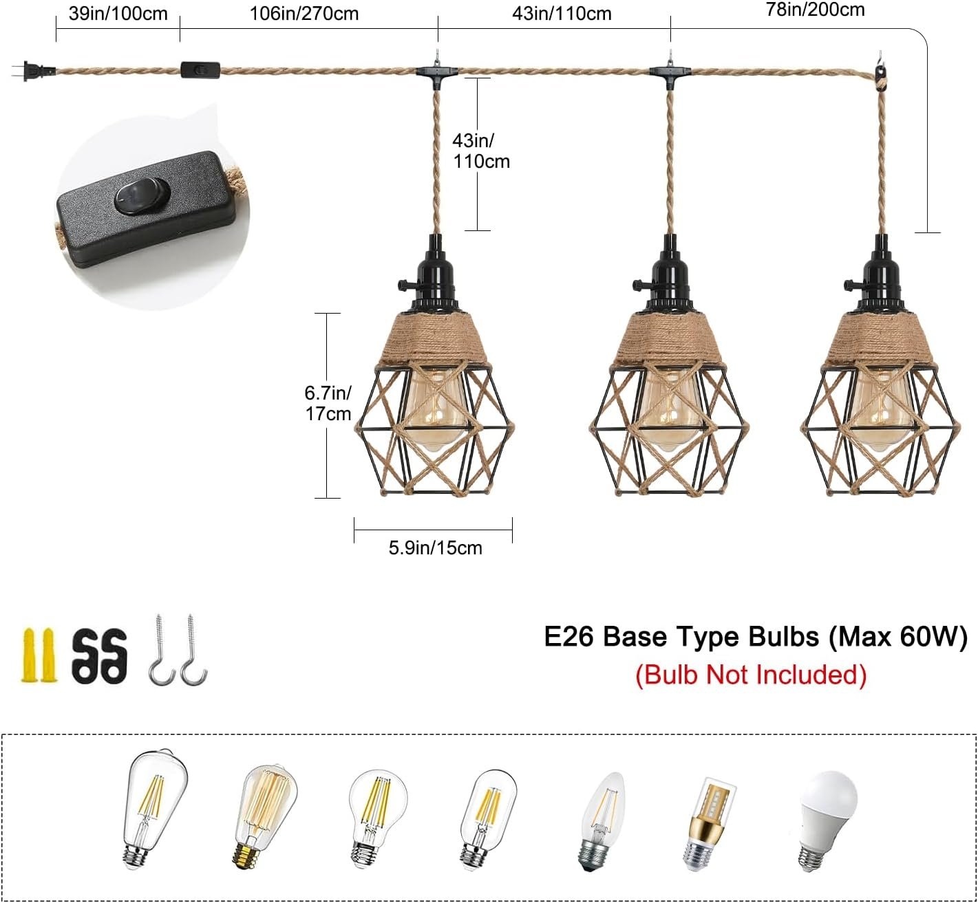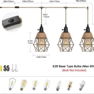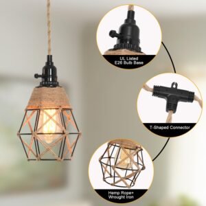 Luz de cuerda de cáñamo vintage: eleva tu espacio con este cable de luz colgante de 27 pies hecho de cuerda de cáñamo trenzado natural premium y equipado con enchufes de luz certificados UL. La excelente aislación y resistencia al calor garantizan la seguridad y confiabilidad, asegurando una vida útil más larga en comparación con las luces de cuerda ordinarias. Perfecto para tu proyecto de iluminación DIY: Da rienda suelta a tu creatividad con este versátil kit de cable, que te permite personalizar tu diseño de iluminación. Añade bombillas Edison, pantallas de cesta de alambre o cualquier pantalla de lámpara de tu elección. Cuélgalo donde desees, ya sea para la decoración del hogar en salas de estar, comedores, sótanos o granjas, o para ocasiones especiales como bodas, fiestas y celebraciones. El aspecto vintage añade un encanto rústico pero elegante a tu área. Práctico control de interruptor: Con interruptores giratorios individuales para cada enchufe, junto con un interruptor basculante de encendido/apagado en el cable, esta luz colgante ofrece un control conveniente en ambos extremos. No hay necesidad de un interruptor adicional: enciende/apaga fácilmente cada una de las tres luces individuales para adaptarse a tus preferencias, por lo que es ideal para áreas al alcance como sofás o sillas. Especificaciones de la bombilla y fácil instalación: Compatible con 3xE26 bombillas incandescentes/LED (no incluidas); se sugiere usar 60W con una potencia máxima de 250W. El kit bien empaquetado incluye todos los accesorios para colgar, lo que garantiza un proceso de instalación rápido y sencillo. Cuelga el cable del candelabro, enrosca las bombillas y enchufa y funciona en solo unos minutos. Garantía: Respaldado por una garantía de 2 años y portalámparas certificados por UL, este cable de luz colgante brinda tranquilidad. En caso de cualquier defecto, usted es elegible para un reembolso o reemplazo, asegurando su satisfacción y la longevidad de su solución de iluminación.