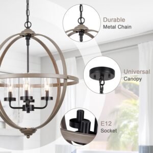 Araña para comedor: Esta araña para comedor presenta una construcción de hardware de alta calidad con un acabado de grano de madera, añadiendo un toque de encanto vintage a cualquier espacio. La combinación de estos acabados lo convierte en una pieza central ideal para tu hogar Cadena ajustable: esta lámpara colgante está equipada con cadena y cable de 106,7 cm; la longitud se puede ajustar de acuerdo a tus preferencias. Ideal para comedor, sala de estar, cocina, baño, entrada, vestíbulo, dormitorio, pasillo, bar, entrada, etc 4 enchufes E12: sostiene 4 bases de lámpara de candelabro E12, soporte máximo de 4 bombillas de 60 W. El voltaje de trabajo es de 120 V, CA. Este moderno accesorio de iluminación colgante tiene capacidad para cuatro bombillas E12 (bombilla no incluida). El diseño vintage mejora la versatilidad, por lo que es adecuado para varios entornos Fácil de instalar: esta lámpara colgante moderna está diseñada para una fácil instalación. Ya sea que tenga un techo inclinado o abovedado, la longitud ajustable permite un posicionamiento perfecto para adaptarse a su espacio. Con todos los accesorios necesarios incluidos, asegurando que puedas disfrutar de tu candelabro Amplia aplicación: El estilo rústico, vintage e industrial global de este candelabro de 4 luces lo hace perfecto para varios entornos, incluyendo islas de cocina, entradas y comedores. Su diseño versátil complementa la decoración contemporánea y tradicional, por lo que es un complemento versátil para tu hogar