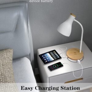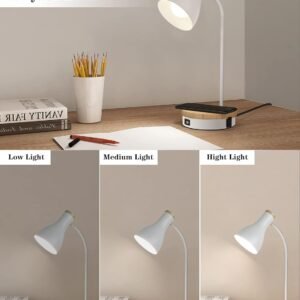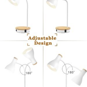 Cargador inalámbrico rápido y puerto de carga USB: esta lámpara LED de escritorio con carga inalámbrica puede cargar rápidamente dispositivos iPhone y Samsung compatibles de hasta 10 W. Puerto de carga USB incorporado mejorado de 5 V/2.1 A de salida, también para cargar tus dispositivos móviles cómodamente. El cargador y la luz de escritorio funcionan de forma independiente, no te preocupes por que la luz de la lámpara se vea afectada al cargar el dispositivo móvil. Lámpara de escritorio de metal de alta calidad: el encantador diseño muestra un cuerpo de metal tubular y una base de lámpara de madera para un toque industrializado adicional. Esta lámpara de escritorio industrial está diseñada para un aspecto moderno y elegante. Lámpara táctil regulable de 3 vías: la bonita lámpara de escritorio es fácil y conveniente para ajustar las etapas de brillo (bajo, medio, alto, apagado). La luz baja es ideal para un sueño constante o lactancia; la luz media es adecuada para el uso diario y la luz alta es lo suficientemente brillante para leer y trabajar. Tocando la base resistente para atenuar los niveles de brillo para satisfacer tus diversas demandas en diferentes momentos u ocasiones. Cuello de cisne flexible de 180° El cuello de cisne flexible permite que esta luz de lectura se ajuste a cualquier ángulo que desees sin ningún ruido, y el diseño ligero la hace altamente portátil. Puedes utilizar las lámparas de escritorio para trabajar, leer o estudiar en cualquier lugar, incluso en la cama. Simple, ligera y perfecta para la temporada de regreso a clases y artículos esenciales para el dormitorio. Protección ocular y respetuosa con el medio ambiente: nuestra lámpara de escritorio incluye una bombilla LED de 9 W en el paquete. Lámpara de mesa hecha de alta calidad, sin parpadeo, sin deslumbramiento, sin área oscura, ayuda a aquellos que leen y trabajan horas al día a proteger la vista y reducir la fatiga ocular, ideal para leer, dibujar, trabajar, estudiar. El mejor regalo para niños y amantes de los libros. Como una lámpara de escritorio de lectura ecológica, consume un 80% menos de energía que las luces incandescentes tradicionales para que puedas reducir tu huella de carbono y al mismo tiempo reducir tu factura de electricidad.