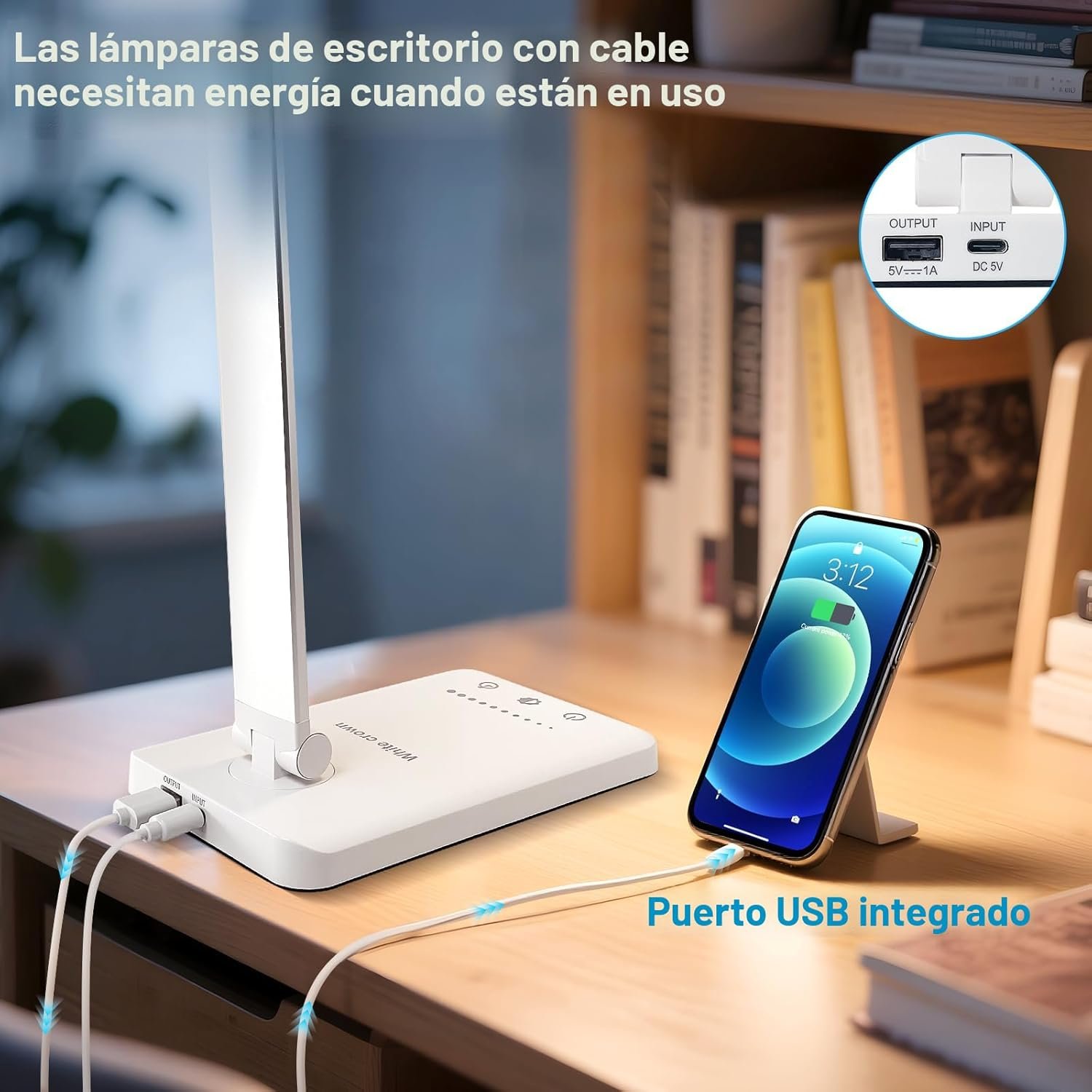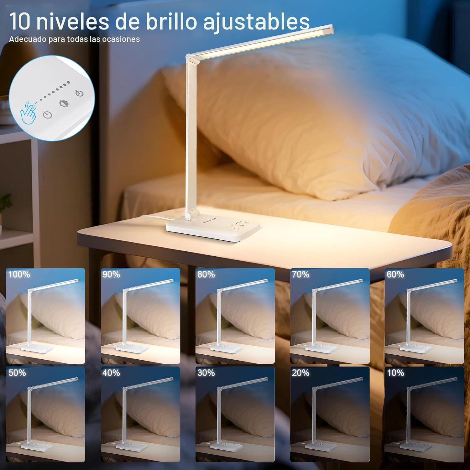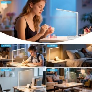 Lámpara de escritorio LED versátil: Esta lámpara de escritorio moderna cuenta con 52 LEDs amigables para los ojos con 5 niveles de brillo ajustables y 5 modos de iluminación, perfecta para leer, estudiar, trabajar o relajarse Controles táctiles inteligentes y función de memoria: la lámpara tiene controles táctiles intuitivos y una función de memoria para ajustar y guardar fácilmente sus ajustes de iluminación preferidos. Conveniente carga y temporizador: incluye un puerto USB integrado de 5V/1A para la carga del dispositivo y un temporizador de apagado automático para ahorrar energía cuando se duerme Diseño duradero y energéticamente eficiente: con un elegante cuerpo de aluminio, sin radiación UV/IR y una vida útil de 50.000 horas LED, esta lámpara proporciona una iluminación duradera y ecológica Larga vida útil: lámpara de escritorio LED. Sin plomo ni mercurio. Sin radiación UV o IR. Adopta disipador de calor de aleación de aluminio, hasta 50000 horas de vida útil, 42 veces más que una luz incandescente típica Nota: La lámpara de escritorio no tiene batería y debe conectarse a un USB o toma de corriente cuando esté en uso