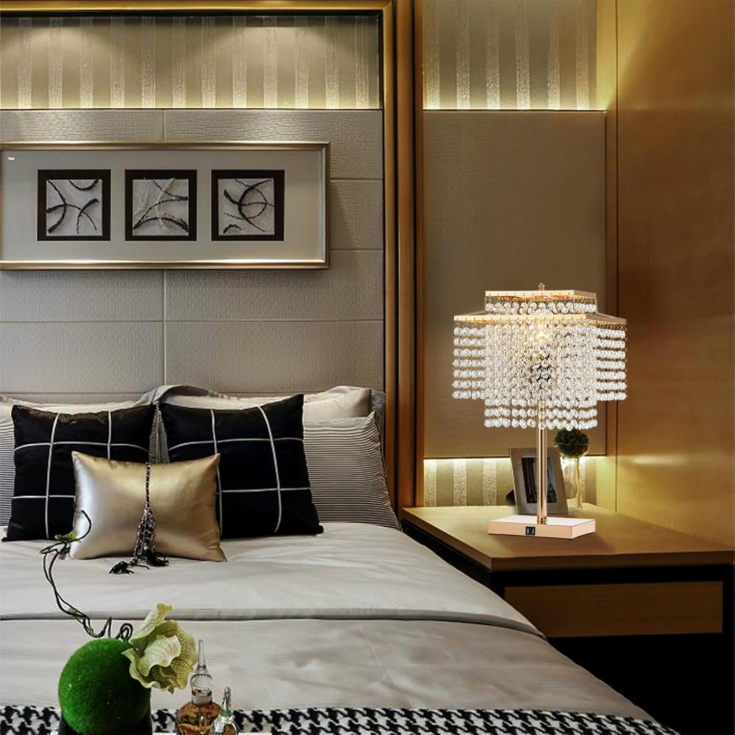 Lámpara de mesa de cristal dorado con 2 puertos de carga USB