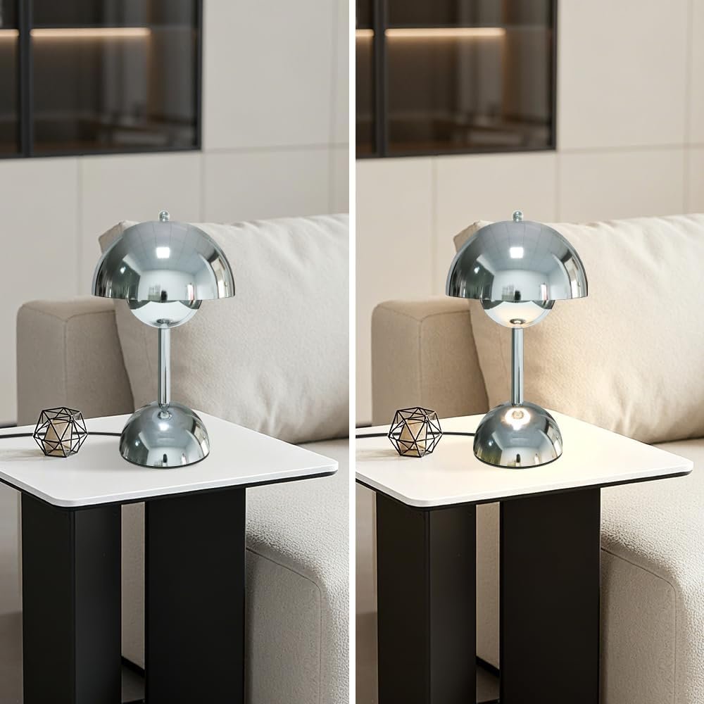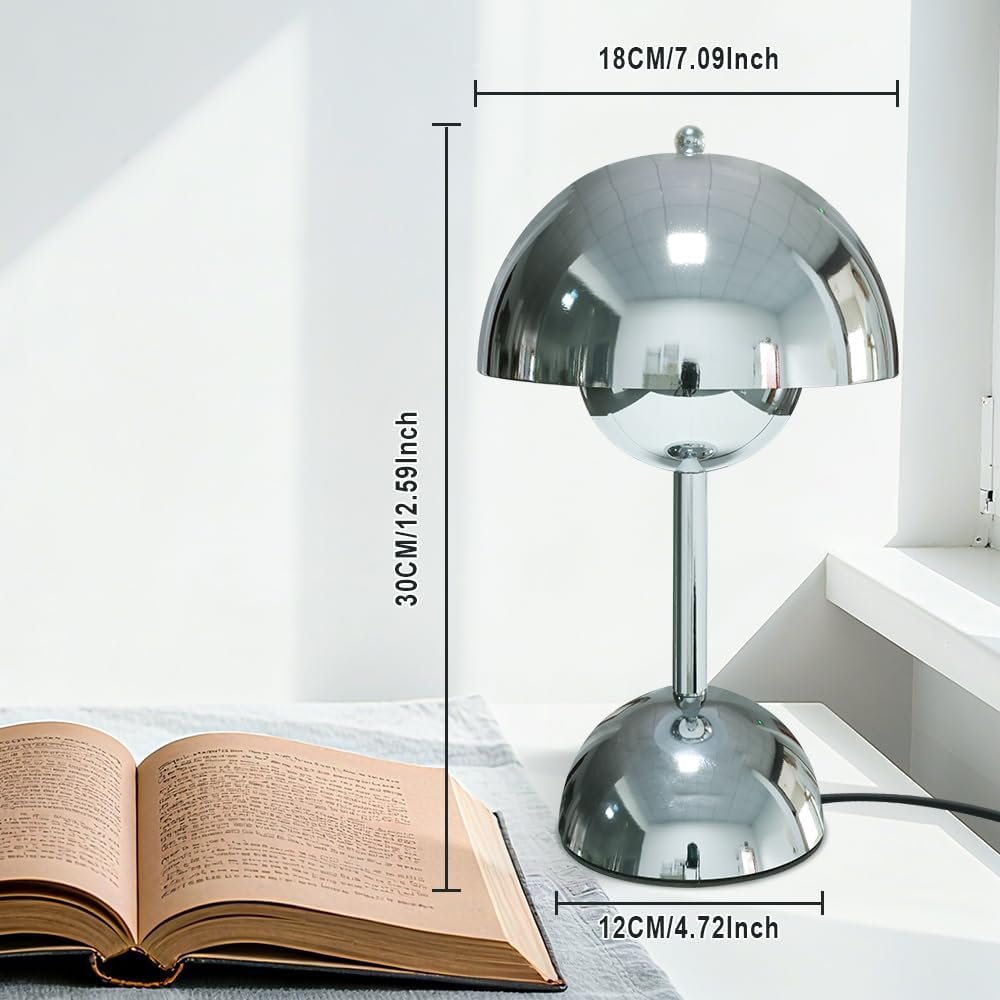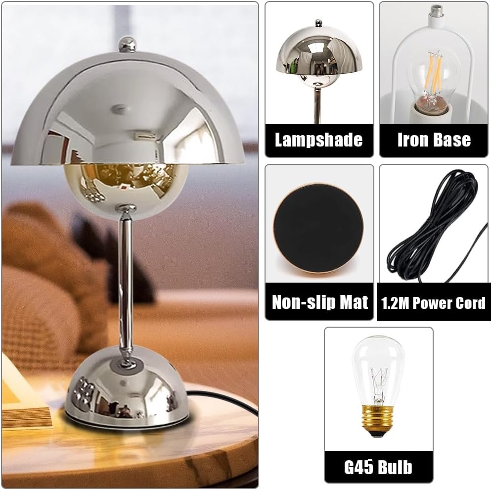 LÁMPARA DE MESA ESTÉTICA MODERNA: La forma de la lámpara de cromo se parece a un hongo, muy linda; Y la superficie plateada está pulida y lisa utilizando tecnología de galvanoplastia, haciendo que la lámpara de escritorio sea más elegante y hermosa. Así que puedes tener una lámpara tan moderna, ya sea que la pongas en la sala de estar, comedor, sala de estudio, apartamento o dormitorio universitario, tienda, aula, sala de lectura, hotel, ático; todas son decoraciones perfectas y accesorios de iluminación. Atenuación táctil: función de atenuación de 3 vías, alto/medio/bajo, 3 niveles de brillo se pueden convertir tocando suavemente la base de la lámpara. Proporciona diferentes niveles de brillo para satisfacer los requisitos de iluminación en la vida diaria; El descanso nocturno puede elegir un brillo bajo, como pequeña luz nocturna; elige un brillo medio o alto para el trabajo o el estudio. El difusor de la lámpara de escritorio tiene una forma semiesférica que rodea la bombilla en su totalidad, por lo que la lámpara de escritorio emite luz hacia abajo, lo que puede proteger eficazmente los ojos. FOCO LED: Esta lámpara de luz cálida incluye un pequeño foco regulable G45, por lo que no necesita comprar un foco nuevamente; 3000K, foco de luz cálida, cabezal de lámpara E26; Y está instalado, solo siga las instrucciones para ensamblar la lámpara de escritorio, conéctelo y ya puede usarlo. Nota: Esta lámpara de escritorio solo puede usar bombillas regulables G45, ¡así que no instales bombillas no regulables para su uso! PEQUEÑA LÁMPARA DE ESCRITORIO: altura de la lámpara 30cm (30,0 cm), diámetro de la base 12cm (12,0 cm), diámetro de la pantalla de la lámpara 18cm (18,0 cm); Por lo tanto, esta lámpara de escritorio es muy compacta, adecuada para uso en mesitas de noche y gabinetes, y no ocupa mucho espacio; El cable de alimentación es de aproximadamente 1M o más, por lo que es lo suficientemente largo para ser movido a cualquier posición para su uso. Montaje en 3 pasos de la lámpara de escritorio: el montaje es simple y se puede completar en unos minutos: (1) gira y fija el poste de la lámpara al cuerpo de la lámpara, (2) conecta el cable de alimentación y el clip de alimentación de la base, (3) retira la bola de metal fija del marco de la lámpara, instala la pantalla de la lámpara, vuelve a girar y fija la bola de metal fija a la pantalla. (!!! ! Atención: Al conectar los cables del cuerpo de la lámpara, debes aplicar una ligera fuerza para que los clips de conexión se unan firmemente.