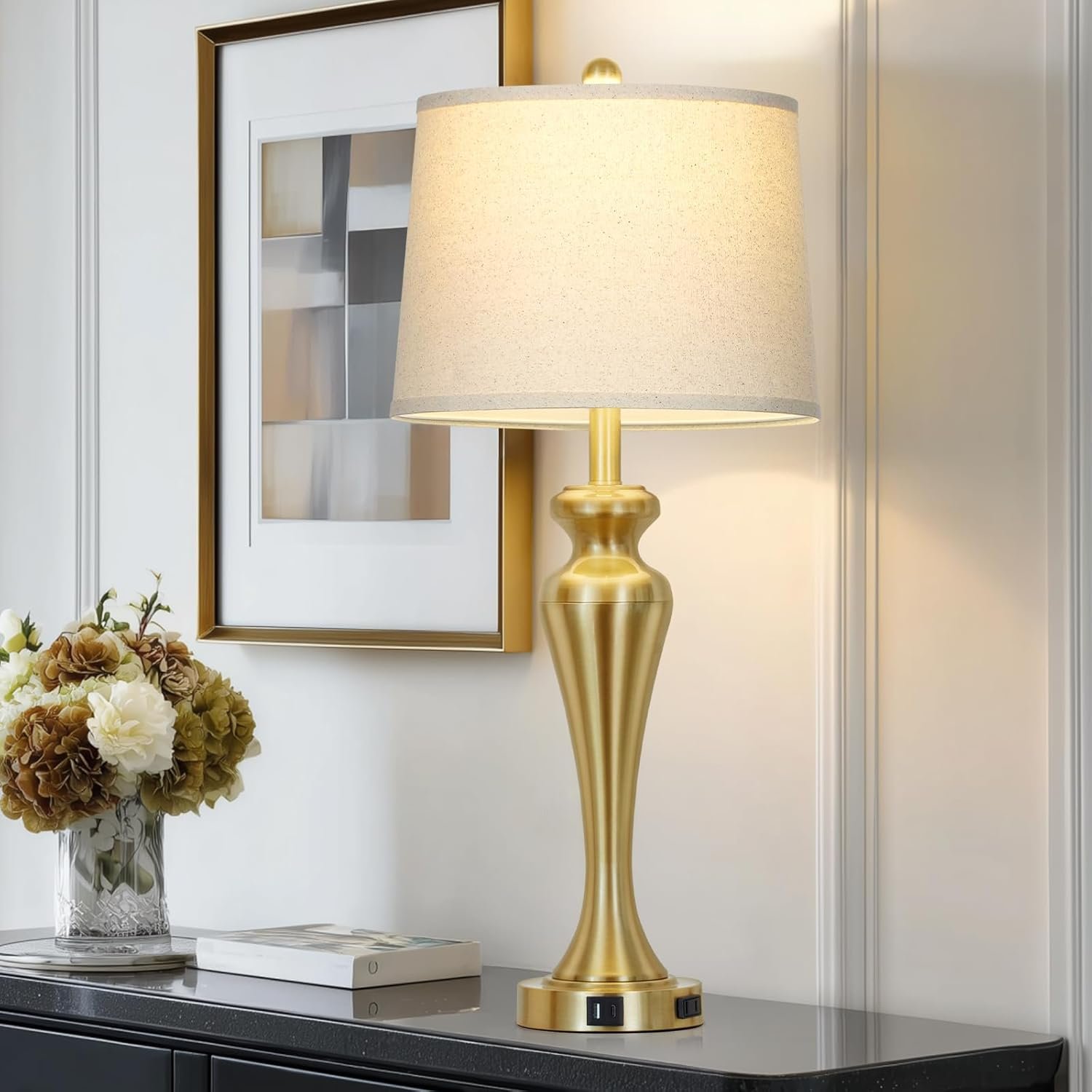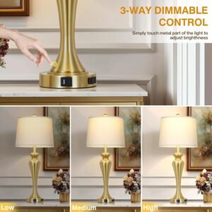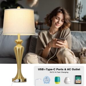 Puertos USB A+C y salida de CA: puedes cargar cómodamente 3 dispositivos al mismo tiempo. Reduzca el desorden de cables y adaptadores para un escritorio más limpio. La función de carga funciona si la lámpara de mesa dorada está encendida o apagada, añadiendo comodidad a tu vida diaria Lámpara de mesa única moderna El tamaño es: 76,2 cm x 33,0 cm x 24,1 cm. Hecho de metal de alta calidad, y acabado con una pantalla de lámpara de lino natural color avena. La lámpara táctil para mesita de noche es perfecta para la mesa auxiliar de la sala de estar o el dormitorio. Añade encanto moderno a tu hogar u oficina Lámpara táctil regulable de 3 vías: te ahorra la molestia de buscar tientas con el interruptor en la oscuridad. Simplemente toca la parte metálica de la lámpara alta de la sala de estar para cambiar rápidamente el nivel de brillo. Diferentes opciones de iluminación para satisfacer tus diferentes necesidades Fácil montaje No se requieren herramientas y el portalámparas se puede instalar fácilmente en unos minutos. Lámpara de mesa dorada individual viene con 2 años de servicio postventa y servicio al cliente las 24 horas. Estamos 100% dedicados a tu completa satisfacción con la lámpara para dormitorio Bombilla LED incluida ¡Dile adiós a la molestia de encontrar bombillas compatibles! Viene con una bombilla LED E26 con una vida útil de 25.000 horas, más ahorro de energía y durabilidad. Lámpara de mesita de noche con pantalla de lino natural que suaviza la luz para proteger tu vista