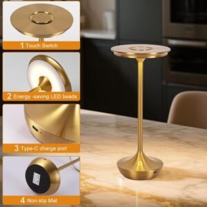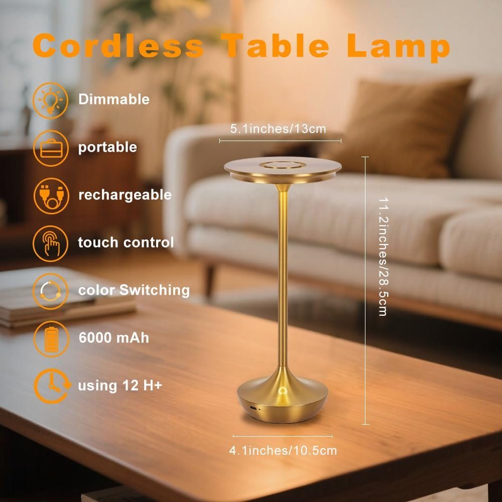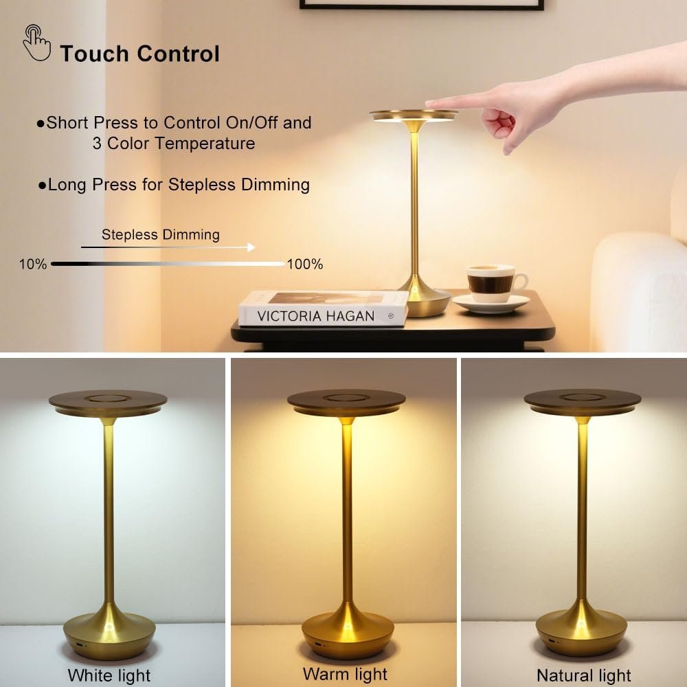 Control táctil y luz regulable de 3 colores Ajusta fácilmente la iluminación con control táctil: solo toca para encender/apagar o mantén presionado para cambiar el brillo (5%-100%). Con tres temperaturas de color (3000 K cálida, 4000 K neutra, 6000 K fría), esta lámpara inalámbrica se adapta a diferentes necesidades, desde la lectura y el trabajo hasta la luz nocturna o un ambiente acogedor. La lámpara LED libre de parpadeos y para el cuidado de los ojos reduce la fatiga visual, haciéndola perfecta para dormitorios, oficinas o dormitorios Batería recargable y de larga duración Esta lámpara de mesa recargable USB tipo C con batería integrada de 6000 mAh proporciona de 8 a 48 horas de iluminación inalámbrica. No hay necesidad de carga constante, ideal para mesitas de noche, escritorios, comedores e incluso espacios al aire libre. Ya sea que se use como una lámpara de mesita de noche inalámbrica, luz de respaldo en caso de apagón o lámpara de estudio portátil, ofrece comodidad en cualquier lugar, como camping, restaurante, exterior, patio. Lámpara de Mesa de Metal Hecha Hecho de cuerpo de lámpara de aluminio, después del tratamiento de recubrimiento mate, antiarañazos y anticorrosión; del cual el color dorado utiliza tratamiento de galvanización, suave y textura. Pantalla acrílica, buena luz, transmisión y no cegadora. Lámpara de decoración del hogar. La base contiene almohadillas antideslizantes para evitar que se vuelque accidentalmente. Lámpara de mesa táctil recargable por USB: enchufe de carga Tpye-C (nuestra lámpara incluye un cable de alimentación USB), esta lámpara de mesa inalámbrica no solo mantiene el aspecto perfecto del edificio, sino que también logra una fusión de decoración económica y duradera, puedes colocar las luces inalámbricas en cualquier lugar, como dormitorio, comedor, oficina, sala de estar, bar, cafetería, etc. Servicio post-venta : Ofrecemos un servicio gratuito de reemplazo durante 365 días, esperamos que obtengas la mejor experiencia de compra. Si tu lámpara de mesa tiene algún defecto o deja de funcionar durante este período, te ayudaremos a solucionar problemas o te enviaremos un producto nuevo.