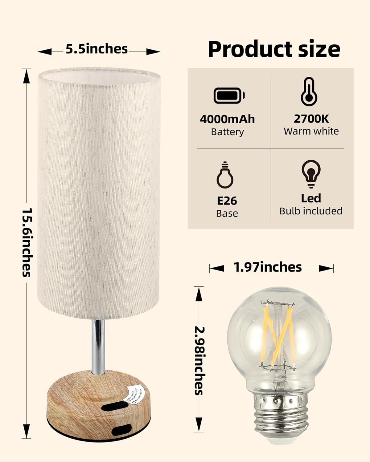 Brillante pero relajante: con una pantalla de tela premium, esta lámpara alimentada por batería ofrece una luz cálida de 2700 K que es brillante pero suavemente difusa para una sensación acogedora y ambiental, perfecta para cenar, relajarse o entretener, y añadir estilo y comodidad a cualquier espacio Batería recargable incorporada: esta lámpara inalámbrica cuenta con una batería de 4000mAh que proporciona hasta 11 horas de iluminación inalámbrica. Se recarga completamente en 4 horas a través de tipo C (5V/2A), con una luz roja que indica la carga y una luz azul cuando está completamente cargada Control táctil fácil, atenuación continua y temporizador: el botón de encendido se enciende/apaga (pulsación corta) y se atenúa 10-100% (pulsación larga). El botón del temporizador establece 2H/4H/6H o cancela, perfecto para dormitorios, salas de estar, comedores y mucho más Portátil y elegante diseño de grano de madera: esta lámpara de cocina cuenta con una elegante base de grano de madera con pantalla de tela suave para una luz cálida y difusa. La base antideslizante añade estabilidad, y la construcción ligera te permite moverla fácilmente entre habitaciones con estilo clásico Compatibilidad de bombilla: esta lámpara recargable está diseñada exclusivamente para bombillas LED de bajo voltaje de 5 V con un enchufe E26, lo que garantiza un funcionamiento seguro y eficiente en energía. No es compatible con bombillas de 120 V Lo que obtienes: lámpara de mesa recargable EZVALO