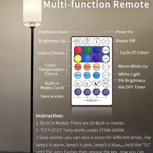 Varias formas de control Bombilla inteligente E26 que funciona con Alexa, Google Home y Siri para ayudarte a ajustar el brillo, ¡con manos libres! Aplicación Surplife, control remoto de 28 teclas e interruptor de pedal que son más convenientes para controlar tu lámpara de pie. Cambio de color Lámpara de pie inteligente WiFi RGB proporciona millones de colores de luz. Puede sincronizar música y escenas preestablecidas, incluso con el temporizador configurado para encender la lámpara con colores personalizados. ¡Con bombillas LED inteligentes, puedes cambiar la atmósfera de iluminación de la habitación a voluntad! Diseño Clásico Moderno Esta moderna lámpara de pie para sala de estar utiliza una copa dorada para conectar el metal negro con una pantalla de lino suave para un aspecto más elegante. La luz se difunde a través de la pantalla de lino y se vuelve más suave. Ajuste Regulable Continuo La bombilla LED inteligente tiene 800 lúmenes, la temperatura de color de 2700K-6500K se puede ajustar suavemente. La lámpara de pie brillante tiene una barra de ajuste del 0-100%. Cambio sin pasos entre luz cálida y fría. Fácil instalación La lámpara de pie es fácil de montar en 5 minutos, simplemente sigue las instrucciones o el video para atornillar todas las piezas.