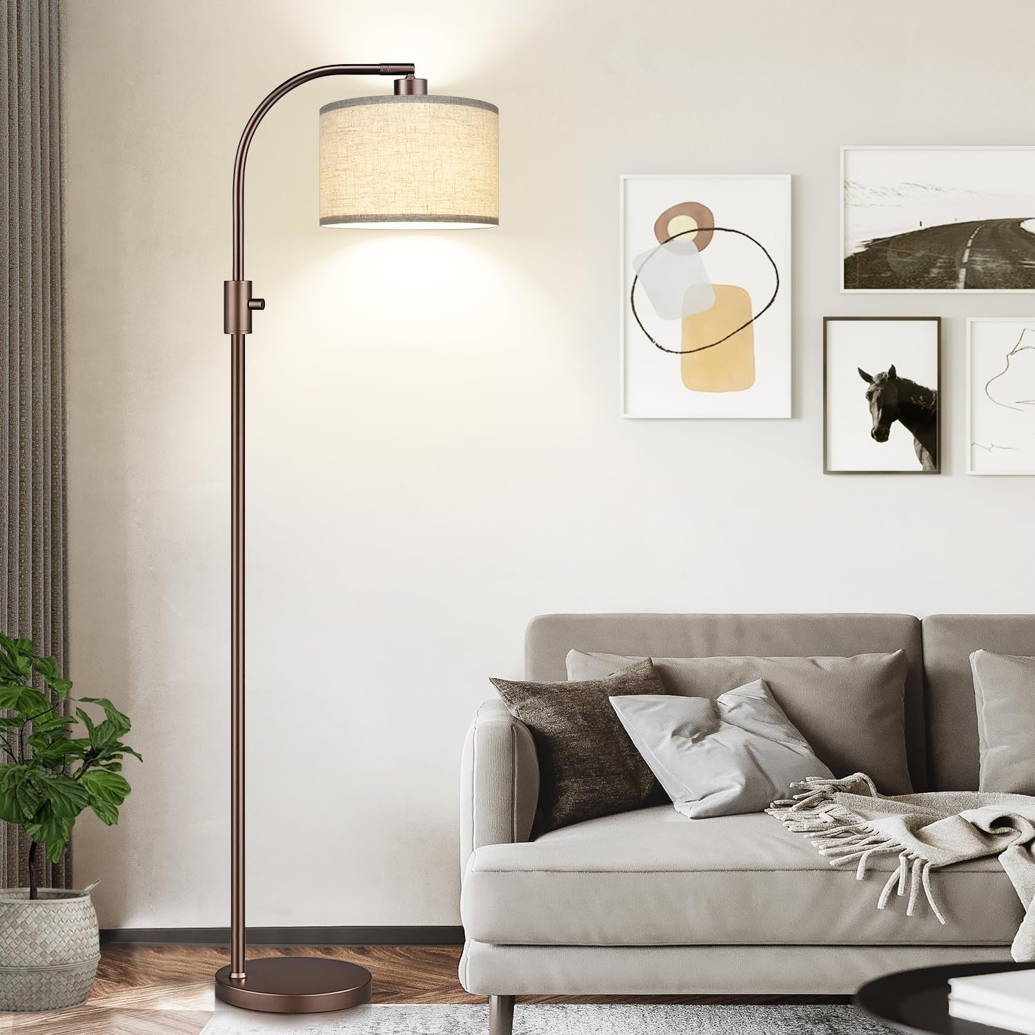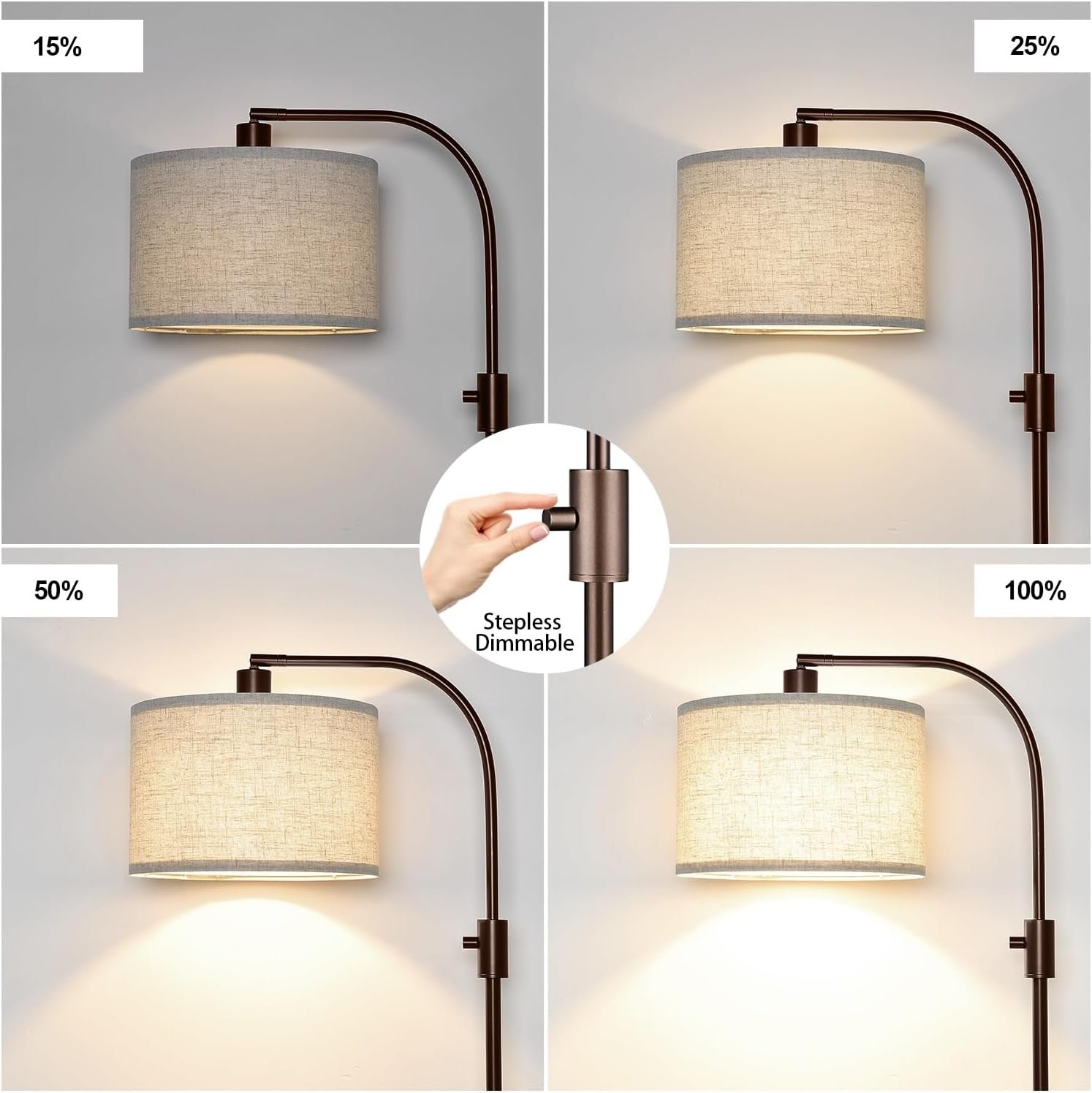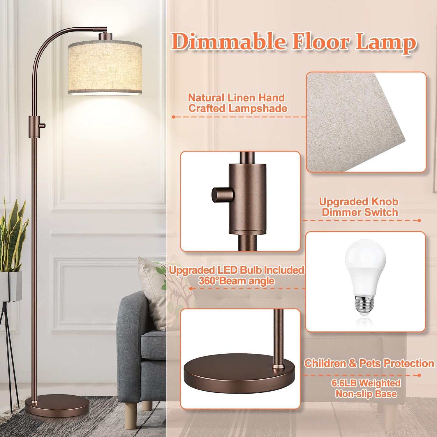 Lámpara de pie moderna con 0-100% brillo totalmente regulable: en comparación con las lámparas de pie tradicionales no regulables, nuestra exclusiva lámpara de pie ofrece una función de atenuación continua completa (0 – 100%), por lo que es adaptable a varios estilos de habitación y requisitos de iluminación que necesitas. Esta lámpara de pie marrón con pantalla de lino tiene un práctico interruptor de perilla: simplemente gírala para personalizar tus luces favoritas de lámparas de pie para sala de estar y dormitorios Pleca flexible con rotación horizontal de 360° y rotación vertical de 90°: lámpara de pie de arco de 65» viene con una cabeza giratoria que se puede rotar horizontal o verticalmente, asegurando comodidad para la vida diaria. Cuando colocas la lámpara de pie detrás del sofá, puedes ajustar la pantalla de la lámpara a cualquier ángulo que desees, lo cual es muy adecuado para leer y trabajar Bombilla regulable de 1200 lúmenes incluida: la lámpara de pie Nintiue incluye una bombilla LED de 11 W que es de 3000 K (blanco suave) y 25,000 horas de vida útil, creando una iluminación más acogedora y suave en tu habitación. La lámpara de pie LED para la sala de estar también tiene un alto brillo de hasta 1200 lúmenes, perfecta para leer y estudiar, protegiendo tus ojos de las luces parpadeantes. La lámpara de pie brillante funciona con varios tipos de bombillas regulables de base E26 (máximo 60 W) Lámpara de pie de esquina para sala de estar, dormitorio, sala de estudio: es muy conveniente y funciona muy bien cuando necesitas una lámpara de pie para un rincón oscuro. Esta lámpara de pie se adapta a cualquier habitación, desde decoración industrial hasta moderna o tradicional. Perfecto para una lámpara de pie de sala de estar, lámpara de pie de dormitorio, lámpara de pie de lectura, lámpara de pie de oficina, lámpara de pie de habitación de los niños, lámpara de pie de aula 3 años de soporte de productos y servicio al cliente: estamos orgullosos de respaldar todos nuestros productos al 100% y ofrecemos una garantía de 3 años. Si tu lámpara de pie tiene algún defecto o deja de funcionar dentro de 6 años, te ayudamos a solucionar el problema o te enviamos un producto completamente nuevo. Si tienes algún problema con nuestra lámpara de pie, por favor asegúrate de hacérnoslo saber y haremos todo lo posible para ayudarte