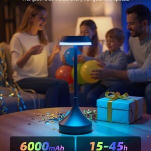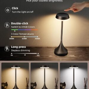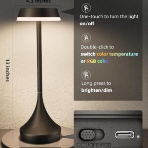 Diseño inalámbrico recargable: con una batería de 6000 mAh, esta lámpara ofrece hasta 15 horas de iluminación con brillo máximo, carga completa en 5 horas. El diseño portátil hace que sea fácil de mover y colocar en cualquier esquina, sirve como iluminación de emergencia durante cortes de energía Resistente al agua para uso en exteriores: Cuenta con protección impermeable IPX4, cuerpo resistente a la corrosión y base antideslizante, esta lámpara de mesa para exteriores soporta salpicaduras, lluvia y uso diario, proporcionando una iluminación estable y confiable para patios, jardines o incluso baños Control táctil para ajustar la iluminación: 3 temperaturas de color (3000 K, 4200 K, 6000 K), 4 colores RGB, 2 modos dinámicos y atenuación continua del 10% al 100%, para satisfacer tus necesidades en diferentes escenarios. La lámpara de mesa LED recordará tu última configuración de iluminación para un uso sin complicaciones Adaptación de múltiples escenas: con construcción de aluminio (solo 0.81 libras), tamaño compacto de 10,9 cm de profundidad x 10,9 cm de ancho x 33,0 cm de alto, la pequeña lámpara con estilo sofisticado es ideal para patio al aire libre, mesa de picnic, restaurante, comedor, cocina, sala de estar y mesita de noche Decoración y opción de regalo para festivales: La lámpara táctil con colores RGB ajustables crea un ambiente de fiesta y un encanto festivo para las vacaciones, como Halloween o Navidad. Funcionando tanto como una pieza decorativa como una opción de regalo considerado para amigos y familiares Lo que obtienes: lámpara de mesa a batería*1, cable de carga USB-C*1, manual de usuario, garantía sin preocupaciones de 2 años y nuestro amable servicio al cliente