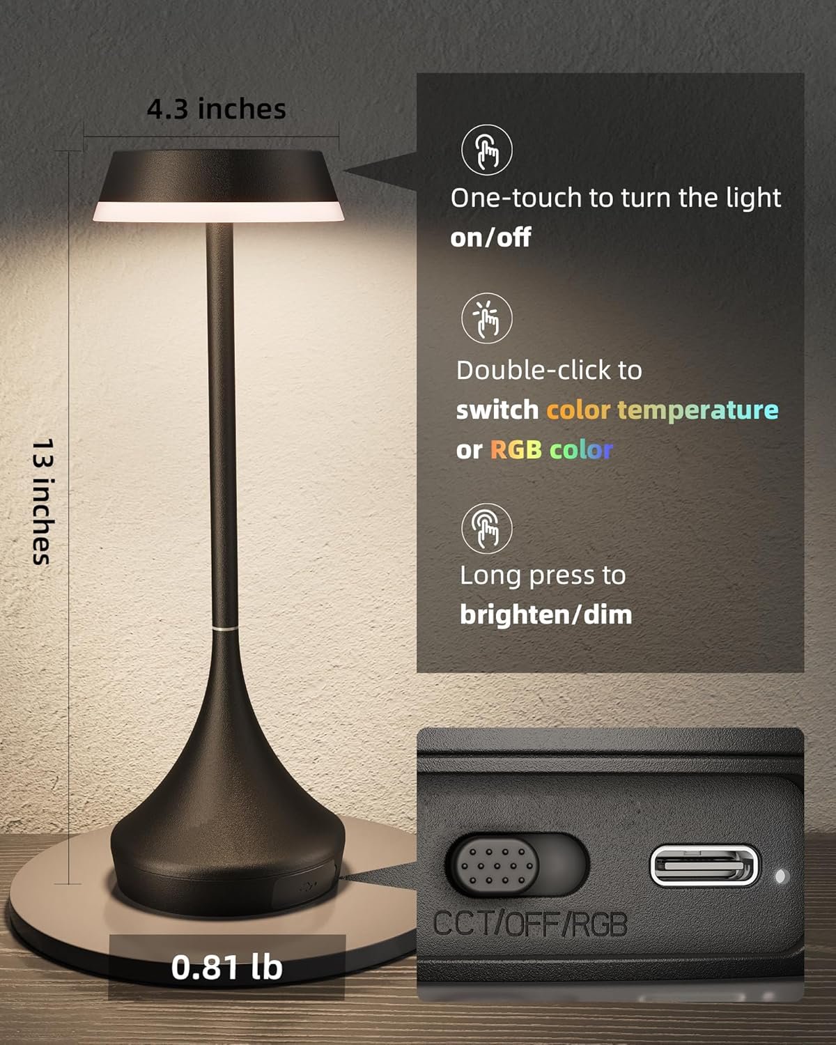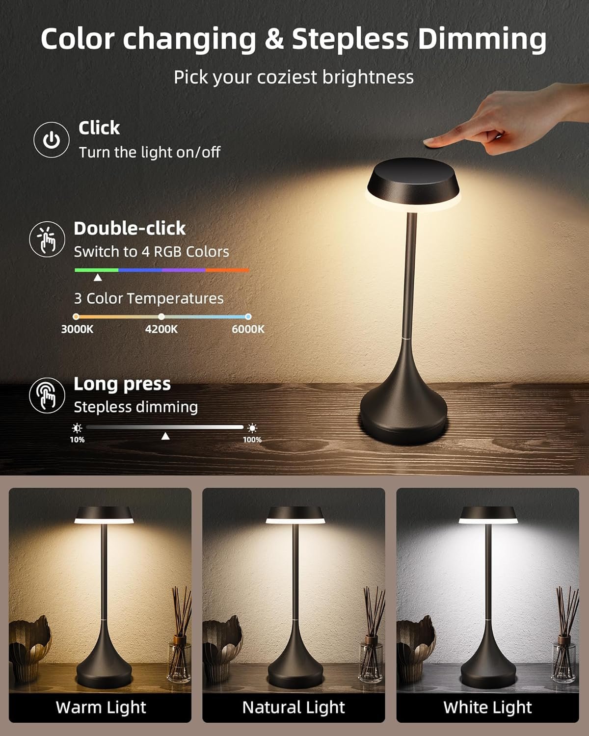Características especiales: Cambio de color, Color ajustable de temperatura, Inalámbrico y portátil, Recargable, Regulable