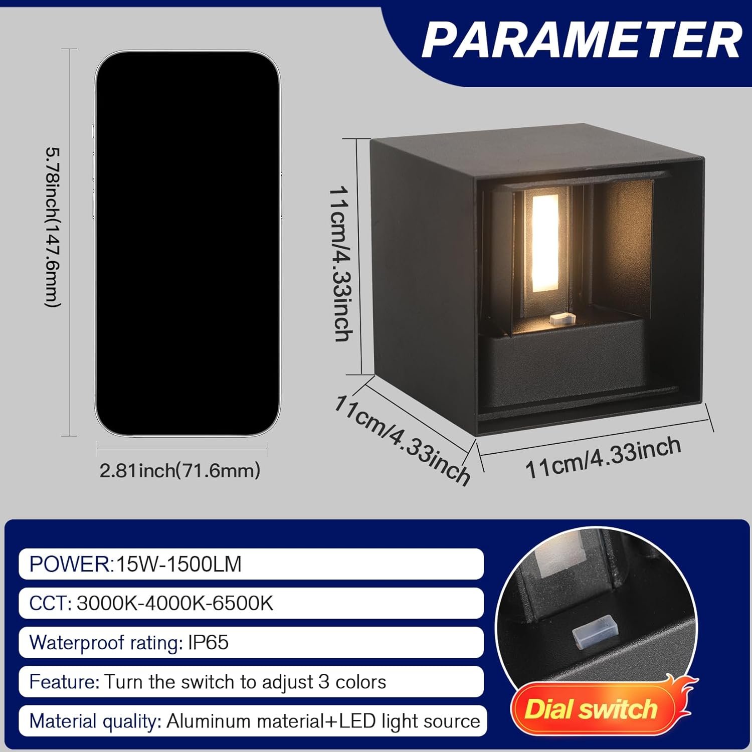 Especificaciones del producto : luces de pared para exteriores de 3 colores ajustables, potencia LED de 15 W, tamaño de cubo cuadrado 11,0 cm x 11,0 cm x 11,0 cm, lumen 1300 lm, clasificación impermeable IP65, voltaje AC85-265V.50/60HZ, ángulo de luz ajustable de 0-120° girando el deflector interior, las lámparas de pared de aluminio impermeables son adecuadas para Luz decorativa interior y exterior Posee simultáneamente 3 efectos de iluminación diferentes. Diseño de 3 colores ajustables : Luces LED de pared Ajuste tres colores de iluminación (3000K/4000K/6500K) a través del botón de palanca en la lámpara de pared. Diseño moderno y simple, el ángulo de luz de 120° se puede ajustar hacia arriba y hacia abajo para lograr una variedad de efectos de iluminación, haciendo que la luz sea más artística; la pantalla cuadrada es extraíble, fácil de limpiar en el interior; IP65 impermeable y resistente al polvo, segura y confiable, uso amplia gama de entornos y fácil instalación. Material : Lámpara de pared de aluminio impermeable IP65 para exteriores, con cuerpo de lámpara de aluminio de alta calidad, recubrimiento en polvo, anticorrosión y antioxidante; cuentas de lámpara LED de ahorro de energía y respetuosas con el medio ambiente, luz brillante y uniforme, sin estroboscópico, almohadilla de goma impermeable integrada; fuente de luz no reemplazable, hace que la vida útil sea más larga y la impermeabilización al aire libre es más segura. Amplia gama de aplicaciones : la iluminación LED de pared es muy adecuada para la instalación de paredes de casas al aire libre e interior, como patios, escaleras, pasillos, salas de estar, jardines, porches, parques, balcones, patios, etc. Elija instalar en diferentes escenas para crear un ambiente artístico hermoso y cálido. Apliques de pared de alta calidad: las luces de pared para exteriores han pasado la prueba de certificación ETL. Cumple con las normas de seguridad ETL y el voltaje y la fuente de alimentación cumplen con las especificaciones. Los accesorios de instalación e instrucciones se adjuntan en el paquete, adecuado para caja de conexiones estándar, fácil de instalar.