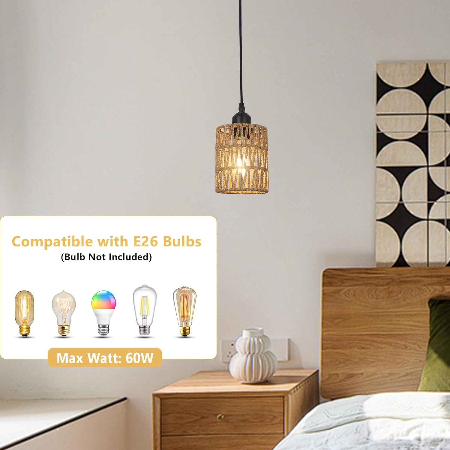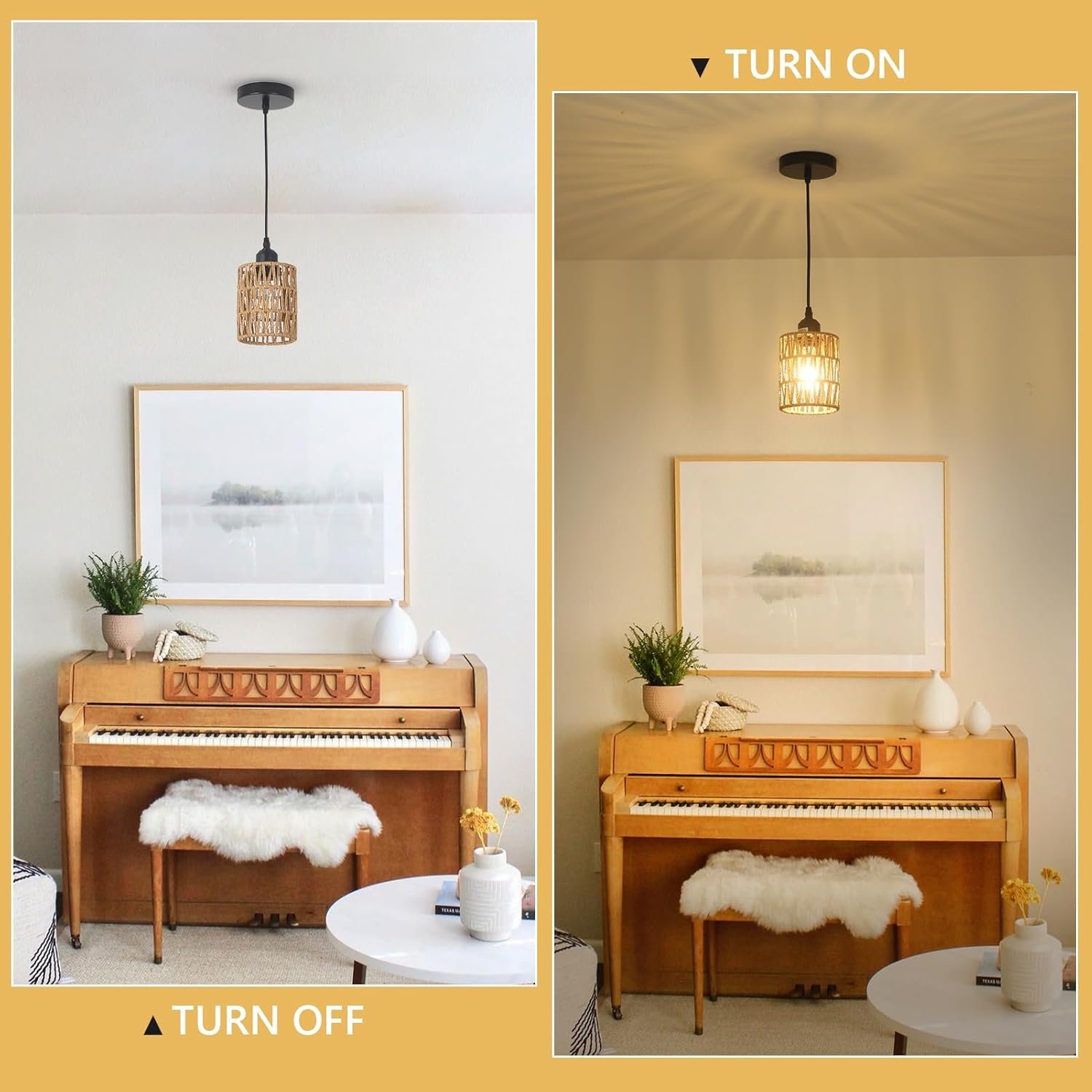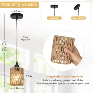 Diseño único y belleza natural Esta lámpara colgante de ratán tiene una pantalla de ratán natural 100% tejida a mano, que es más segura, más ecológica y estable. La lámpara colgante boho combina perfectamente con estilos de hogar de granja, bohemio, vintage e industrial, añadiendo un elemento natural a la decoración de tu hogar. Cuando las luces colgantes de la isla de cocina están encendidas, la luz del abat-jour proyecta un patrón muy hermoso en la pared. Dimensión y amplias aplicaciones La pantalla de la lámpara colgante estilo granja tiene un diámetro de 11,9 cm y es ajustable en altura desde 24,9 cm hasta 154,9 cm. El diámetro del toldo es de 11,9 cm. Disponible para techos planos o inclinados. Ya sea que instales esta lámpara de techo de ratán colgante en un pasillo, entrada, vestíbulo, sala de estar, dormitorio, porche, cocina, armario o como lámpara de comedor sobre mesa, será el punto focal de tu hogar y es tanto acogedor como hermoso. Seguro y requisitos de bombilla El enchufe de bombilla E26 para esta lámpara colgante de mimbre ha pasado la certificación UL, lo que te da más seguridad en el uso de las lámparas colgantes. Esta iluminación colgante es compatible con bombillas incandescentes/de filamento vintage/halógenas/LED, y una potencia máxima de 60W. Puedes elegir diferentes estilos de bombillas y temperaturas de color para crear diferentes atmósferas. (bombilla no incluida) Instalación Fácil La estructura general de la lámpara colgante tejida es muy simple, y el cableado y el enchufe están construidos con materiales y circuitos premium, un uso verdaderamente de alta calidad durante mucho tiempo. Esta lámpara colgante individual incluye todos los accesorios de montaje e instrucciones para una instalación rápida y fácil. ¡Puedes completar fácilmente la instalación de las luces colgantes mini boho en solo unos minutos! Servicio satisfactorio LAMSU proporciona servicio postventa para problemas de calidad de la lámpara colgante de cocina. Si tienes alguna pregunta sobre nuestra pequeña lámpara colgante o tienes algún problema al instalar esta lámpara colgante, comprueba el número de pedido y haz clic en cmContactar con el vendedor cm para ponerte en contacto con nosotros. ¡Resolveremos su problema en 24 horas y protegeremos sus derechos!