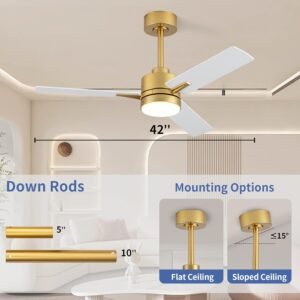 Ventiladores de techo con luces de 6 velocidades Tres tamaños y estilos de ventiladores de techo satisfacen tus diversas necesidades, desde dormitorios hasta salas de estar, estos ventiladores de techo de perfil bajo son perfectos tanto para uso interior como exterior, lo que los convierte en una opción versátil para cualquier espacio. Ventilador de techo dorado con luz ¡Decora tu hogar con nuestro ventilador de techo! Esto no solo puede brindarle frescura y comodidad, sino que la colisión entre blanco y negro y dorado también puede agregar un toque único a su hogar. Ventiladores de techo con control remoto Todas las operaciones se pueden controlar con el control remoto, ajusta la velocidad del ventilador con 6 niveles, selecciona la temperatura del color de la luz desde Blanco Cálido (3000K) hasta Luz Natural (4500K) hasta Blanco Frío (6000K), y soporta apagado programado (1/4 hora) para dormir, encendido/apagado. El ventilador y la luz se pueden encender por separado. Diseño libre de ruido para durmientes ligeros Equipado con un motor CC, el volumen es bajo a 30 dB cuando el ventilador está funcionando, te brinda un sueño cómodo con un ambiente de vida silencioso. Servicio al cliente Si tienes problemas, consulta el manual de usuario o ponte en contacto con nosotros a través de los detalles del pedido de Amazon.