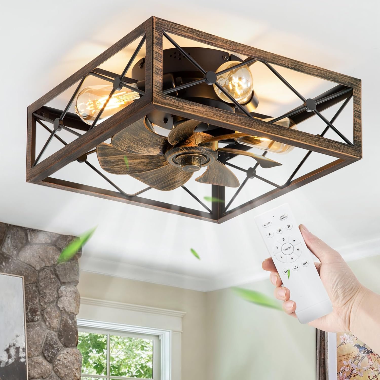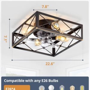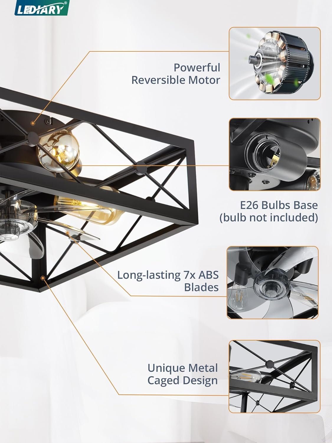 Diseño de jaula cuadrada: el ventilador de techo de granja cuenta con un diseño único de jaula cuadrada de metal negro, y el patrón de intersección en la jaula añade un toque artístico a este ventilador de techo rústico. El pequeño ventilador de techo se adapta bien a la mayoría de los espacios, complementando perfectamente dormitorios, cocina y salas de estar, aportando una rica mezcla de estilos industriales y rústicos a la decoración de tu hogar Control remoto simple: el control remoto silencioso funciona sin ningún pitido, asegurando una comodidad silenciosa sin molestar a tu familia. Maneje fácilmente 5 características clave con el control remoto: 6 velocidades de viento, modo reversible, temporizador de 1/2/4 horas, modo de viento natural y controle el ventilador o la luz por separado, proporciona una notable comodidad Motor CC reversible silencioso: el modo reversible mantiene las cosas cómodas durante todo el año: en verano, sopla aire hacia abajo para mayor frescura, y en invierno, hace circular el calor empujando el aire hacia arriba. El motor DC de cobre puro funciona sin problemas, ahorrando energía mientras ofrece un potente flujo de aire con niveles de ruido bajos de menos de 35dB, creando un ambiente de sueño cómodo Fácil de montar: el ventilador de techo enjaulado cuenta con una estructura mejorada y es fácil de montar e instalar. Sigue simplemente el manual para la autoinstalación: toma alrededor de 15 minutos y puede ahorrarte el costo de contratar a un electricista. El ventilador de techo negro es compatible con bombillas E26 (bombillas no incluidas). Puedes elegir bombillas con tu temperatura de color y brillo preferidos para crear el ambiente que desees Compra con confianza: LEDIARY ofrece 5 años de garantía para el motor y 2 años de servicio para otras piezas de nuestro ventilador de techo fandaliers. Valoramos los comentarios de nuestros clientes y estamos comprometidos a proporcionar una gran experiencia de compra. Si encuentras algún problema con nuestros productos, no dudes en hacernos saber