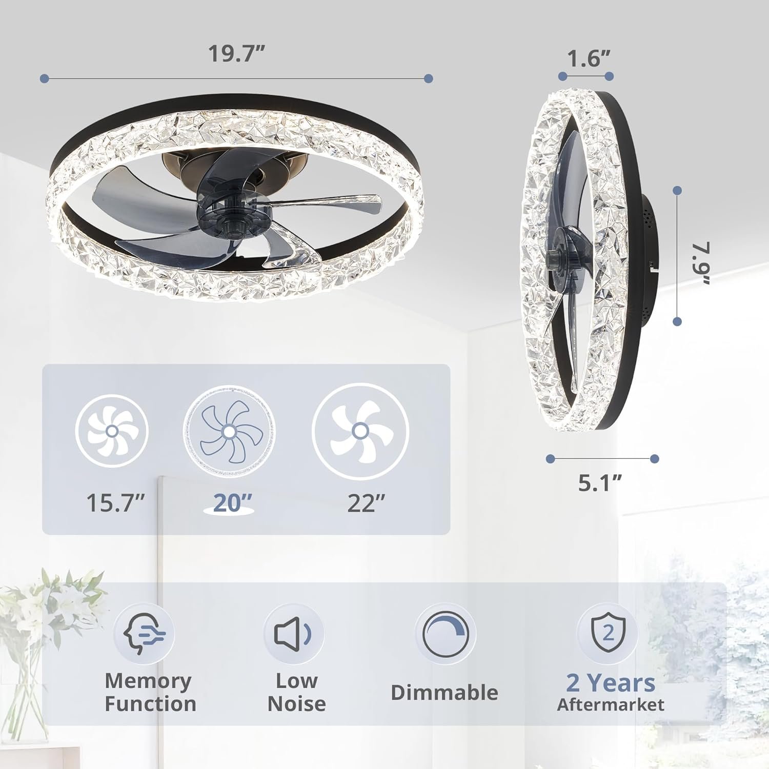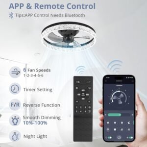 Especificación: Control remoto, 5 aspas, 3570 lúmenes, salida de voltaje de 110, motor reversible, configuración de temporizador de 1/2H, 6 velocidades de ventilador, temperatura de color seleccionable de 3000K-6500K, atenuación suave del 10% al 100% Control remoto y control por aplicación: Este ventilador de techo de perfil bajo con luz tiene 6 velocidades de ventilador y configuraciones de temporizador de sueño (2H) que facilitan mantener el nivel de comodidad ideal. Los usuarios pueden elegir fácilmente y cómodamente la velocidad del viento y la luz deseadas a través del control remoto. Consejos: el control de la aplicación requiere Bluetooth Motor reversible y ventilador silencioso: nuestro ventilador de techo negro proporciona 2 modos de flujo de aire: funciona con flujo de aire frío descendente durante el verano y flujo de aire ascendente durante el invierno para ayudar a hacer circular el aire caliente, promoviendo la circulación del aire y ahorrando energía. El motor de cobre puro funciona sin problemas, proporciona una fuerte potencia de viento y el diseño de bajo ruido crea un ambiente de vida cómodo y mejora la calidad del sueño Atenuación continua y temperatura de color: puedes personalizar fácilmente tu brillo del 10% al 100% con 3570 lúmenes de alto brillo. También puedes elegir la temperatura de color de cálido (3000 K) a blanco (6500 K) a través del control remoto. Cuando se desactiva, se memorizarán todas las configuraciones. La próxima vez que se encienda, la temperatura del color y el brillo de la última vez que se apagó permanecerán sin cambios Compra con confianza: nuestros ventiladores de techo con control remoto proporcionan soporte de 2 años. Si tienes algún problema, por favor ponte en contacto con nuestro servicio postventa, siempre estamos listos para atenderte