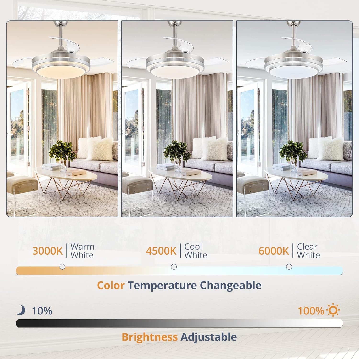 Iluminación LED regulable y con temperatura de color intercambiable: nuestro ventilador de techo tiene muchas opciones de iluminación, puedes cambiar la temperatura del color de cálido (3000K) a blanco (6500K), personalizar tu brillo del 10% al 100%. La iluminación LED mejorada de 40 W ahorra más energía y es suave Motor reversible y cuchillas retráctiles de 106,7 cm: nuestro ventilador de techo retráctil se puede utilizar en modos de verano e invierno, promoviendo la circulación de aire y ahorrando energía. Este ventilador de techo retráctil viene con un cuerpo de níquel cepillado y aspas transparentes de 106,7 cm Control remoto multifunción: nuestro moderno ventilador de techo con luz tiene 6 velocidades de ventilador y temporizador de sueño (1/2/4/8 H), también es fácil cambiar la temperatura de color y ajustar el brillo con el control remoto. Cuando se apaga, se memorizarán todas las configuraciones Motor CC potente y silencioso: Hecho de acero de silicona y cobre, lo que hace que la calidad sea estable. Tiene 6 velocidades de selección. El motor DC de 30W ofrece un potente flujo de aire con un rendimiento silencioso. Altamente eficiente energéticamente, hasta un 70% menos de potencia que el motor de CA Compra con confianza: tu satisfacción es nuestra máxima prioridad. Ofrecemos 2 años de atención al cliente. Si tienes un problema con tu compra, por favor díganos y trabajaremos contigo para resolver el problema