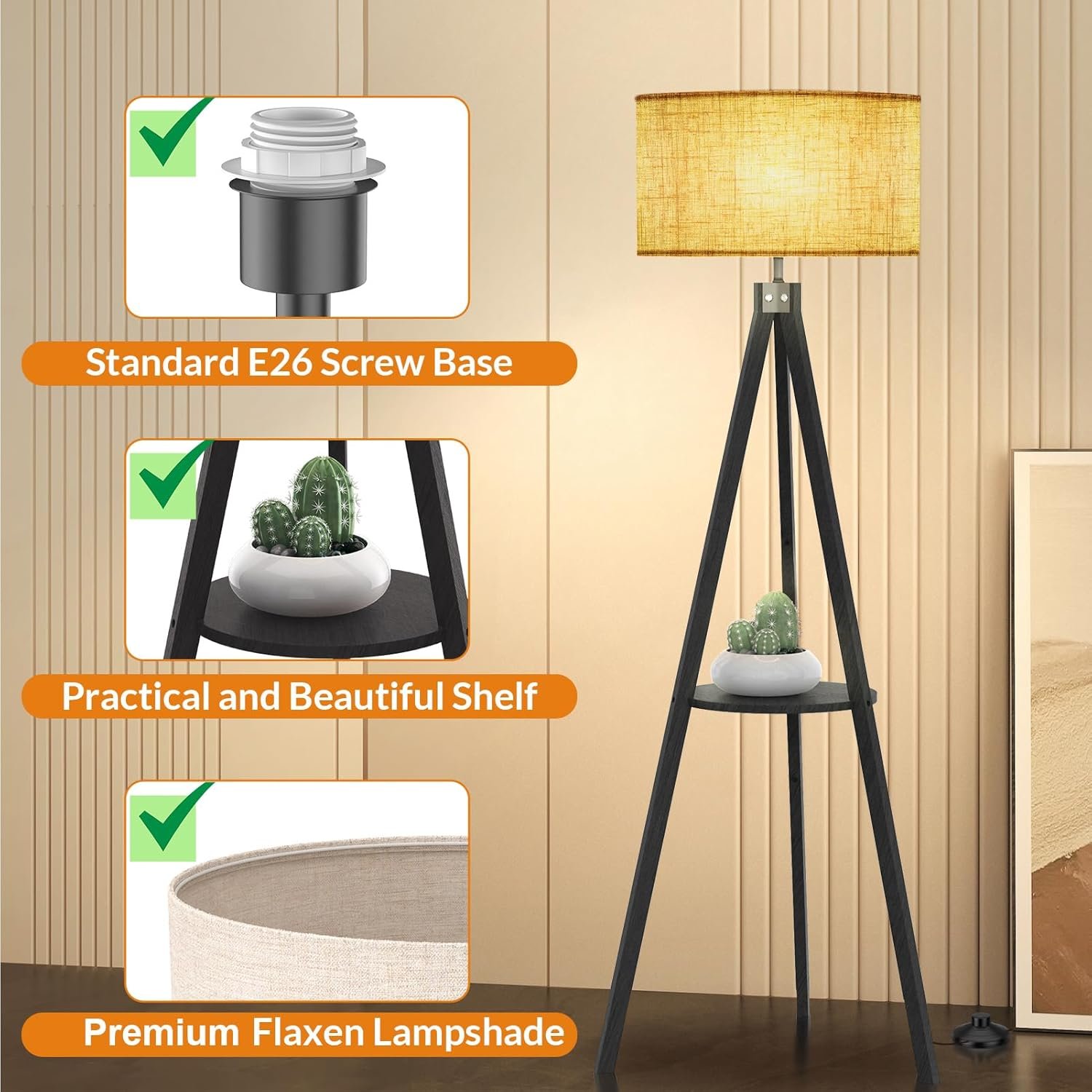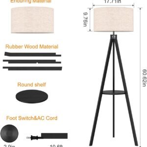 Diseño elegante: La lámpara de pie de trípode de madera LEPOWER se adapta a arquitecturas modernas, en particular decoraciones vintage, retro, de mediados de siglo o tradicionales. Tiene un vástago único con tres patas de madera que hace que la lámpara sea lo suficientemente estable. Su pantalla de lámpara de lino redondeada se ve hermosa y moderna en casi cualquier habitación de tu hogar u oficina Material de primera calidad: la lámpara está integrada con un trípode de madera de goma de caucho natural de alta calidad, que es duradero, firme y estético. Su diseño resistente lo hace libre de temblores y seguro. La luz cálida crea un ambiente cómodo y relajante, ideal para sala de estar, oficina, habitación de los niños Lámpara de pie con estante: proporciona el estante para almacenar libros/plantas o mostrar arte. Selecciona esta lámpara y podrás disfrutar de una adición elegante a tu dormitorio principal con una luz de acento para crear ambiente. O coloca esta lámpara de pie alta detrás / junto al sofá de la sala de estar para leer Requisitos de luz: La luz no está incluida en el paquete. Con una base de rosca de tamaño E26, la luz se puede instalar como se desee. Para obtener un mejor efecto de iluminación, le sugerimos utilizar luz LED 10 W-12 W, luz de ahorro de energía 12 W-20 W, luz incandescente 40 W-60 W (60 W MAX) Interruptor de pie de encendido/apagado: un interruptor de pie convenientemente ubicado en el cable de la pantalla de la lámpara para un uso rápido y fácil. Consejos: Debes montar las patas de la lámpara y la pantalla de la lámpara por ti mismo. Durante el ensamblaje, por favor evite dejar caer el difusor de la lámpara, y evite el ensamblaje violento o tiradas violentas