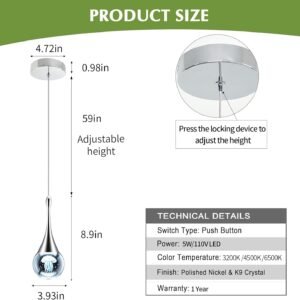 Diseño único de medusa: esta lámpara colgante de cristal cuenta con tecnología avanzada de grabado láser para crear un hermoso diseño de medusas 3D con un tono cromado que crea un ambiente simple pero encantador donde sea que se instale. La forma única del accesorio nunca pasará de moda. Perfecto para una variedad de ambientes Diseño para el cuidado de los ojos: esta lámpara colgante LED cuenta con una solución de cuidado ocular cuidadosamente diseñada, utilizando tecnología LED de vanguardia para eliminar completamente el parpadeo. La lámpara emite una luz suave y sin parpadeo sin radiación infrarroja o ultravioleta, protegiéndote del deslumbrante deslumbrante deslumbrante Amplia aplicación: equipada con una línea ajustable de 121,9 cm, esta lámpara colgante de medusa ofrece una personalización de altura sin esfuerzo para adaptarse a cualquier espacio. Su diseño versátil lo convierte en una opción impecable para una variedad de entornos, ya sea adornando una isla de cocina, mejorando un comedor, añadiendo encanto a un baño, iluminando un pasillo, elevando un bar, complementando un restaurante o iluminando una escalera Fácil instalación: estas mini luces colgantes para isla de cocina son simples y fáciles de instalar, con todos los accesorios y manuales de instalación incluidos en el paquete. La instalación no es difícil, y definitivamente vale la pena. Si tiene alguna pregunta, envíenos un correo electrónico Especificaciones: Potencia: 5 W; Voltios: 110-220 V; Flujo luminoso: 400 lm; temperatura de color: 3 color; tamaño del producto: 9,9 cm de diámetro x 22,8 cm de alto. CRI hasta 80, lo que resulta en una alta reproducción cromática