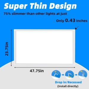 Atenuación ultrafina y suave : Tamaño de la luz de panel plano LED de 2 x 4: 121,3 cm x 60,3 cm x 1,1 cm. Nuestra lámpara de techo LED de 2 x 4 es uitral-delgada, que utiliza chips de alto lumen para una iluminación óptima, asegurando una iluminación cómoda y el máximo brillo sin parpadeo, deslumbramiento o ruido no deseado. El brillo de las luces LED de techo de 2 x 4 pies se puede atenuar de 0 a 100% con un interruptor de atenuación LED de 0 a 10 V (atenuador no incluido). Fácil instalación y 3 opciones de montaje : las luces de panel empotradas con borde empotrado de 2 x 4 son fáciles de instalar, con clips de montaje diseñados en ambos lados y agujeros de cable de seguridad en cada clip, que se pueden instalar fácil y de forma segura en techos de rejilla estándar. 3 opciones de montaje: empotrado (instalar directamente), montaje suspendido y en superficie (los accesorios relacionados deben ser comprados por usted mismo). Ahorro de energía y larga vida útil: la lámpara LED de oficina de techo de 2 x 4 está hecha de fuente de alimentación de alta calidad y aluminio de alta calidad, lo que puede ayudar rápidamente a las luces a disipar el calor de manera efectiva, prolongando así la vida útil. La luz LED de panel plano de 2 x 4 puede reemplazar la luz de la parrilla y dura 10 veces más que las lámparas fluorescentes. Grado comercial y amplia aplicación : la luz LED de panel de techo de 2 x 4 5000 K es excelente para 0ffices, lugares comerciales y minoristas, escuelas e instituciones educativas, instituciones médicas, iluminación residencial, industrias industriales y de fabricación, hoteles, bares, restaurantes, cafeterías. Seguridad y certificación ETL : nuestra luz LED de 2 x 4 de luz diurna de 5000 K está certificada profesionalmente por ETL con un rango de voltaje de 110-277 voltios, lo que garantiza la seguridad, el rendimiento ambiental y la eficiencia energética.