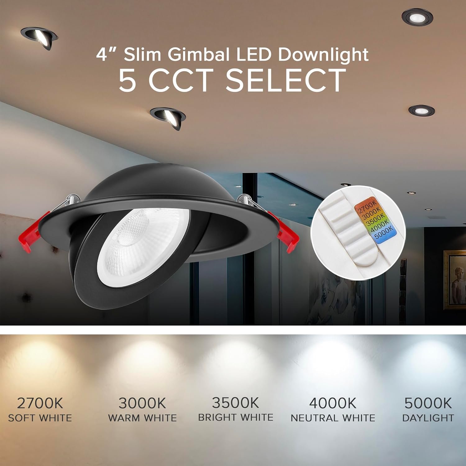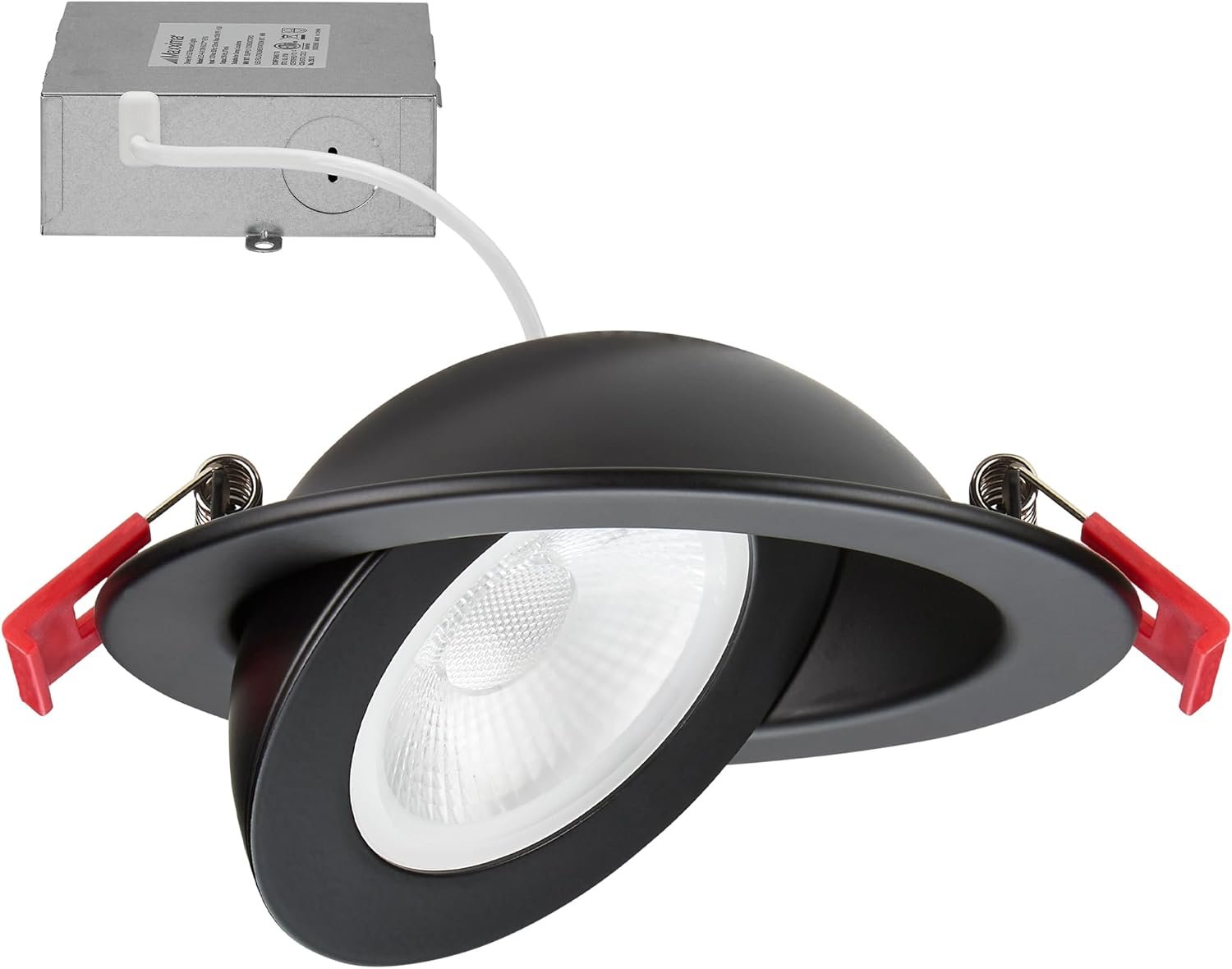 5 CCT Select de 2700K/3000K/3500K/4000K/5000K le permite elegir entre blanco suave, blanco cálido, blanco brillante, blanco neutro y luz diurna utilizando fácilmente el interruptor en el cable. Esta luz empotrable direccional negra tiene un ángulo de rotación de 360° con una inclinación de 90° que te permite inclinar fácilmente esta luz para iluminar lo que necesites. Este cardán tiene un ángulo de haz de 38° 12W equivalente a 65W. Este cardán flotante delgado consume menos energía de la que consumiría una luz tradicional, lo que te permite ser más eficiente energéticamente y ahorrar dinero. Salida de luz de 850 lúmenes que proporciona iluminación en toda la habitación. Esta luz con clasificación húmeda es ideal para salas de estar, dormitorios, cocinas, estudios, baños, pasillos y mucho más. También es adecuado para instalaciones comerciales. Este accesorio giratorio está hecho con un cuerpo de aluminio fundido y lente de policarbonato que lo hace ligero pero resistente. La fuente de alimentación y la caja de conexiones están incluidas. Las dimensiones de la caja J son 10,7 cm de ancho x 3,3 cm de largo con una longitud de cable desde el accesorio hasta la caja de jbox de 41,9 cm. Las dimensiones del panel delgado son de 12,7 cm de profundidad x 3,8 cm de alto con un borde de 1,8 cm de ancho. Rango regulable de 10 a 100% que te permite elegir el brillo adecuado para tu espacio con una clasificación CRI de 90 para una reproducción precisa del color. Clasificación IC, 120 VAC, ETL, 3 años de garantía No se necesita lata ni alojamiento, se instala directamente en el techo con clips. Instale J-Box en la viga del techo e inserte la luz directamente en la abertura del panel de yeso. Junta de espuma incluida para aplicación hermética.