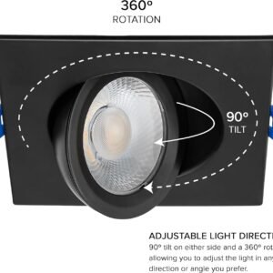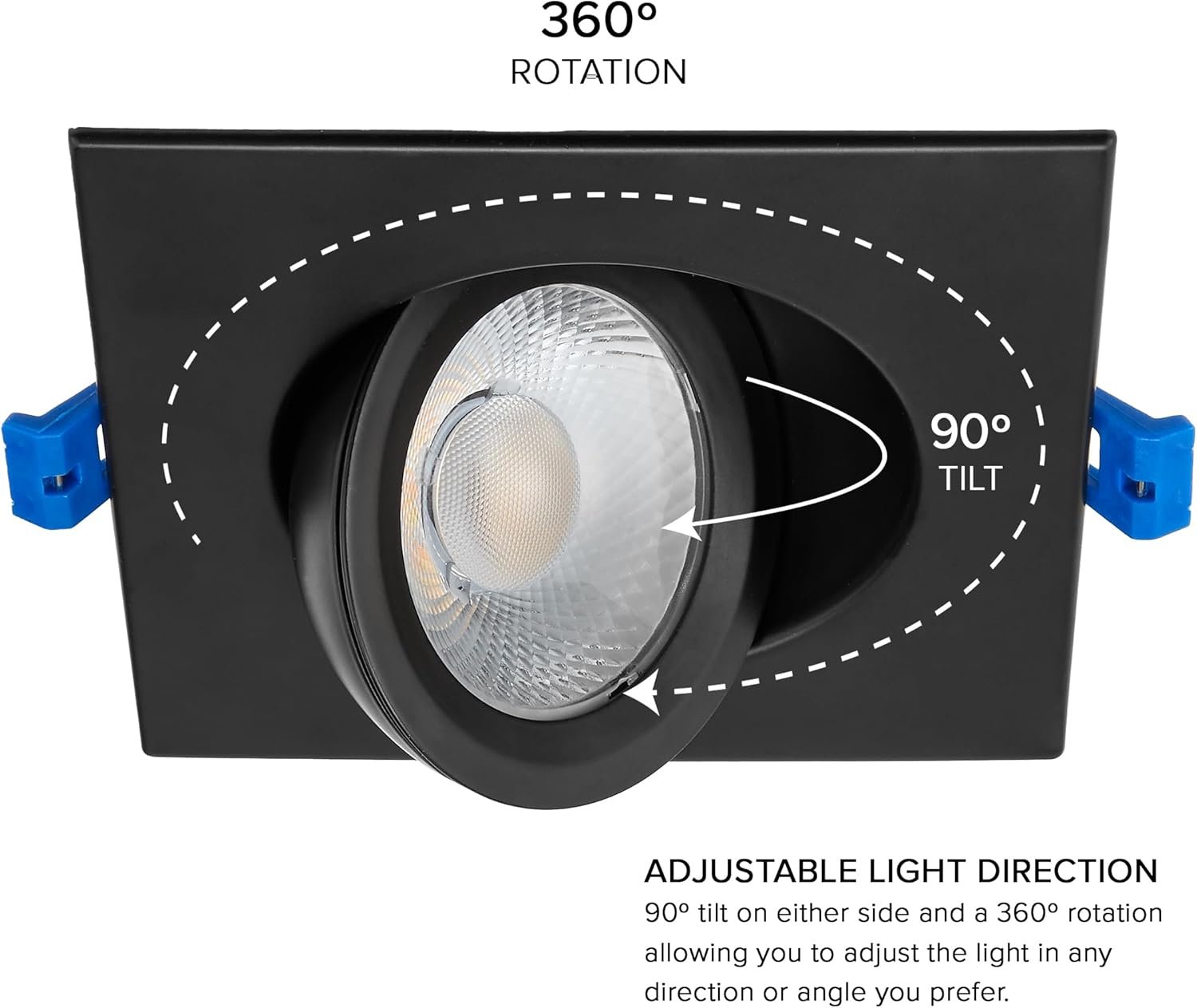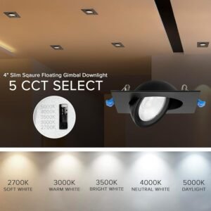 5 CCT Select de 2700K/3000K/3500K/4000K/5000K le permite elegir entre blanco suave, blanco cálido, blanco brillante, blanco neutro y luz diurna utilizando fácilmente el interruptor de la fuente de alimentación. Esta luz empotrable direccional negra tiene un ángulo de rotación de 360° con una inclinación de 90° que te permite inclinar fácilmente esta luz para iluminar lo que necesites. Este cardán cuadrado tiene un ángulo de haz de 50° 10W equivalente a 65W. Este cardán flotante delgado consume menos energía de la que consumiría una luz tradicional, lo que te permite ser más eficiente energéticamente y ahorrar dinero. Salida de luz de 1000 lúmenes que proporciona iluminación en toda la habitación. Esta luz con clasificación húmeda es ideal para salas de estar, dormitorios, cocinas, estudios, baños, pasillos y mucho más. También es adecuado para instalaciones comerciales. Este accesorio giratorio está hecho con un cuerpo de aluminio fundido y lente de policarbonato que lo hace ligero pero resistente. La fuente de alimentación y la caja de conexiones están incluidas. Las dimensiones de la caja J son 10,2 cm de largo x 6,9 cm de ancho x 3,6 cm de alto con una longitud de cable desde el accesorio hasta la caja de conexiones de 36,2 cm. Las dimensiones del panel delgado son 12,4 cm de largo x 12,4 cm de ancho x 3,4 cm de profundidad