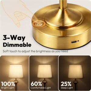 Diseño único: esta lámpara de mesa portátil inalámbrica combina un aspecto moderno y vintage con una base minimalista y pantalla de tela, y está hecha de aluminio duradero con un acabado galvanizado, ofreciendo un aspecto suave y texturizado que añade elegancia y sofisticación, por lo que es atemporal. La base de silicona antideslizante evita resbalones y vuelcos accidentales, su acabado de metal contemporáneo y luz cálida y acogedora crean un ambiente romántico y elegante, por lo que es una adición única a cualquier habitación, especialmente aquellos con un estilo de decoración de granja. Además, es un excelente regalo para amigos, seres queridos y familiares Batería recargable integrada: la lámpara de escritorio inalámbrica LED está equipada con una batería recargable de 5200 mAh, se carga completamente en solo 4-6 horas. Proporciona más de 15 horas de uso con un brillo máximo y hasta 50 horas en un ajuste más bajo. Un práctico indicador de carga muestra una luz roja mientras se carga y una luz verde brillante completa cuando está completamente cargada. Cable USB-C incluido, compatible con una entrada de 5 V/2 A. (*Para garantizar la salud de la batería del producto, utiliza un cargador de 5 V/2 A y un cable de datos para cargar!!!) Regulable de 3 vías y control táctil: lámpara de mesa inalámbrica portátil NIORSUN con tres ajustes de brillo, puedes cambiar el brillo de la iluminación de acuerdo a tus diferentes necesidades. Smply cambia la intensidad de la luz tocando el botón de encendido, secuencialmente para lograr el brillo deseado. Toque corto para cambiar el brillo de 3 vías (100%/60%/25%). El ajuste más bajo se puede utilizar como luz ambiental o luz nocturna. El ajuste más alto es adecuado para lectura de escritorio o mesita de noche. Puedes cambiar el brillo de la iluminación de acuerdo a tus diferentes necesidades. Iluminación cálida de 2700 K: las lámparas recargables inalámbricas NIORSUN funcionan con una bombilla de filamento LED E26 DC5V de 2700 K de bajo consumo, 2 vatios de potencia, 250 lm, duran más de 10.000 horas. Más brillante que otros similares. Sin parpadeo, agradable a los ojos. La pequeña lámpara proporciona una luz cálida suave y acogedora, perfecta para cualquier entorno. Las pantallas de lino y la luz cálida crean un rincón de lectura cálido que se mezclará bien con tus muebles. Lámpara inalámbrica portátil Alimentada por batería, sin cables que funcionar. Nuestra lámpara de mesita de noche funciona con pilas te proporciona la libertad de moverla donde necesites luz. Ya sea durante un breve corte de energía o para llevarla al aire libre para una noche acogedora, esta lámpara funciona con pilas es fácil y conveniente. Es perfecta para sala de estar, comedor, cocina, restaurante, dormitorio, estudio, dormitorio universitario, familia, etc.