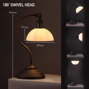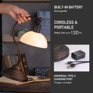 Portátil y conveniente: equipada con un puerto de carga USB-C para una fácil carga, esta lámpara está diseñada para ofrecer flexibilidad y se puede colocar donde se necesite luz sin depender de una toma de corriente. Brillo ajustable: Experimenta tres niveles de atenuación (20%, 50%, 100%) para adaptar la iluminación a tus necesidades específicas, perfecta para leer, relajarte o mejorar el ambiente. Batería de larga duración: Disfruta de hasta 120 horas de iluminación inalámbrica en el ajuste más bajo con una batería recargable incorporada, asegurando una luz confiable en cualquier lugar sin recarga constante. Cabezal giratorio de 180°: cuenta con un cabezal de lámpara ajustable de 180° para una dirección óptima de la luz, proporcionando iluminación enfocada para tareas detalladas, lectura o iluminación suave y difusa para un ambiente general. Diseño atemporal y versátil: elige entre elegantes tonos de cristal en verde o blanco o un tono de metal armonioso para que coincida con el clásico soporte curvado y la base, mejorando la estética de cualquier habitación.