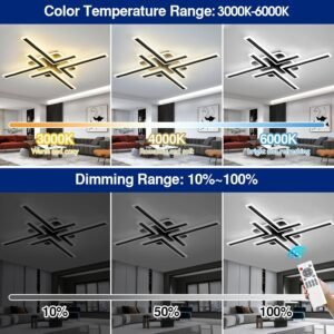 Diseño contemporáneo: esta lámpara de techo LED presenta una forma geométrica esbelta de Sputnik con un cuerpo de metal pintado duradero y resistente a la oxidación. La luz está fabricada con una pantalla acrílica transparente que no solo permite una alta transmisión de luz, sino que también es fácil de limpiar y resistente a altas temperaturas. Dimensiones: la lámpara de techo LED de montaje empotrado mide 87,0 cm de largo, 23,0 cm de ancho y 5,0 cm de alto. Su tamaño compacto lo hace adecuado para varios tamaños de habitaciones y alturas de techo. Perfectamente combina con tu sala de estar, comedor, cocina, dormitorio, baño, entrada, etc., oficina. Control remoto integrado y conectividad Bluetooth: la luz no solo viene con un práctico control remoto integrado, sino que también cuenta con conectividad Bluetooth para aún más opciones de control. Con el control remoto incluido, puedes ajustar sin esfuerzo la temperatura del color y el brillo de la luz. Elige entre una gama de temperaturas de color, de 3000 K a 6000 K, y ajusta el brillo de 0 a 100% para crear el ambiente de iluminación perfecto. Esta función inteligente te permite personalizar el ambiente de iluminación de acuerdo a tu preferencia. Fuente de luz LED de larga duración: La lámpara de techo LED está equipada con una fuente de luz LED confiable que tiene una larga vida útil. Esto no solo ahorra energía y reduce los costos de electricidad, sino que también proporciona una excelente reproducción del color, asegurando una iluminación vibrante y realista en su espacio. Fácil instalación y servicio al cliente: instalar la lámpara de techo LED es muy fácil, y viene con instrucciones claras y todo el hardware de montaje necesario. Además, el producto está respaldado por un excelente servicio al cliente, lo que garantiza que cualquier consulta de instalación o posterior a la compra se atienda de manera rápida y eficiente.