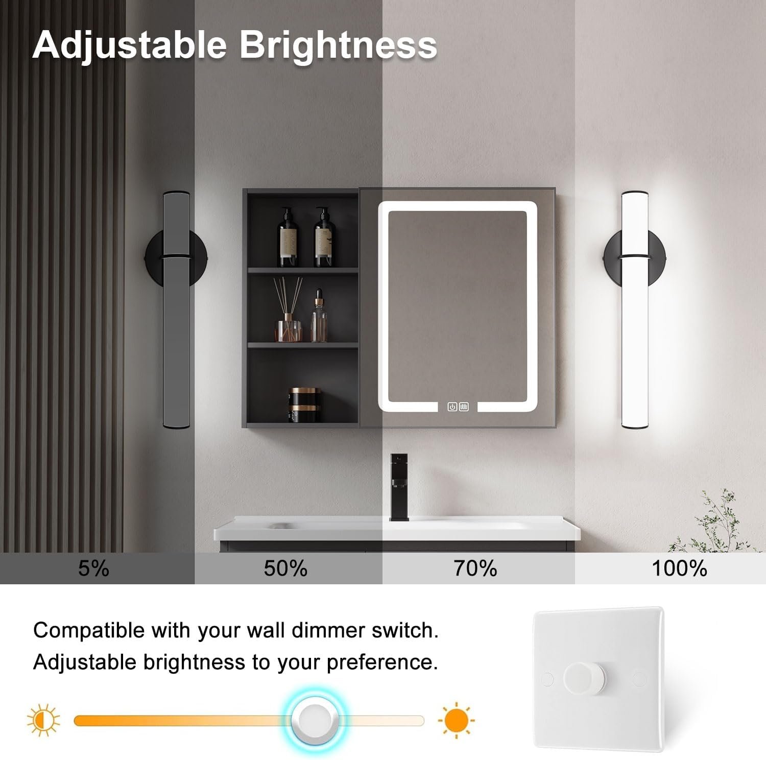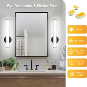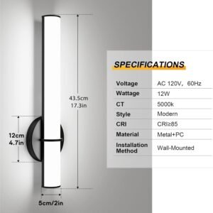 Brillo ajustable, luz de tocador de baño de ahorro de energía: lámpara de baño negra. Rango de atenuación de 0% a 100%, puedes ajustar la atenuación de luz según lo necesites, luz LED de tocador de alta calidad con larga vida útil. Bajar el brillo es una forma conveniente de ahorrar más energía cuando no necesita brillo completo. Diseño único y moderno: los accesorios de iluminación OOWOLF para tocador cuentan con un diseño sofisticado y moderno, añadiendo un nuevo toque elegante a la decoración de tu baño. Tiene una potencia de 12 W, tamaño: 43.5x12x5.5cm/17.1×4.7×5,6 cm, voltaje de entrada 120V 60HZ, CRI 85, 5000K blanco natural, conveniente para el maquillaje. Construcción de calidad: la lámpara de baño sobre el espejo está hecha de base de metal duradera y material de policarbonato de alta calidad (material ignífugo), que está sólidamente instalado y tiene una larga vida útil, y la seguridad está más garantizada. La lámpara de baño es fácil de limpiar, simplemente utiliza agua y una toalla limpia para limpiar suavemente el polvo. Fácil de instalar y ampliamente Proporcionamos diagramas de instalación detallados paso a paso para los accesorios de iluminación de tocador de baño, solo tienes que seguir las instrucciones para instalarlo, puedes terminar la instalación rápidamente, proporciona una iluminación sin picaduras y sin deslumbramiento. Las luces de tocador de baño son perfectas para usar como iluminación en baños, dormitorios, y se pueden utilizar en paredes de espejo, marcos de espejos, gabinetes de baño u otros muebles, es especialmente adecuado para maquillaje y vestidores. Servicio posventa de calidad: ofrecemos 2 años de servicio de calidad para accesorios de iluminación de tocador, si tienes alguna pregunta o inquietud sobre nuestro accesorio de iluminación de baño, no dudes en ponerte en contacto con nosotros, te responderemos en 24 horas para resolver tus problemas.