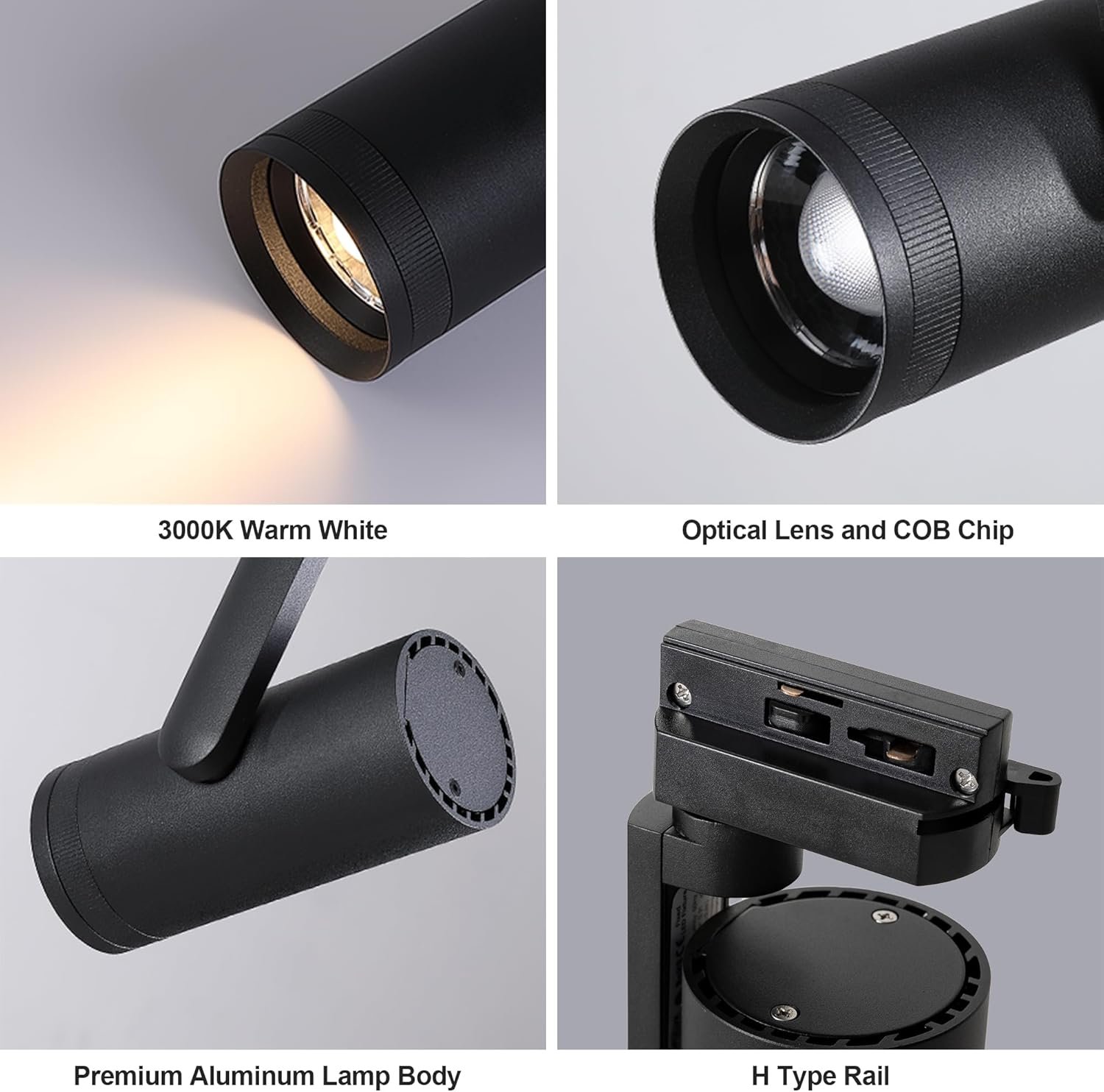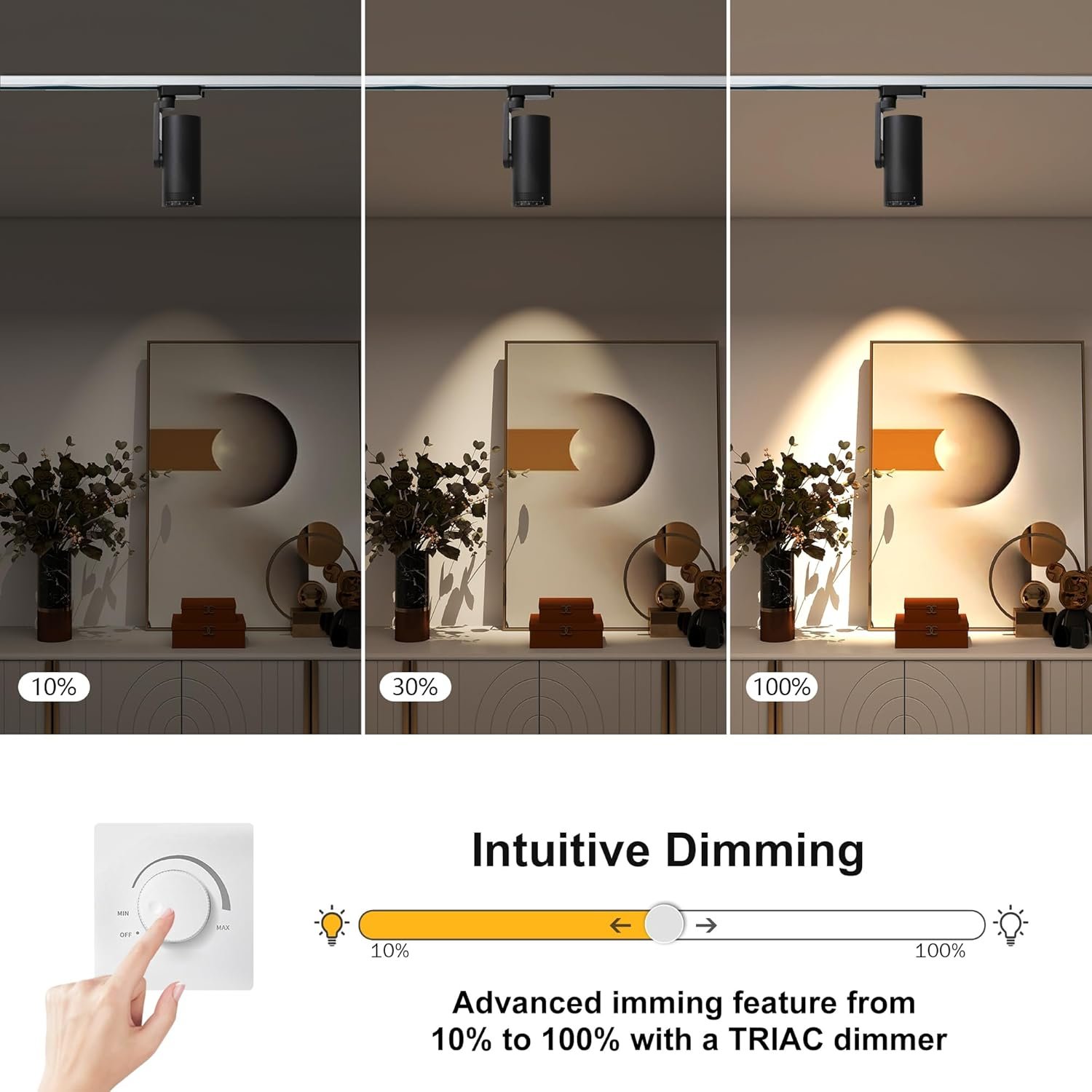 Atenuación suave: Totalmente regulable de 10% a 100% con atenuadores TRIAC. El LED de 12 W ofrece 1080 lúmenes (equivalente halógeno de 65 W) con un haz ajustable de 10° a 55°. Ajustable y elegante: Gire 350° horizontalmente e incline 90° verticalmente para apuntar la luz donde lo necesite. Fabricado con aluminio duradero de grado aeronáutico y acrílico elegante. Colores realistas: el alto CRI 97 y la luz sin parpadeo resaltan los colores naturales de tu espacio, sin zumbidos, sin fatiga ocular. Solo compatible con tipo H: Funciona solo con sistemas de orugas tipo H de circuito único. No compatible con pistas J o L. Pista no incluida. Larga duración y eficiente: dura más de 50.000 horas. Una gran actualización de halógeno: menos calor, facturas de energía más bajas y menos reemplazos.