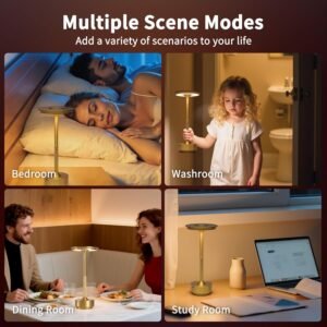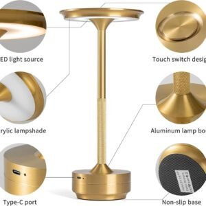 Control táctil y brillo ajustable: se enciende/apaga fácilmente y pasa por 3 temperaturas de color con un simple toque. Mantén presionado el interruptor táctil para ajustar el brillo del 10% al 100%, lo que te da un control total sobre tu iluminación. 3 modos de color para cada estado de ánimo: cambia entre blanco cálido, fresco y natural para que coincida con diferentes tareas o estados de ánimo, perfecto para leer, relajarse o trabajar. Larga duración de la batería con carga USB-C: la batería recargable incorporada de 5200mAh dura de 16 a 65 horas dependiendo del brillo. Se carga completamente en 4 a 6 horas con el cable USB tipo C incluido. Iluminación amigable con los ojos, sin deslumbramiento: cuenta con un diseño de luz hacia abajo y una pantalla acrílica que suaviza la luz y reduce el deslumbramiento, ideal para proteger sus ojos durante un uso prolongado. Diseño elegante y estable: fabricada con un cuerpo de aluminio dorado cepillado y base antideslizante, esta lámpara añade un toque de elegancia moderna a cualquier espacio mientras se mantiene firmemente en su lugar.