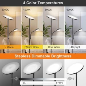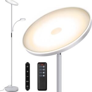 Función de control 2 en 1: nuestra moderna lámpara de pie tiene control remoto y táctil para controlar dos lámparas de forma independiente. Ambas lámparas te permiten ajustar cualquier brillo y 4 temperaturas de color (húmedo, blanco cálido, blanco frío y blanco luz diurna). El control remoto magnético se puede pegar al poste de metal, placa de pared o refrigerador, lo que hace que sea más fácil de llegar desde cualquier lugar (dentro de 32.8 pies). Compatible con interruptor de pared y enchufe inteligente, puedes convertirlo en una lámpara de pie inteligente. Super brillante y diferentes funciones: Construido en 126+28 LED de alto brillo, hasta 2400+400 lúmenes lámpara de pie de atenuación continua es suficiente para iluminar su sala de estar. La lámpara principal de 27 W ilumina sin esfuerzo toda la habitación y la lámpara lateral de 7 W con cuello de ganso flexible se puede ajustar libremente a diferentes direcciones, perfecta para cualquier tarea, como leer, trabajar o coser. Memoria y temporizador de 1 hora y larga vida útil: la lámpara de pie alta y brillante tiene una función de memoria para recordar tu último brillo y temperatura de color cuando vuelvas a encender la lámpara. Pulsa el botón táctil de encendido/apagado, el temporizador de 1 hora está ajustado y la lámpara se apagará automáticamente después de 1 hora. La lámpara de pie tiene una increíble vida útil de más de 50,000 horas, nunca tendrás que preocuparte por reemplazarla. Estable y seguro: la base ancha (24,9 cm de diámetro) y pesada (6.06 libras) proporciona estabilidad para el cuerpo de la lámpara, lo suficientemente sólida como para soportar la lámpara LED en posición vertical en cualquier caso. No tienes que preocuparte de que tus hijos o mascotas lo derriben. El cuerpo delgado de la lámpara se puede deslizar en esquinas estrechas, y su base se adapta debajo de la mayoría de sofás reclinables y sillas de lectura, ahorra mucho espacio. Además, nunca se sobrecalienta, por lo que no te quemarás cada vez que lo toques. Fácil de montar y usar: la lámpara de pie madre e hija es muy fácil de montar, no necesita herramientas, simplemente atornilla todas las secciones del poste de la lámpara siguiendo las instrucciones (idioma español no garantizado). El ajuste de dirección de los cabezales de la lámpara puede satisfacer tus diversas demandas para iluminar cada esquina que desees. El cabezal de la lámpara principal se puede girar hasta 350 grados y ajustar hacia arriba y hacia abajo hasta 85 grados. Y la lámpara de lectura lateral se puede doblar a 90 grados.