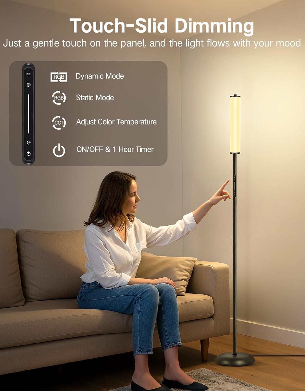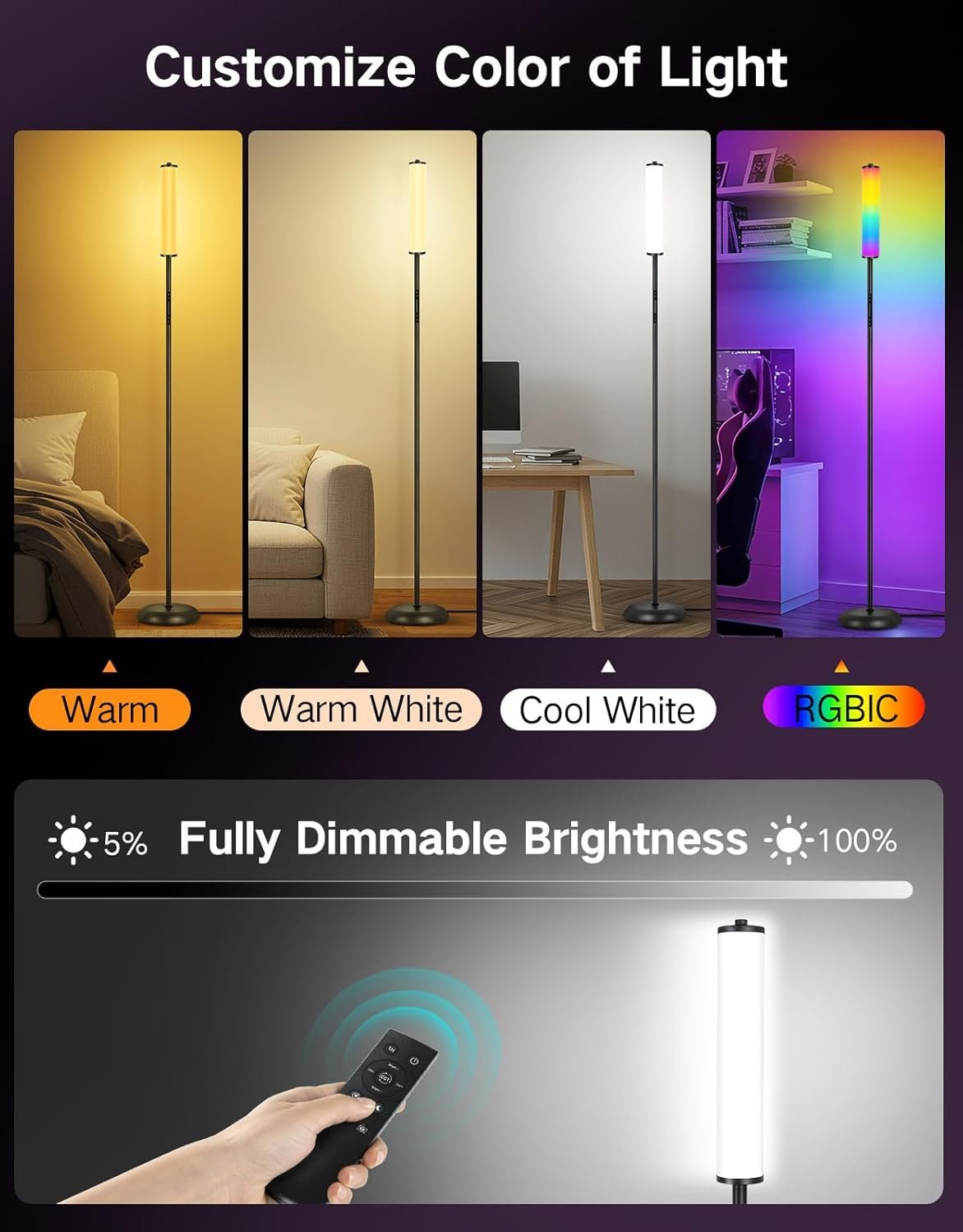Tecnología de atenuación táctil: el panel deslizante táctil OUTON redefine el control de iluminación. Con un simple gesto deslizante, puede ajustar con precisión la luz de esquina inteligente. Experimenta una respuesta instantánea en 0.1 segundos, lo que permite ajustes de brillo y temperatura de color. Imagina acurrucarte en el sofá, sin necesidad de levantarte para buscar el control remoto: solo un suave toque en el panel, y la luz fluye con tu estado de ánimo. Esta es la estética cálida y tecnológica que OUTON pretende ofrecer. Colores RGBICWW dinámicos y estáticos: Transforma tu espacio al instante con 24 vívidos efectos de lámpara de pie LED y 8 modos de color sólido, ofreciendo infinitas posibilidades para la iluminación ambiental. Ya sea que desees una iluminación vibrante y enérgica para fiestas, o un resplandor acogedor para noches de cine, esta lámpara de cambio de color es lo suficientemente versátil como para adaptarse a cualquier estilo. Perfecto para dormitorios, salas de estar, dormitorios, o espacios de entretenimiento, mejorando cada rincón con estilo. Función de control 3 en 1: controle esta luz de piso inteligente a través del panel deslizante táctil, el control remoto magnético incluido (no incluye pilas AAA) o la aplicación móvil para opciones de iluminación versátiles. El control remoto magnético se puede pegar a superficies de metal para un fácil acceso, y puedes cambiar los colores, ajustar el brillo, ajustar los temporizadores o cambiar los modos desde cualquier lugar dentro de los 50 pies, por lo que es perfecto para lámparas de pie para dormitorio, lámparas LED para sala de estar o cualquier rincón de tu hogar. Modo de sincronización de música: la tecnología de micrófono incorporada permite que la lámpara ambiental reaccione en tiempo real a tus canciones, películas o videojuegos favoritos. Elige entre 4 modos de ritmo para crear una experiencia dinámica e inmersiva que coincida con el ritmo, perfecta para fiestas, noches de juegos o para mejorar tu cine en casa. Esta luz de soporte de música añade un ambiente animado e interactivo, haciendo que tu sala de estar, dormitorio o sala de juegos sea instantáneamente más emocionante y visualmente atractiva. Iluminación versátil para cualquier estado de ánimo: Personaliza tu iluminación con ajuste de brillo sin escalones del 5% al 100% y un amplio rango de temperatura de color desde cálido 2200K hasta luz diurna 6500K. Los tonos cálidos son ideales para relajarse o descansar antes de acostarse, mientras que los tonos más fríos mejoran el enfoque para leer, trabajar u otras tareas. Esta lámpara de luces LED se adapta perfectamente a tus necesidades, proporcionando comodidad, funcionalidad y una solución de iluminación elegante para dormitorios y salas de estar. Diseño delgado y estable: Con una altura de 165,1 cm y un perfil elegante y delgado, esta luz de habitación encaja perfectamente en espacios pequeños o estrechos sin abarrotar la habitación. La base ponderada mide 22,9 cm de diámetro, asegurando estabilidad y seguridad incluso en hogares con mascotas y niños. Su diseño minimalista complementa los estilos de decoración moderna, ofreciendo una solución de lámpara de pie negra que ahorra espacio sin comprometer el estilo o la funcionalidad. Fácil de ensamblar y lista para regalar: Ensamble en minutos sin necesidad de herramientas, y disfrute de una lámpara de esquina alta para la sala de estar, construida para durar con una vida útil de LED de 50,000 horas. Empaquetado en una elegante caja de regalo, es un excelente regalo para inauguraciones de casa, cumpleaños, bodas o vacaciones. Esta lámpara alta y colorida es más que solo iluminación: es una pieza de decoración versátil para el hogar que proporciona comodidad, ambiente y conveniencia, mejorando cualquier sala de estar, dormitorio o espacio de estudio. Soporte de 12 meses y servicio al cliente 24/7: Estamos sinceramente dedicados a proporcionar a nuestros clientes satisfacción con nuestros productos y servicios. Estamos orgullosos de respaldar todos nuestros productos al 100% y ofrecemos un soporte de calidad de 12 meses. Ponte en contacto con nosotros primero en cualquier momento si tienes algún problema, ¡se proporcionará servicio al cliente 24/7! Podrás descansar tranquilo sabiendo que tu lámpara de pie tiene el respaldo en el que puedes confiar.