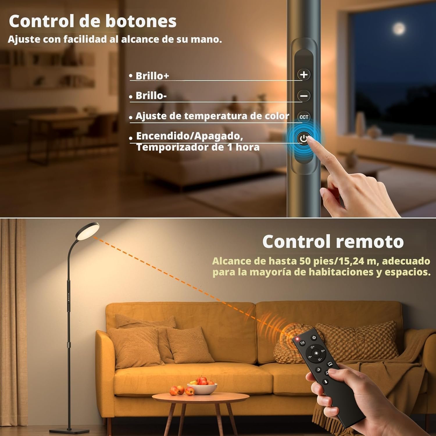 120 LED de alto brillo: equipada con 120 cuentas LED de alto brillo, la lámpara de pie PACOVY ofrece una potente salida de luz de 18W 1800LM, proporcionando una amplia cobertura de luz en un área amplia. La lámpara de pie LED ilumina eficazmente todo el espacio de trabajo, haciendo que actividades como el trabajo, la lectura, las manualidades, la costura y los rompecabezas sean fáciles y agradables. La luz es brillante y sin parpadeo, suave para los ojos, y no causa fatiga ocular incluso con un uso prolongado Ajuste flexible de altura y ángulo: el poste de la lámpara extensible le permite ajustar fácilmente la altura total, mientras que el diseño de cuello de cisne flexible de 360° permite que el cabezal de la lámpara gire a cualquier ángulo y posición, iluminando con precisión el área de trabajo para satisfacer las necesidades de iluminación de varias tareas detalladas Brillo ajustable y temperatura de color: las lámparas de pie para sala de estar y dormitorio admiten atenuación continua del 10% al 100%, ofreciendo una gama de iluminación de suave a brillante. La temperatura de color se puede ajustar entre 2700K blanco cálido a 6500K blanco frío, creando fácilmente diferentes atmósferas. La lámpara de pie cuenta con 5 modos preestablecidos (trabajo, lectura, ocio, cuidado, luz nocturna), con ajuste de un solo toque para satisfacer varios requisitos de escena, proporcionando una experiencia de iluminación ideal Características remotas e inteligentes: Equipado con un control remoto totalmente funcional con un alcance de hasta 50 pies/50.0 ft, lo que permite un fácil ajuste de los ajustes de luz. El control remoto magnético se puede fijar al poste de la lámpara de metal para un acceso cómodo y evitar pérdidas. También puede ajustar fácilmente los ajustes de uso común a través del control táctil. La función de temporizador permite el apagado automático sin tener que levantarse, y la función de memoria restaura automáticamente los últimos ajustes de luz utilizados Robusto y fácil de instalar: la base de metal sólido de alta resistencia está equipada con almohadillas antideslizantes para garantizar que la lámpara permanezca estable y resistente a la inclinación. El poste de la lámpara utiliza conexiones de rosca metálica, proporcionando una estructura apretada y resistente que evita que se afloje o se rompa. La lámpara de pie tiene una vida útil de hasta 50.000 horas, duradera y duradera. El diseño simple no requiere herramientas y se puede montar fácilmente en 2 minutos, ahorrando tiempo.