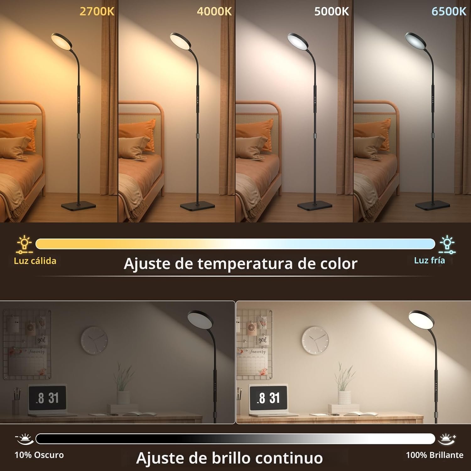 Beneficios del producto: High brightness, adjustable height & angle, stepless dimming, smart features