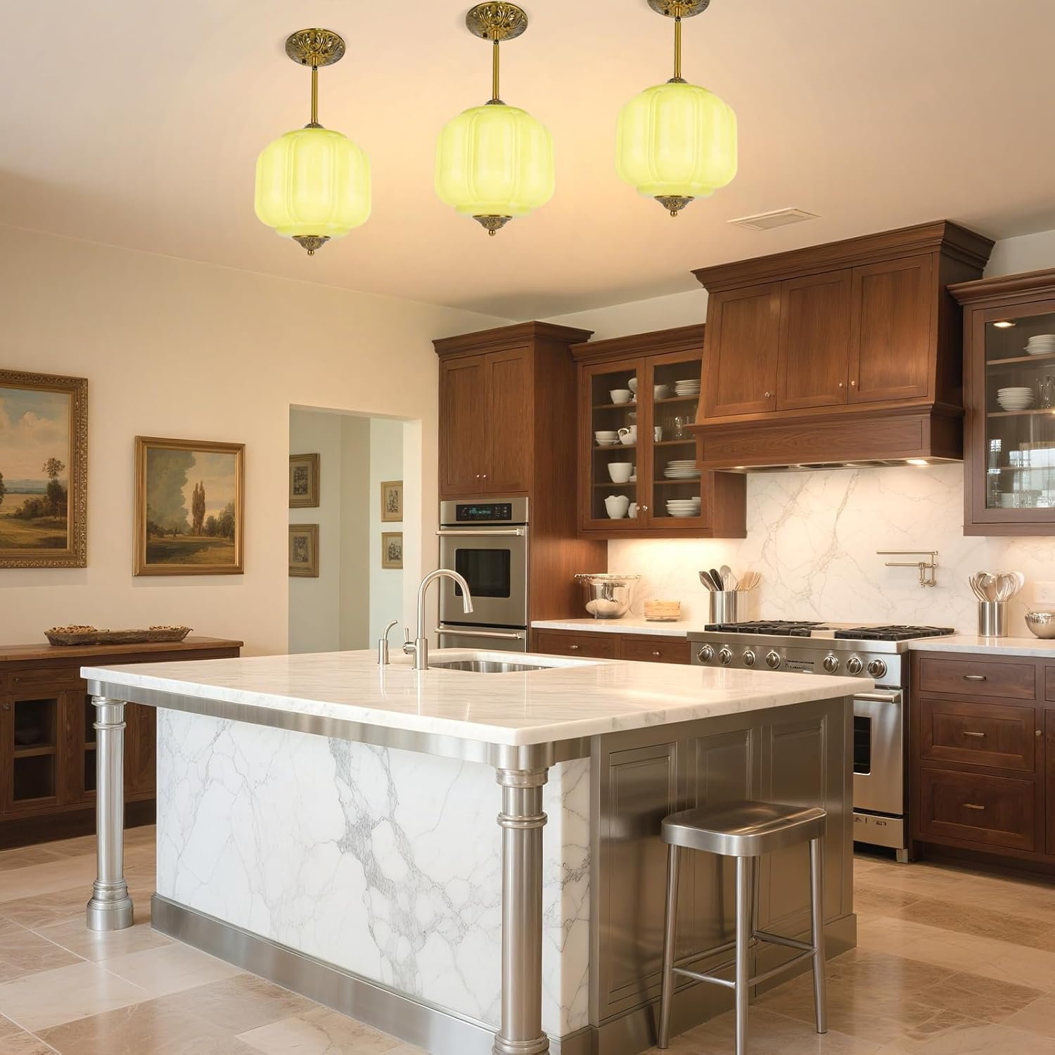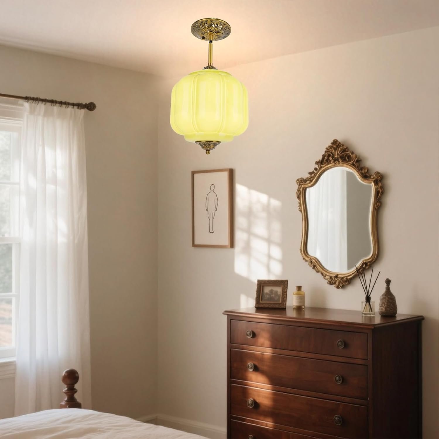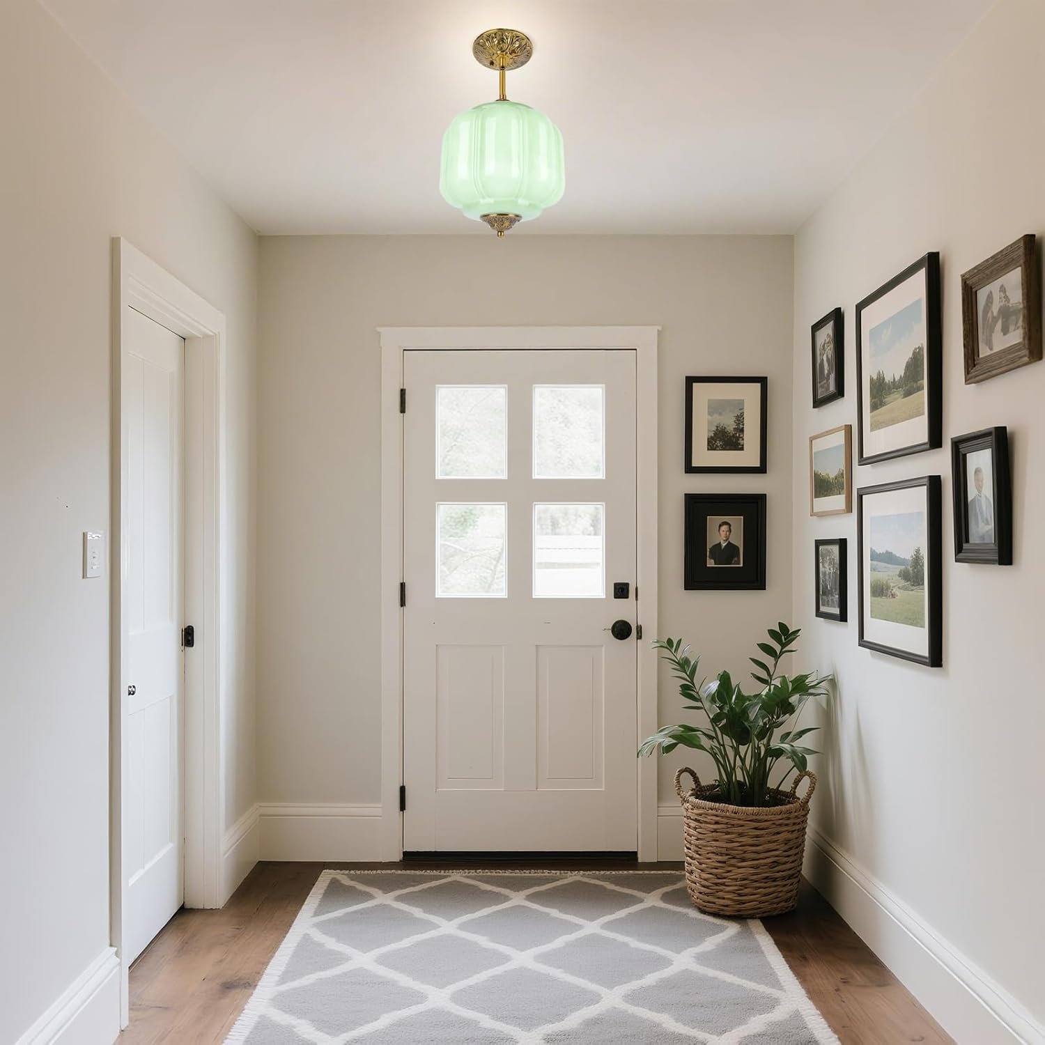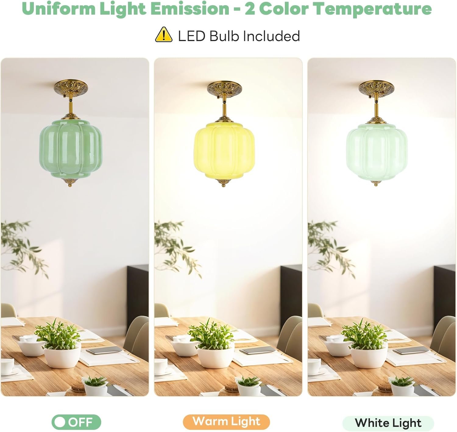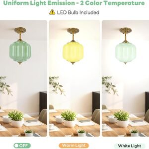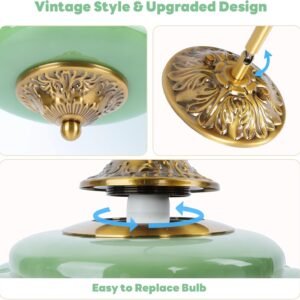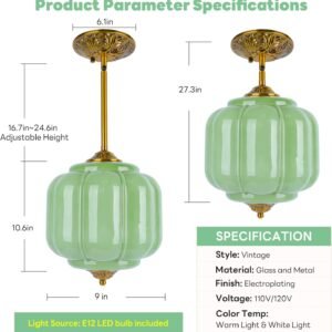 FIJACIONES DE LÁMPARA DE TECHO VINTAGE: Elegante lámpara de techo verde en forma de calabaza vintage con acabado en latón antiguo y dosel con intrincado patrón floral, perfecta para decoración de arte clásica y de mediados de siglo Foco fácil de reemplazar: nuestra lámpara colgante de cristal de leche verde mejorada cuenta con un sistema de reemplazo de bombilla fácil de usar con mecanismo giratorio para un acceso cómodo y una instalación simple, fácil de reemplazar la bombilla sin quitar toda la lámpara del techo BOMBA LED INCLUIDA: Ahorre tiempo y dinero al encontrar la bombilla correcta, nuestra luz de techo semi empotrada vintage incluye una bombilla LED E12 con opciones de luz cálida y luz blanca para un ambiente personalizable e iluminación uniforme ALTURA AJUSTABLE: Longitud de suspensión personalizable de 16.7 a 62,5 cm, una varilla de 30,0 cm y una varilla de 20,0 cm, con un dosel de 22,9 cm de ancho y un diámetro de copa de 15,5 cm para una instalación versátil AMPLIA APLICACIÓN: La lámpara de araña decorativa de vidrio de leche tiene un conector de poste de lámpara de dirección ajustable y es adecuada para sala de estar, comedor, vestíbulo, cocina, isla de cocina, dormitorio, pasillo, entrada, hotel, cafetería y una variedad de espacios interiores