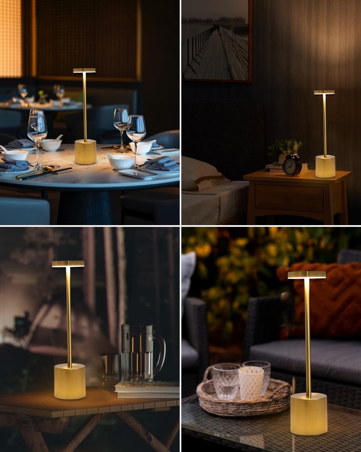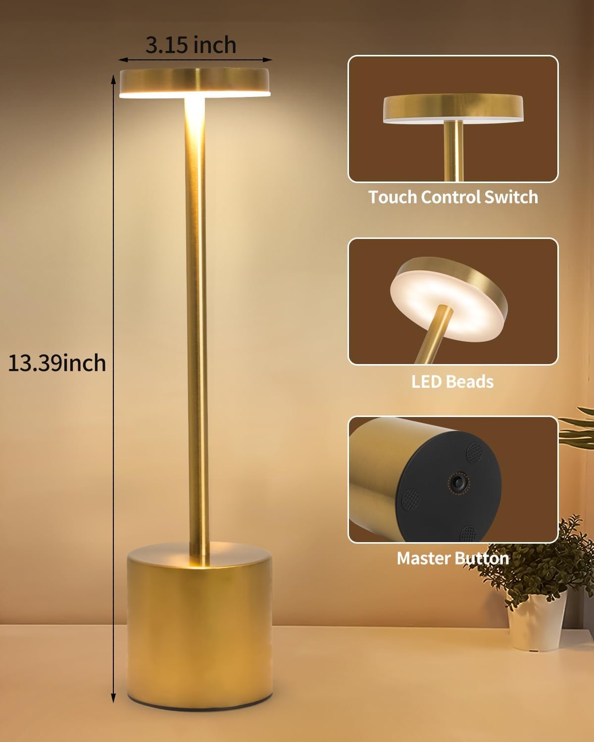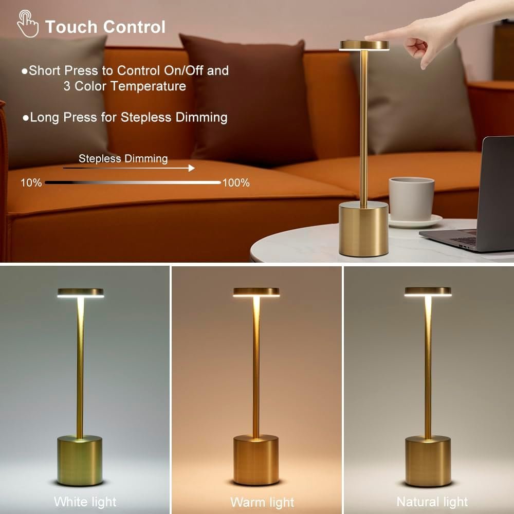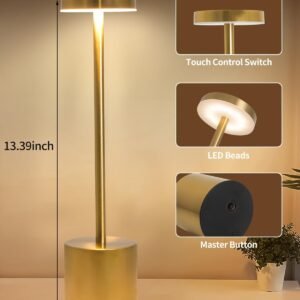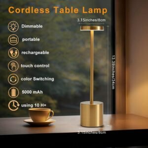 Portátil inalámbrico y recargable con batería integrada Esta lámpara de mesa LED recargable integrada se puede utilizar durante 15-45 horas después de 3-5 horas de carga completa (también se puede utilizar mientras se carga). Con sus baterías integradas, puedes colocar la lámpara táctil inalámbrica en cualquier lugar que desees, adecuada para exteriores, estudio, dormitorio, oficina, sala de estar, bar, habitación de hotel, restaurante, cafetería, etc. Lámpara portátil para exteriores impermeable profesional – Las lámparas inalámbricas para exteriores recargables con estructura completamente cerrada, que pueden resistir bien la penetración del agua. Después de pruebas estrictas, las lámparas de mesa inalámbricas recargables profesionales resistentes al agua garantizan funcionalidad completa incluso cuando llueve. Además, con su peso, las pequeñas lámparas de mesa inalámbricas recargables pueden ser a prueba de inclinaciones durante un viento repentino. Nunca tendrás que preocuparte por el uso al aire libre. 3 colores y brillo de atenuación continuo Temperatura de color: luz blanca cálida, luz cálida, luz blanca, rango de 3000 K-6000 K. Puedes tocar fácilmente el logotipo del interruptor en el acrílico en la parte superior del difusor. Permite cambiar fácilmente el modo de luz/Encender/Apagar haciendo clic y mantener presionado el interruptor para ajustar el brillo sin niveles (del 5% al 100%). Las lámparas recargables inalámbricas son una mezcla perfecta de encanto moderno y elegante, que son adecuadas para iluminación de cenas, reuniones familiares, campamento al aire libre, crean una noche romántica para ti. Diseño moderno y minimalista – Estas lámparas de batería para el hogar sin cables presentan un diseño redondo simple con luces LED súper brillantes dispuestas en un círculo para una iluminación de 360 grados. El material general es de metal con proceso de recubrimiento mate. Resistente a los arañazos. El diseño antideslizante inferior utiliza silicona suave para proteger la parte inferior de resbalones. Después de pruebas profesionales, la vida media de la lámpara de mesa con batería Simisand puede alcanzar hasta 50,000 horas. Lámpara de mesa LED de ahorro de energía y protección ocular: las lámparas de mesa inalámbricas funcionan con pilas emiten luz uniforme y suave, sin parpadeo, sin deslumbramiento, menos sombra, lo que puede aliviar eficazmente la fatiga ocular y proteger tus ojos, lámpara de mesa ideal inalámbrica para dormitorio, dormitorio universitario, etc. Estas lámparas inalámbricas para mesas con 70 piezas LED de alto brillo incorporadas son de solo 5 W, lo que podría ayudarnos a ahorrar más energía que la lámpara tradicional. Servicio posventa – Simisand ofrece 365 días de servicio gratuito de reemplazo, esperamos que puedas obtener la mejor experiencia de compra. Si tu lámpara de mesa tiene algún defecto o deja de funcionar durante este período, te ayudaremos a solucionar problemas o enviarte un nuevo producto.