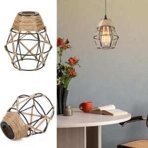 Dimensiones de la pantalla de mini lámpara: Esta pequeña pantalla de lámpara es adecuada para accesorios de luz E27. Nota: Antes de comprar, comprueba las dimensiones antes de comprar para un ajuste adecuado. Estilo de apariencia boho: elegante mini lámpara colgante combinada con cuerda de cáñamo tejida a mano y jaula de metal rústica, ¡muy vintage y elegante! El lampara hará que tu habitación esté llena de romance misterioso y artístico. Material premium: Estas pantallas de lámpara están hechas de cuerda de papel de calidad y un marco de hierro resistente, combinando elegantemente estilo y durabilidad. Nunca tendrás que preocuparte por el óxido, la corrosión o la decoloración. Una actualización elegante para hogares tradicionales y modernos por igual. Amplia aplicación: Estas pantallas de lámpara de ratán se combinan fácilmente con el estilo de decoración del hogar, creando un ambiente cómodo y atractivo. Ampliamente utilizado para sala de estar, dormitorio, entradas, cocinas, restaurantes, bares, pasillos, talleres y mucho más. Elección Ideal de Pantalla de Lámpara: Puede usarse como pantallas de lámpara de repuesto para lámparas de pie, bombilla colgante, araña, lámparas de isla, apliques de pared, etc. Ideal para sorprender a familiares y amigos en la inauguración del hogar, o decorar tu propia casa.
