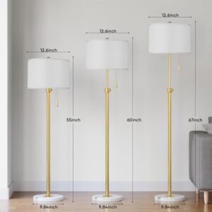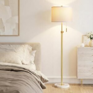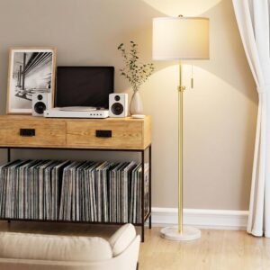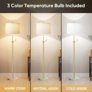 Diseño elegante: con un elegante tallo dorado y una pantalla blanca nítida, esta lámpara de pie añade un toque de elegancia moderna a cualquier habitación. Su diseño versátil y que ahorra espacio lo convierte en una pieza de decoración funcional perfecta para tu sala de estar, dormitorio u oficina Altura ajustable: personaliza tu iluminación ajustando la altura de esta lámpara alta de 55 a 167,6 cm. Esta flexibilidad te permite dirigir la luz perfectamente, por lo que es una lámpara de sala ideal para colocar detrás de sofás o junto a sillas de lectura Base de mármol premium: diseñada para una máxima estabilidad, esta moderna lámpara de pie cuenta con una base de mármol de alta calidad. Proporciona una base resistente y antivuelco, asegurando una mayor seguridad para hogares con niños o mascotas mientras eleva la estética de tu hogar Lámpara de pie de 3 temperaturas de color: Esta lámpara de pie incluye una bombilla LED de 9 W con 3 modos de color distintos: 2700 K (blanco cálido) para un ambiente acogedor, 4000 K (blanco natural) para tareas cotidianas y 5000 K (blanco frío) para lectura o trabajo enfocado. Cambia fácilmente entre modos para adaptarse a cualquier actividad Operación Simple y Clásica con Cadena de Tracción: Opera tu lámpara de pie para el dormitorio con facilidad usando el intuitivo interruptor de cadena de tracción. Este diseño ofrece un control de encendido/apagado sencillo y confiable, proporcionando una experiencia de iluminación sin complicaciones