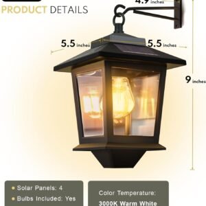 Ahorro de energía y carga de alta velocidad : esta lámpara de tamaño de porche al aire libre se puede utilizar como un aplique de pared para estilizar un porche, terraza, patio, áreas de garaje y mucho más. Luces de pared colgantes de larga duración recargables por cuatro paneles solares integrados, que pueden absorber más energía solar. La batería tiene una gran capacidad de 2000mAh. Coloque la lámpara solar bajo la luz solar directa para cargar la batería por completo. La carga durante 6-8 horas puede iluminar durante 8-12 horas. (El mal tiempo puede afectar el tiempo de iluminación) Antióxido y resistente a la intemperie : las luces solares de pared están hechas principalmente de vidrio templado para mayor durabilidad con carcasa decorativa para proporcionar una hermosa iluminación alrededor de tu hogar. La superficie está cubierta con pintura de grado exterior, función anti-UV especialmente añadida y proceso de pulverización utilizado, mejora el nivel antidecoloración y antienvejecimiento. La avanzada clasificación de impermeabilidad IP44 protege contra el vapor de agua y el polvo, por lo que es ideal para uso en exteriores. Respetuoso con el medio ambiente y sensor de encendido/apagado automático : las linternas solares colgantes para exteriores son completamente alimentadas por energía solar, lo que no solo ahorra energía y son respetuosas con el medio ambiente, sino que también son rentables sin facturas de electricidad adicionales. Bombillas reemplazables adicionales incluidas en el juego, no solo hacen que sea posible durar más tiempo, sino que también hace que el producto sea más efectivo. Sensor del atardecer al amanecer para mantener la luz apagada durante el día mientras se carga y se enciende automáticamente en la oscuridad o por la noche. Fácil de instalar : instalación rápida e indolora sin necesidad de cableado con soportes y tornillos incluidos. Se puede montar prácticamente en cualquier lugar utilizando los soportes de instalación incluidos. El diseño único para colgar permite que cada linterna funcione como luces portátiles. También se puede utilizar en tus ganchos de pastor o gancho para plantas. Hay un interruptor en la cubierta de la luz, enciéndelo la primera vez. Aplicación flexible : nuestros apliques de pared son ideales para cualquier entorno al aire libre con construcción de metal resistente de primera calidad y cuatro paneles solares, se pueden utilizar en aplicaciones de múltiples escenas, no solo se limitan a la pared, pueden estar debajo del árbol, tienda de campaña, etc. Tamaño de medición: 5.5 (L) * 5.5 (W) * 9 (H) cm