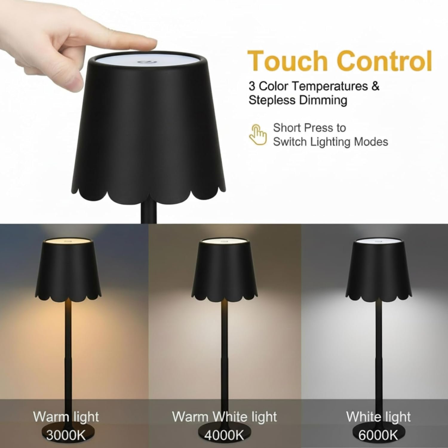 Elegante Pantalla de Lámpara Festoneada: estas 2 pantallas de lámpara festoneadas presentan un diseño único de borde festoneado con un tono blanco suave; la encantadora silueta crea un elegante punto focal que complementa varios estilos de decoración, desde modernos hasta costeros Diseño relajante de la lámpara azul claro: nuestra lámpara ofrece un ambiente elegante con su acabado azul calmante; también se puede montar en 2 alturas de lámparas (36,8 cm y 22,9 cm) de acuerdo a tus necesidades. Esta lámpara recargable es adecuada para mesa de comedor, mesa de Mahjong, cocina, sala de estar, dormitorio para crear una atmósfera romántica Lámpara de mesa LED blanca eficiente: esta lámpara de mesa LED blanca cuenta con tecnología LED de bajo consumo con 3 temperaturas de color; la función de atenuación continua permite ajustar el brillo del 5% al 100% para un buen control de la iluminación Prácticas lámparas de mesa inalámbricas: estas lámparas de mesa auxiliares inalámbricas cuentan con carga USB-C y portabilidad completa; colócalas en cualquier lugar sin restricciones de toma de corriente mientras mantiene una estética limpia y sin cables en tu espacio Versátil funcionalidad de la lámpara de mesa blanca: esta lámpara de mesa blanca funciona sin cables con una batería recargable integrada de 4000 mAh; disfruta de 8 a 10 horas de uso continuo con una sola carga, por lo que es ideal para cortes de energía o uso al aire libre