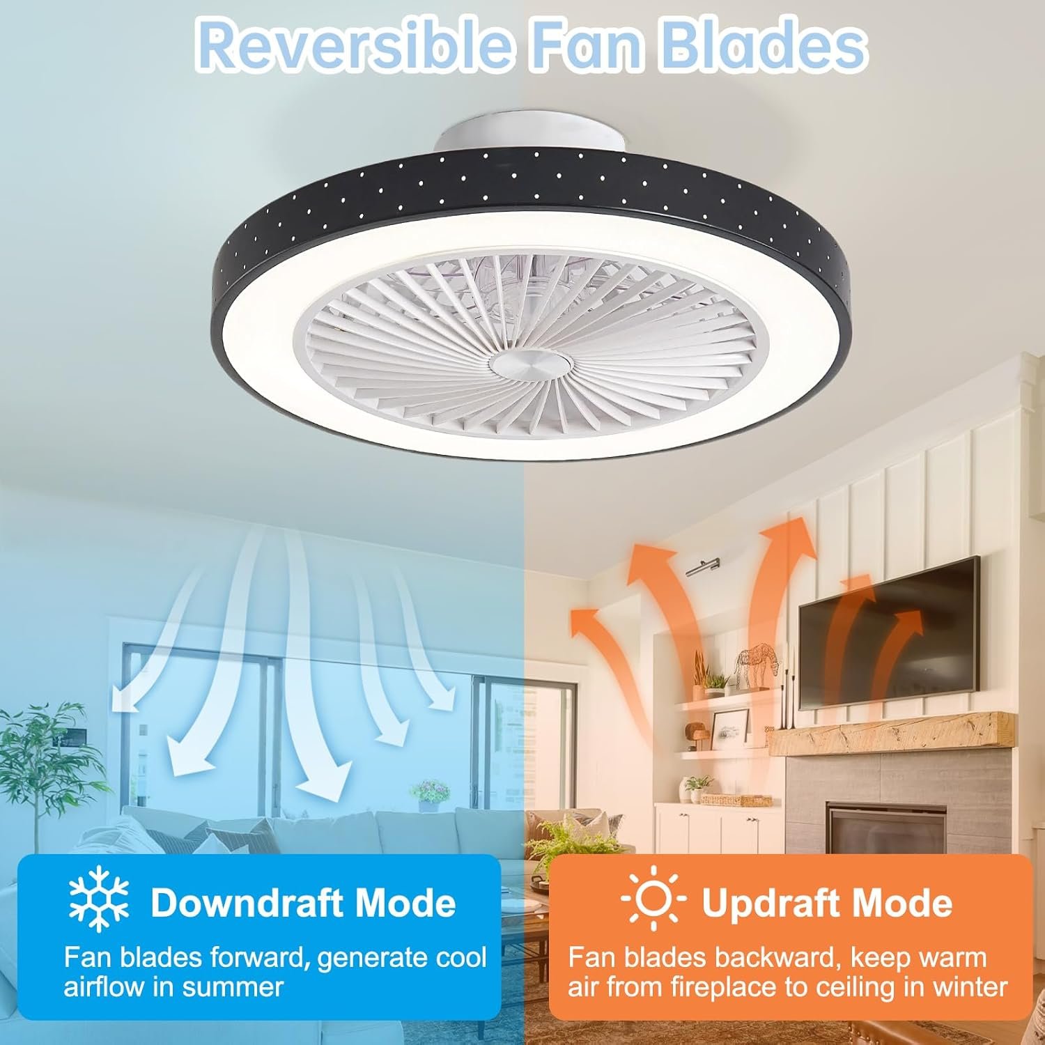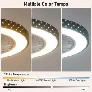 Diseño de ventilador de techo sin aspas: ventilador de techo moderno con 6 velocidades de viento mejoradas, las aspas del ventilador se pueden invertir, con una fuente de luz LED de 48 W que cuida los ojos puede ajustar el brillo y la temperatura del color, proporcionando aire fresco e iluminación para tu hogar. Además, la estructura del ventilador de techo cerrado puede evitar que las manos sean golpeadas por las aspas del ventilador, ideal para habitaciones con camas dobles y dormitorios de techo bajo, cocinas, lavandería. 6 velocidades de ventilador con motor CC: el ventilador de techo de perfil bajo tiene 6 opciones de velocidad, lo que te permite elegir el flujo de aire ideal, desde brisa suave hasta aire más fuerte, ideal para uso en verano en la cocina y en la mesa de comedor. Además, el cobre DC es más silencioso y ahorra costos de electricidad, con un ruido de trabajo