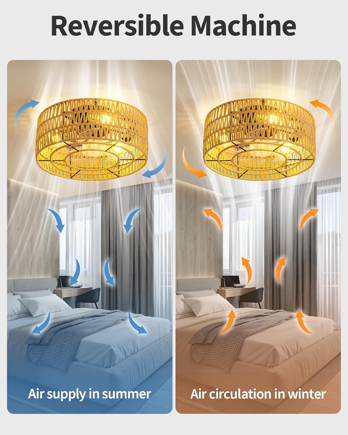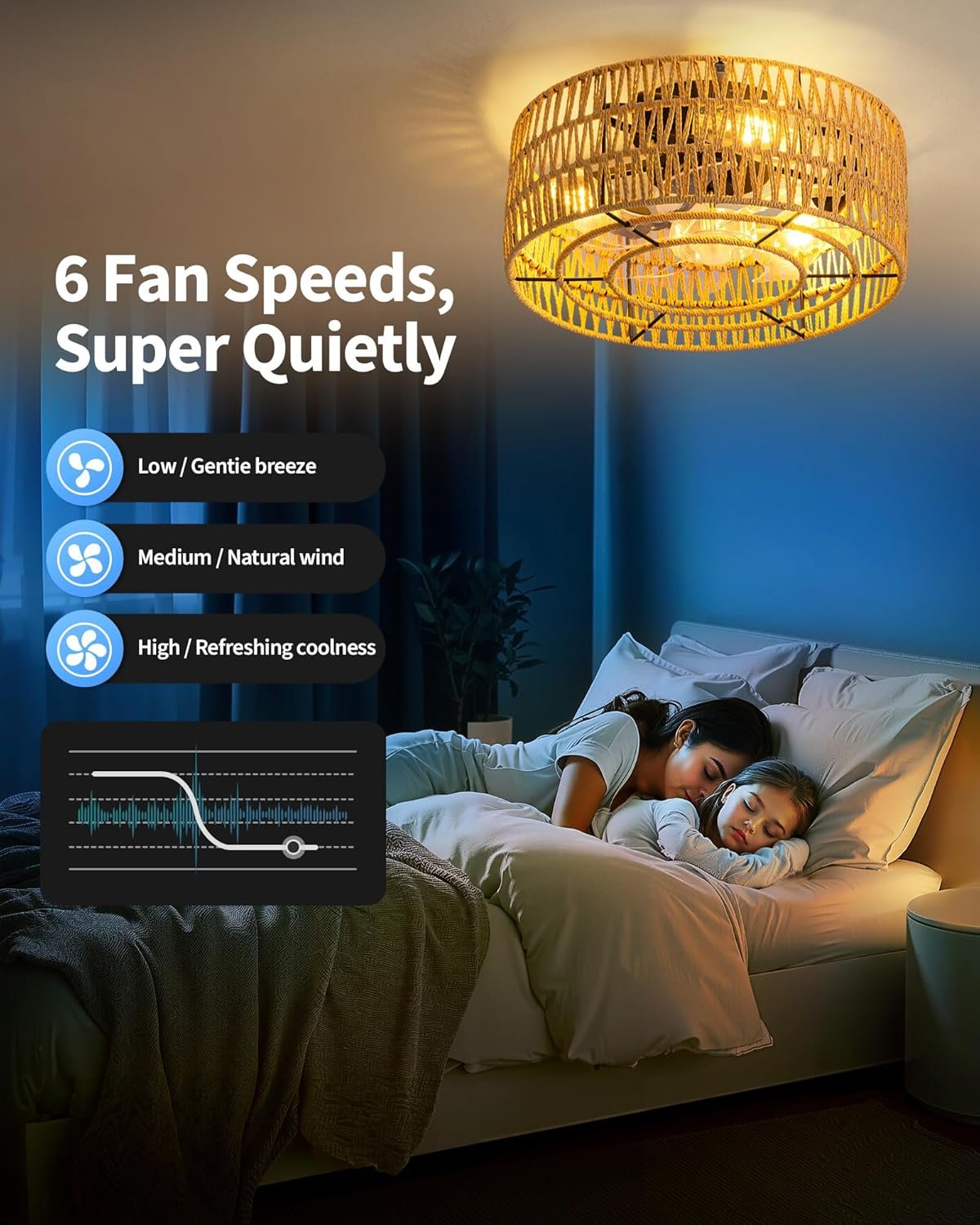 6 velocidades de viento y silencio: ya sea operado por interruptor de pared o control remoto. Equipado con control remoto de 6 velocidades de viento y función de apagado de temporizador de 1 hora, 2 horas, 4 horas, puedes controlar fácilmente la velocidad del viento y disfrutar de la experiencia cómoda de funcionamiento ultrasilencioso sin hojas y bajo decibelio. Base de bombilla E26: este ventilador de techo, etc. está construido con aspas de ventilador de ratán, hierro y plástico, área de cobertura: 50-130 pies cuadrados, equipado con base de bombilla E26, que soporta una potencia máxima de 40 W (Consejo: este producto no incluye bombillas, necesitas comprar por separado). Su estilo único de diseño bohemio, elegante y sin perder personalidad, se puede integrar perfectamente en el dormitorio, comedor, sala de estar, cocina y otras escenas del hogar. Función de temporizador: equipado con control remoto multifunción (pilas no incluidas, necesitas comprar pilas AAA), soporta 1 hora, 2 horas, 4 horas de función de apagado del temporizador de tres etapas, cubriendo eficazmente 32 pies de rango de control, lo que te permite controlar fácilmente el ventilador de techo y la iluminación. El control remoto admite el control independiente de la iluminación y el ventilador. Aire circulante: equipado con dos modos de flujo de aire para satisfacer completamente las necesidades de todas las estaciones. La función de rotación hacia adelante puede traer una brisa fresca y fresca en verano; la función de rotación inversa puede cambiar al flujo de aire ascendente en invierno, promoviendo eficazmente la circulación del aire interior. Equipado con un motor de cobre puro, el ventilador de techo funciona sin problemas y silenciosamente, lo que te ofrece una experiencia duradera y confiable. Instalación rápida: el proceso de instalación de la luz del ventilador de techo es extremadamente fácil, simplemente fija la luz del ventilador de techo firmemente en el techo, luego conecta los cables, ajusta la posición de la luz del ventilador de acuerdo con los agujeros y aprieta los tornillos para completar la instalación. (Para garantizar la seguridad, se recomienda ser operado por un electricista profesional). La luz del ventilador de techo es adecuada para dormitorio, comedor, sala de estar, garaje y otras ocasiones.