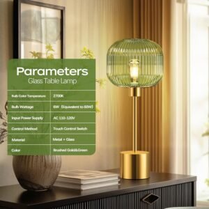 Lámpara de mesa elegante de cristal acanalado: Las lámparas para mesitas de noche presentan una atractiva pantalla de cristal acanalado verde vertical, más atractiva que una lámpara de cristal ordinaria. Combinada con base metálica en un impresionante acabado dorado cepillado, la lámpara de noche añade un toque sofisticado a la decoración de tu espacio. La lámpara de sala de estar con estética retro complementa sin esfuerzo cualquier diseño vintage o contemporáneo, convirtiéndola en una pieza de declaración para tu hogar. Se adapta perfectamente a tu hogar mientras proporciona iluminación esencial Lámpara táctil de control de brillo de 3 vías: la lámpara de dormitorio cuenta con brillo de 3 vías (bajo/medio/alto) para satisfacer tus necesidades, junto con un sensor de control táctil receptivo que te permite personalizar sin esfuerzo la iluminación para adaptarla a tus diversas necesidades y estados de ánimo a lo largo del día. Cambia sin esfuerzo entre tres niveles de brillo con un simple toque, asegurando el ambiente y la iluminación perfectos, ya sea que estés disfrutando de una noche acogedora en casa o ocupado con tu trabajo Iluminación ambiental suave y cálida: Equipadas con un portalámparas E26, las lámparas para el dormitorio están equipadas con una bombilla LED regulable de 6 W, E26, que emite una luz suave y cálida de 2700 K. La estructura con forma de linterna garantiza un reparto uniforme de la luz. La luz es suave y no deslumbrante, lo que mejorará enormemente el aspecto de tu lugar. La bombilla LED sin parpadeo garantiza un uso cómodo durante más de 25.000 horas. La característica hace que nuestras lámparas táctiles para mesita de noche sean una opción versátil para cualquier entorno Materiales y Construcción de Alta Calidad: Diseñado con una pantalla de vidrio de 4 mm de espesor y base de metal sólido. La lámpara de mesa para dormitorio no solo se ve sofisticada, sino que también está diseñada para durar. Compactas y elegantes, las lámparas de dormitorio miden 20,1 cm de ancho y 54,4 cm de alto, con un cable de 179,8 cm para una colocación versátil en cualquier habitación. La lámpara dorada eleva sin esfuerzo la atmósfera de tu dormitorio, sala de estar, estudio o entrada, añadiendo calidez a la decoración de tu hogar con su diseño atemporal Servicio confiable: la lámpara de mesita de noche es una pieza decorativa perfecta para mesitas de noche, mesas auxiliares o como un maravilloso regalo para sus seres queridos. La lámpara de mesita de noche solo tarda 1 minuto en instalar la pantalla y la bombilla. Fácil de usar con un diseño de enchufe simple, no se requiere cableado adicional para una operación conveniente. Contáctenos para obtener un reemplazo gratuito si el vidrio está dañado por el transporte. Si tus lámparas de mesita tienen algún defecto, te ayudaremos a solucionarlo o te enviaremos una nueva lámpara de vidrio