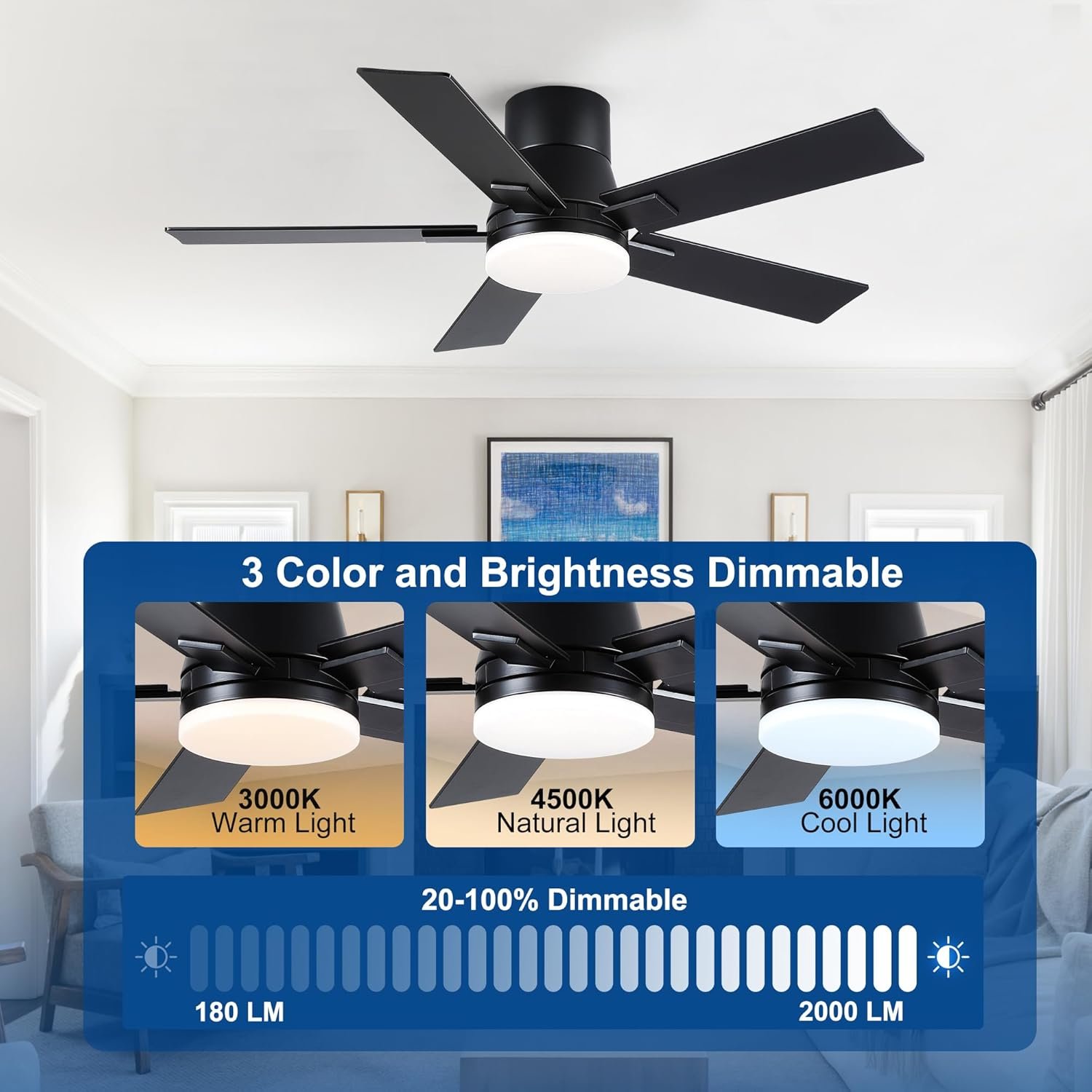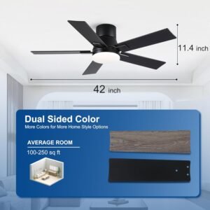 Diseño moderno y uso versátil: este ventilador de techo Rayqueen de 106,7 cm cuenta con un diseño minimalista y moderno con aspas de doble cara (negro mate y grano de madera), que combina perfectamente con cualquier decoración del hogar. Su pequeño tamaño lo hace ideal para dormitorios, salas de estar, cocinas, garajes e incluso patios cubiertos. El diseño de bajo perfil y montaje empotrado garantiza una integración perfecta en varios espacios. Iluminación brillante y de bajo consumo energético: equipado con un LED de 24 W (2000 lm), este ventilador de techo proporciona una iluminación brillante y personalizable con 3 temperaturas de color ajustables (3000 K/4500 K/6000 K) y brillo regulable (20% -100%). La luz LED de bajo consumo reduce el consumo de energía mientras ilumina tu hogar maravillosamente. Motor CC ultra silencioso y potente: el motor CC reversible de 6 velocidades ofrece un funcionamiento ultrasilencioso (por debajo de 32 dB) y un potente flujo de aire (hasta 3131 CFM). Perfecto para todas las estaciones, ofrece un flujo de aire fresco en verano y circulación de aire caliente en invierno, asegurando comodidad durante todo el año. Práctico control remoto y características inteligentes: el control remoto incluido te permite ajustar la velocidad del ventilador (1-6 niveles), el brillo de la luz y la temperatura del color sin esfuerzo. Disfruta de mayor comodidad con un temporizador de 1/3/6 horas, modo de suspensión y función de flujo de aire reversible para una circulación de aire óptima en cualquier temporada. Diseño modular y comodidad a largo plazo: todos los componentes clave (aspas del ventilador, cubierta de luz, luz LED y control remoto) son reemplazables para un uso prolongado. Cuenta con módulos enchufables y un montaje simple de la cuchilla (se requieren herramientas básicas; video de instalación proporcionado). Certificado ETL para seguridad y respaldado por soporte 24/7: contáctenos a través de Amazon Message para reemplazos, piezas de repuesto o asistencia para reparaciones.
