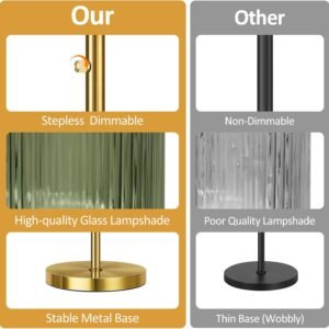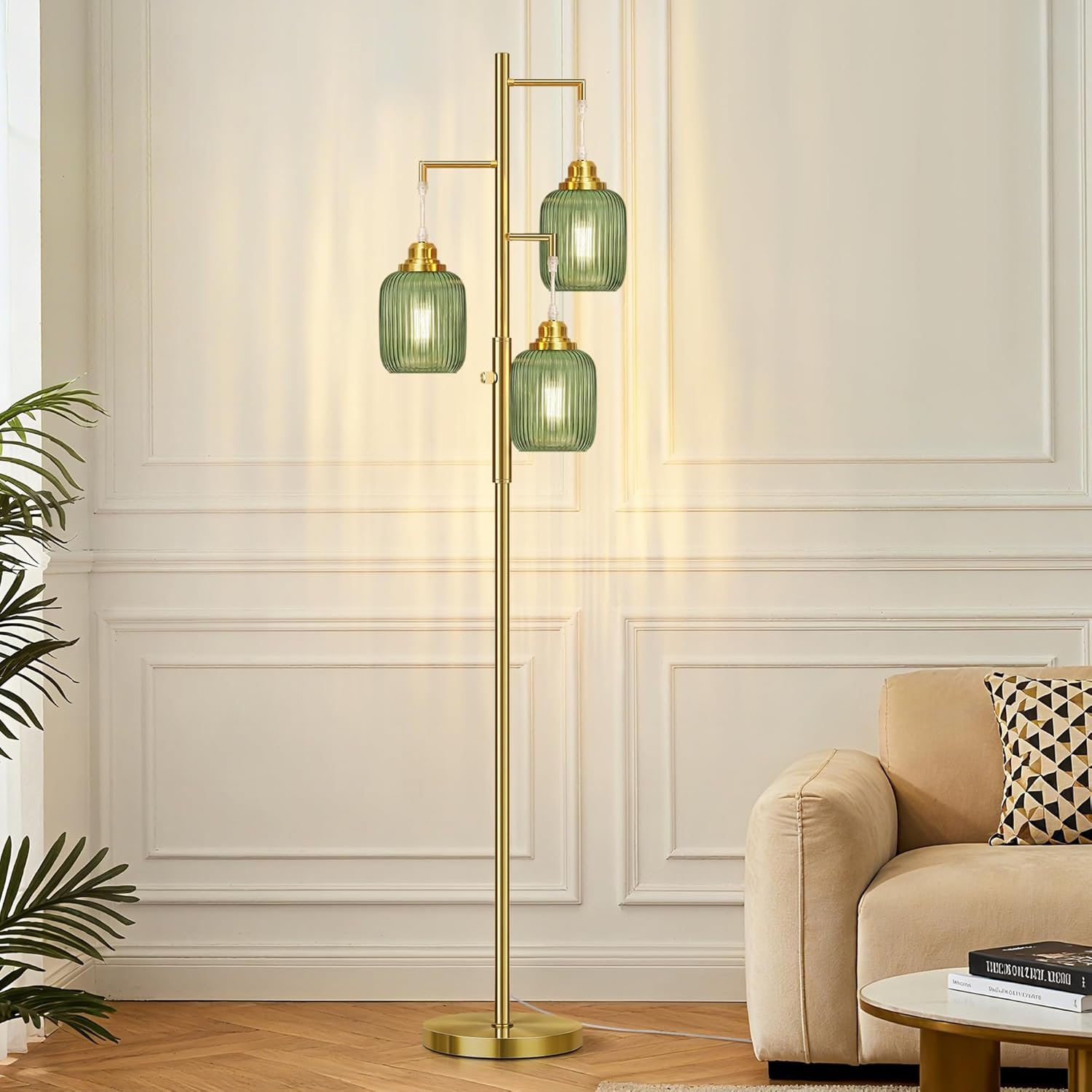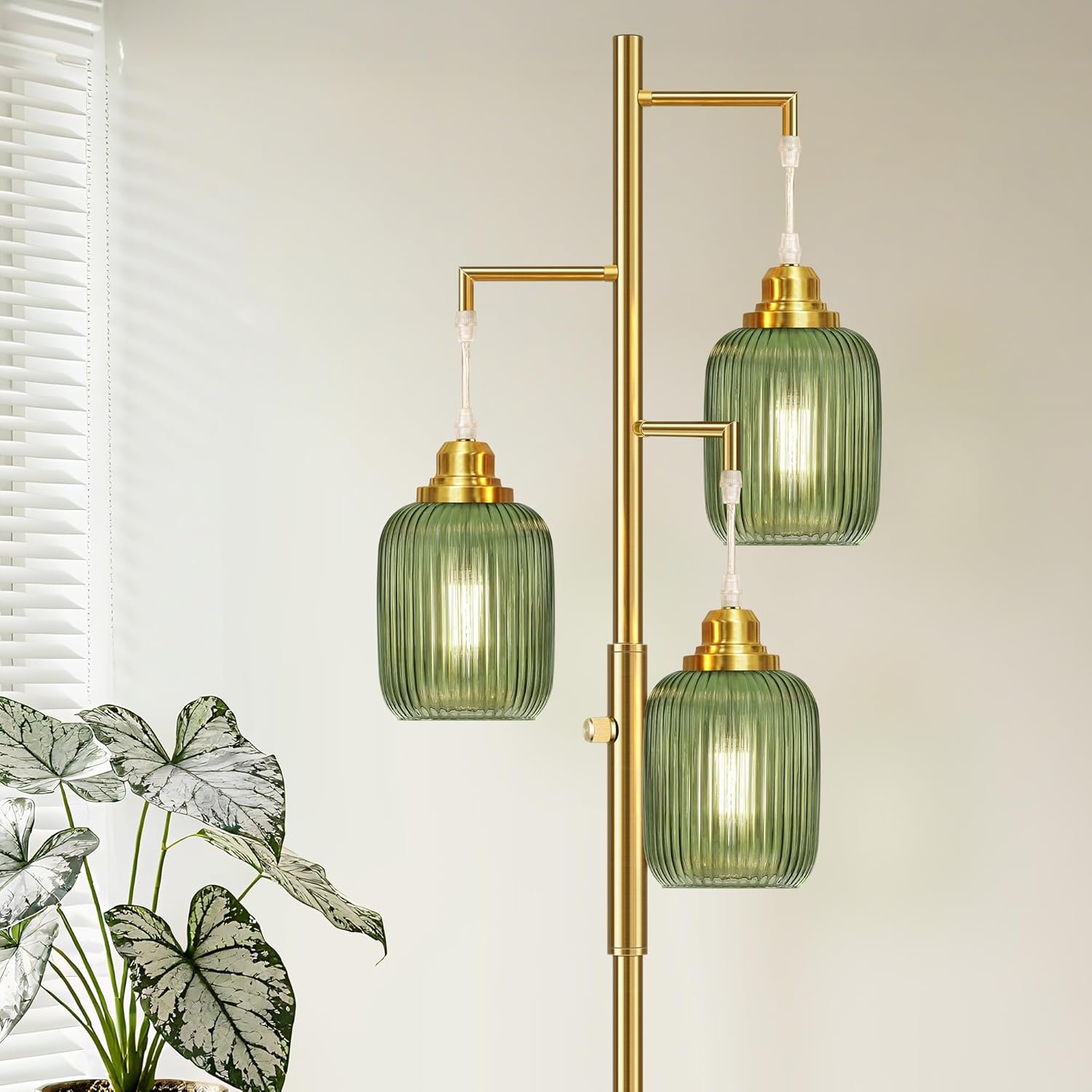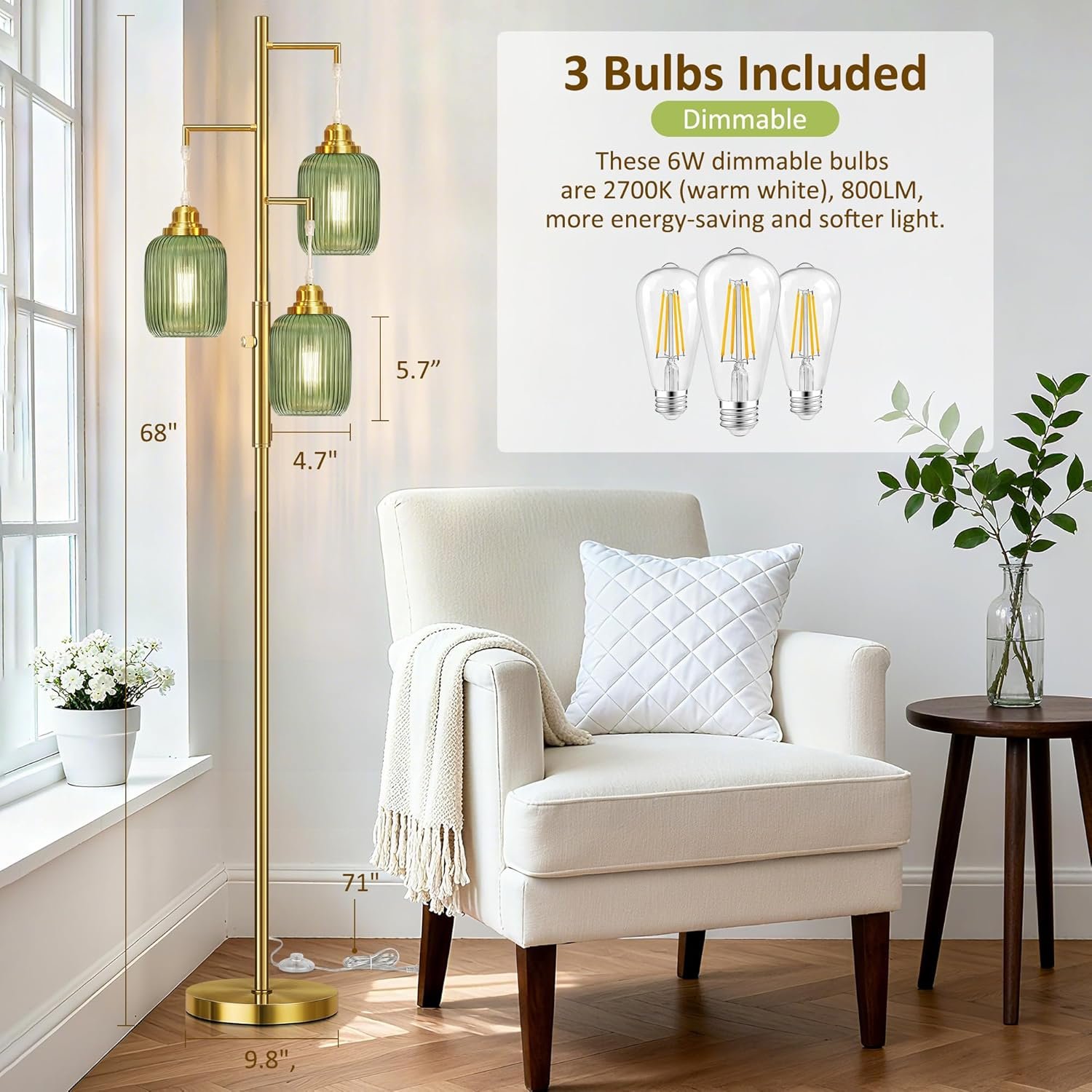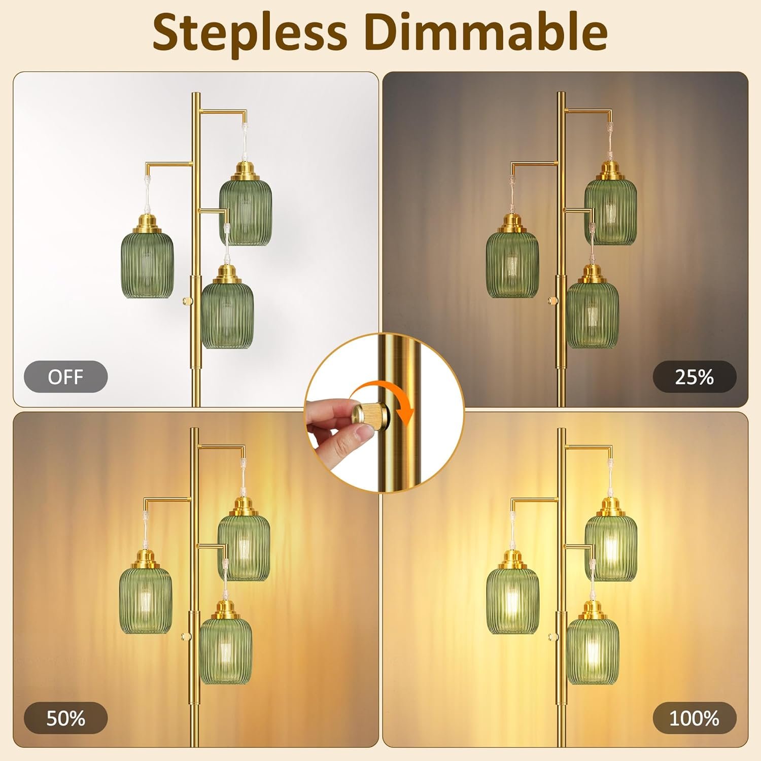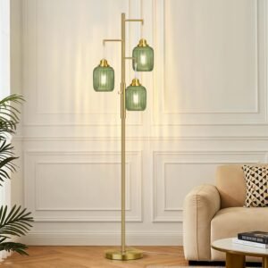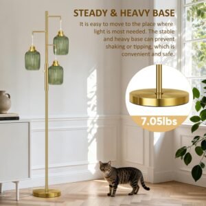 Regulación sin escalonamientos (0-100%): A diferencia de las lámparas de pie tradicionales no regulables para la sala de estar, nuestra lámpara de pie regulable es completamente regulable sin escalonamientos. Simplemente gírala y luego puedes ajustar la lámpara de pie verde al rango de brillo de 0 a 100% de acuerdo a las necesidades de diferentes escenas Bombillas LED incluidas: para tu mejor experiencia de usuario, estas lámparas de pie bohemias proporcionan 3 bombillas LED regulables de 6 W. Tres bombillas emiten luz cálida de 2700 K en total y solo consumen 6 W. Las bombillas premium no parpadean, tienen luz suave y tienen una vida útil más larga Aspecto elegante y único: si quieres decorar tu hogar, esta lámpara de pie brillante será una buena opción. Está equipado con 3 hermosas lámparas colgantes de vidrio verde, que pueden añadir un efecto decorativo a tu habitación. Estas lámparas industriales de pie son perfectas para áreas interiores generales, que incluyen el comedor, sala de estar, dormitorios, oficinas, cocina, pasillo, cafetería, sótano, bar y club Material de alta calidad y base de metal resistente: esta lámpara de pie de 3 luces está hecha de materiales de alta calidad para crear una base pesada y estable y un poste de luz para garantizar la estabilidad incluso en la alfombra. A diferencia de otros acabados de pintura que se despegan fácilmente, utilizamos un acabado de cepillo dorado de alta calidad. Son firmes y resistentes, nunca se doblan. La base es lo suficientemente fiable, no importa que se caiga debido a un signo de perturbación o problemas Fácil instalación: viene con todos los accesorios de montaje para una configuración rápida. Nuestras modernas lámparas de pie son muy fáciles de instalar. No hay procedimientos complejos, por lo que puede disfrutar de la hermosa luz de inmediato. Estas lámparas cuentan con 3 enchufes E26 resistentes al calor (máximo 60W), asegurando una compatibilidad segura y confiable con cualquier bombilla estándar E26 al reemplazar o actualizar su iluminación