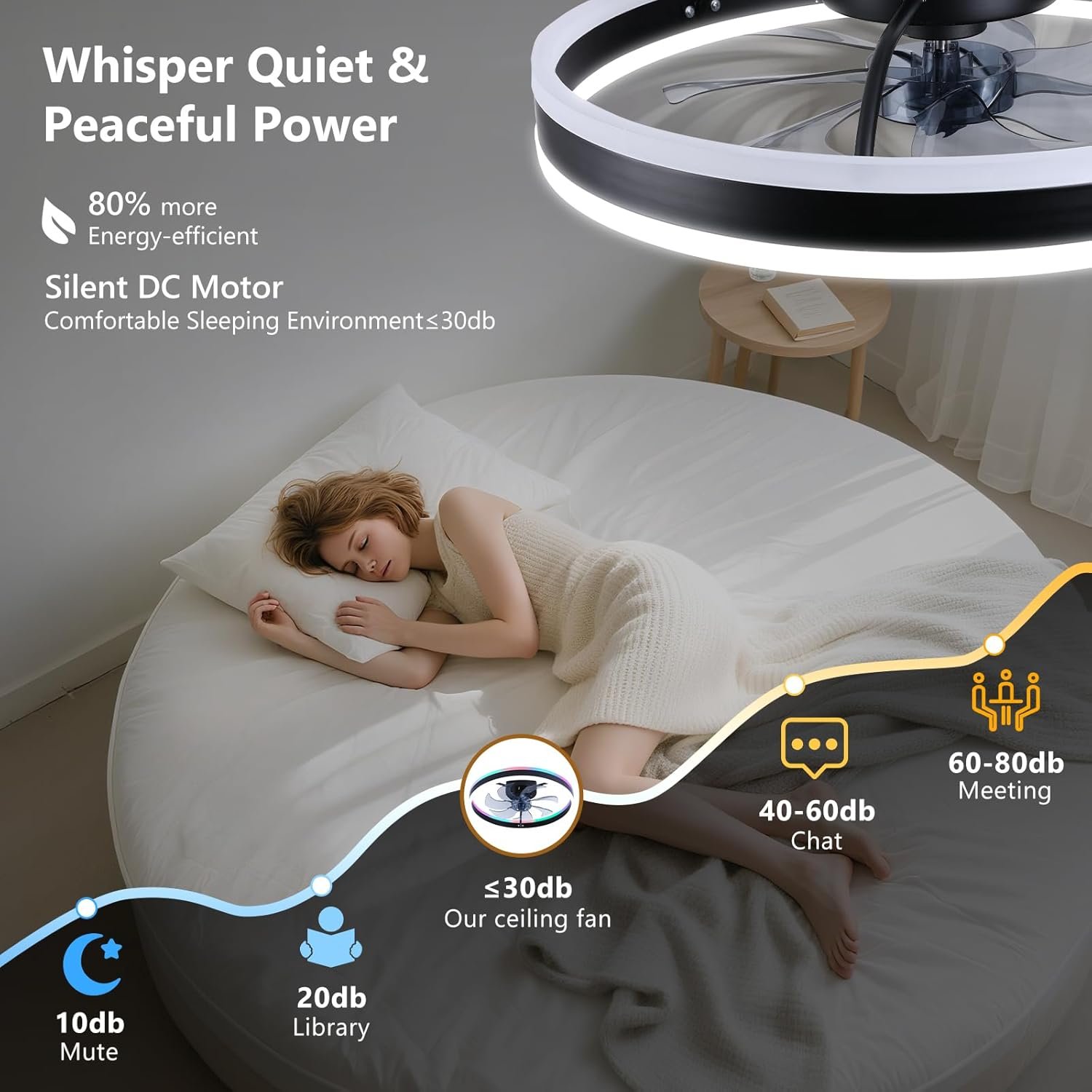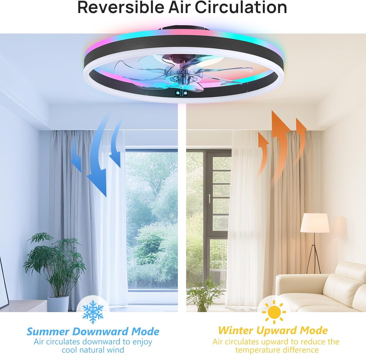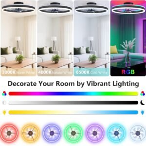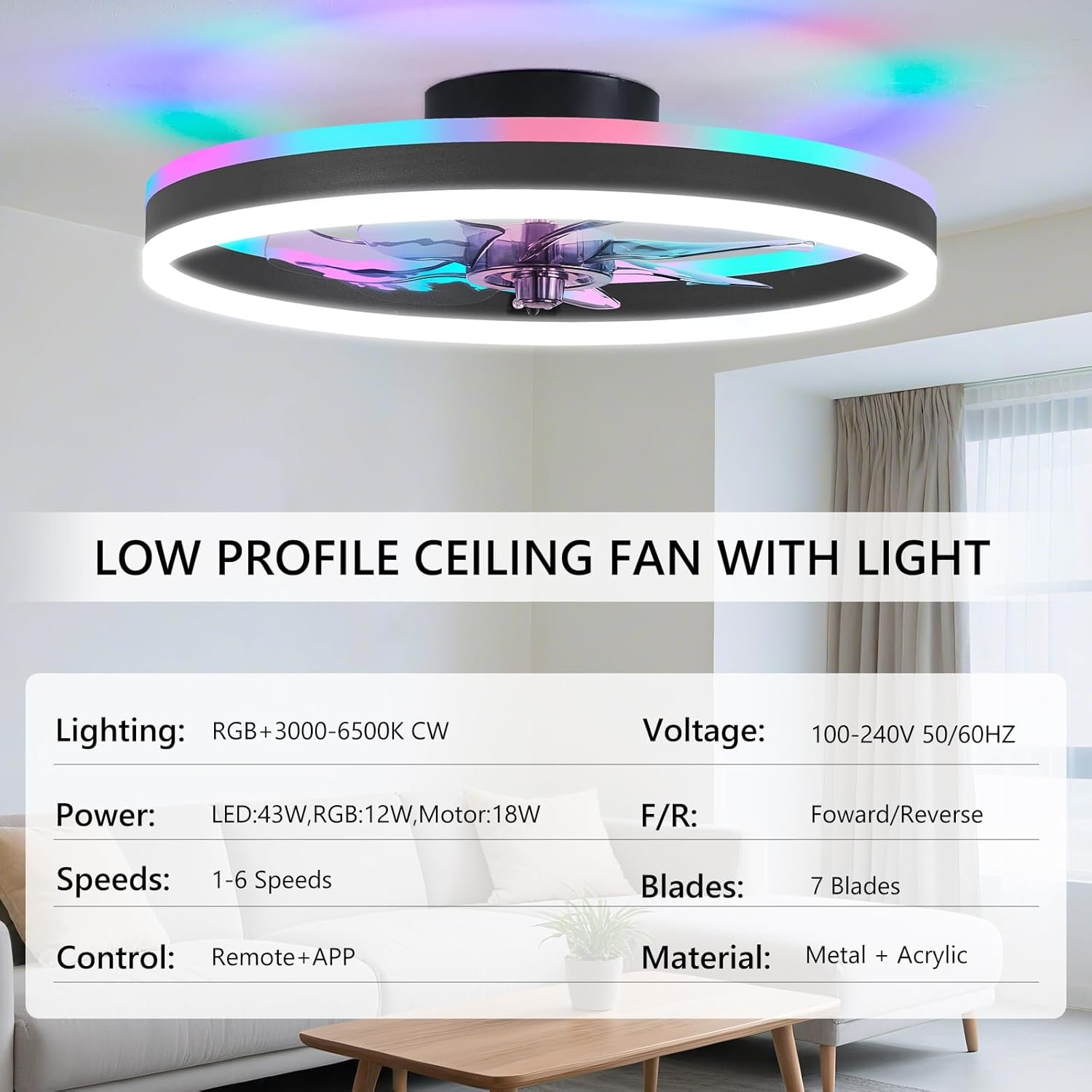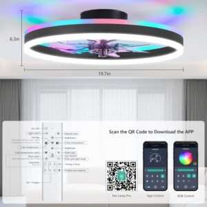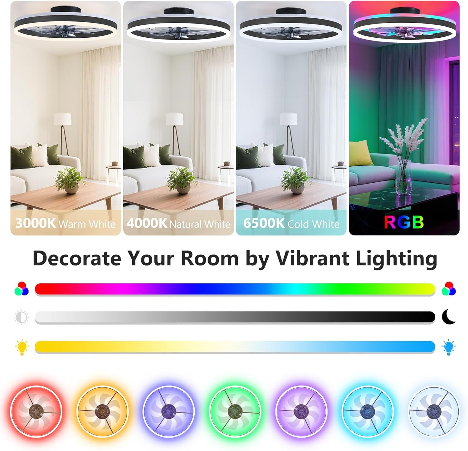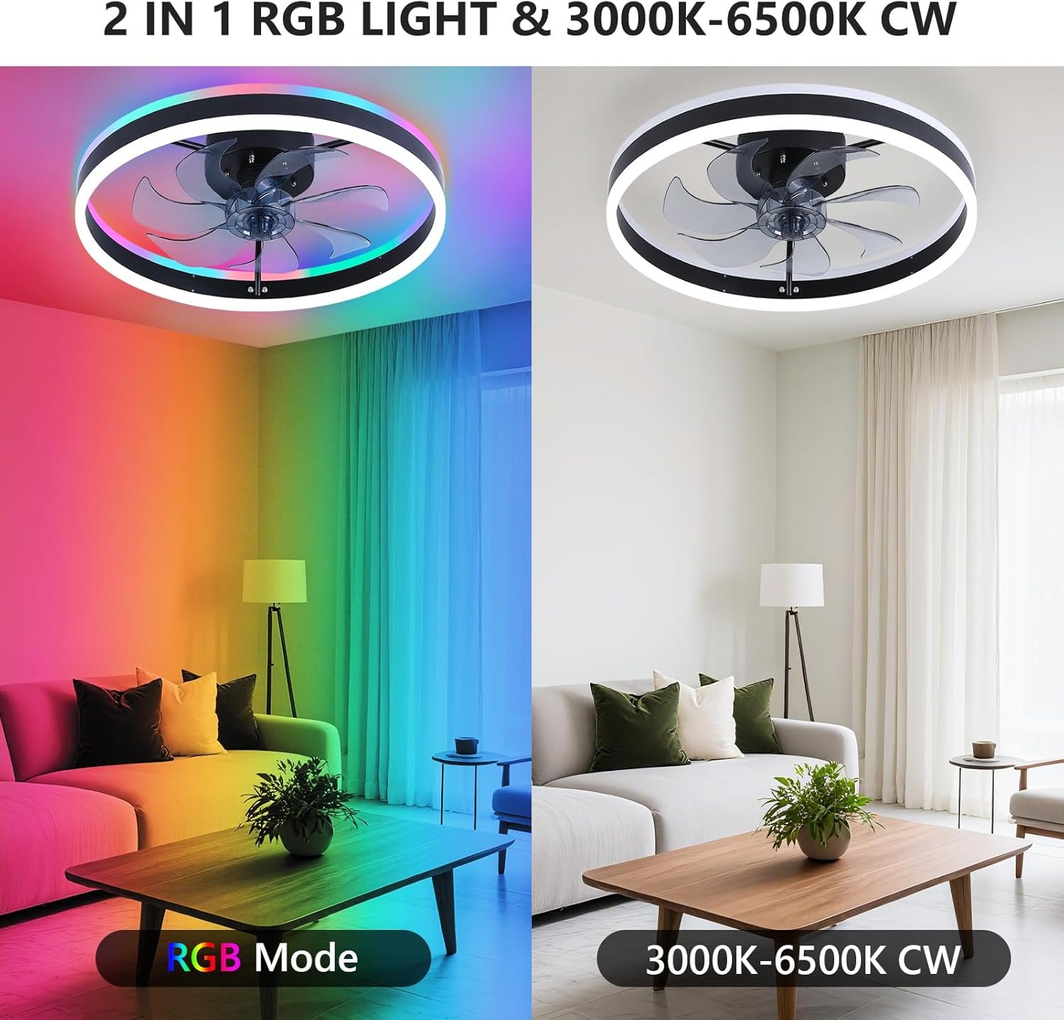 Cambio de color RGB + LED regulable: sumerge tu habitación en un ambiente vibrante con 16 millones de colores RGB o elige entre blanco cálido a luz diurna (3000 K-6500 K) con nuestra luz de ventilador de techo. Ajusta el brillo y los colores sin esfuerzo a través de la aplicación dedicada, el control remoto. Crea escenas de iluminación personalizadas para noches de cine, fiestas o noches relajantes. Los LED de alto CRI garantizan que tu espacio esté iluminado con colores verdaderos y vívidos Comodidad para todas las estaciones con ventilador silencioso: experimente un flujo de aire óptimo con nuestro ventilador de techo de perfil bajo de 50,0 cm, cuenta con un eficiente motor de CC que ofrece un potente movimiento de aire. Al girar hacia adelante, el viento fluye hacia abajo y baja la temperatura de su habitación, lo que le brinda un verano fresco. Al invertir, el viento fluye hacia arriba, lo que le permite mantener el flujo de aire en la habitación durante el invierno. Esta lámpara de araña lo convierte en una solución de bajo consumo para cualquier estación Diseño de montaje empotrado de perfil bajo: ideal para habitaciones con techos bajos, este ventilador de techo de montaje empotrado cuenta con un diseño compacto que ahorra espacio sin sacrificar el estilo o el rendimiento. El aspecto elegante y moderno combina perfectamente con interiores contemporáneos mientras proporciona un potente flujo de aire e iluminación vibrante Aplicación inteligente/control remoto: este moderno ventilador de techo con luz tiene 6 velocidades de ventilador ajustables para un control preciso del flujo de aire, temporizador de sueño, color de luz regulable y temperatura, modo de viento natural, modo de luz nocturna, función de memoria, todas las funciones son fáciles de controlar con el control remoto o la aplicación. Personaliza la iluminación RGB de cambio de color según tus necesidades, crea el ambiente deseado con tu familia y amigos Fácil instalación y uso versátil: el ventilador de techo de montaje empotrado cuenta con una instalación simplificada con la mayoría de los componentes premontados, reduciendo el ensamblaje complejo; Fácil de conectar los cables y montar los ventiladores de techo con luces en el techo, el manual del usuario contiene un paso de instalación detallado. Este candelabro de ventilador es muy adecuado para espacios interiores como salas de estar, dormitorios, pasillos, cocinas, salas de estudio, etc