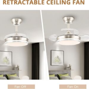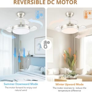Ventilador de techo retráctil que ahorra espacio Este ventilador de techo LED viene con 3 aspas de acrílico transparente que se retráctan automáticamente cuando el ventilador está apagado para ahorrar espacio en tu habitación (Diámetro de 76,2 cm cuando está extendido y 30,5 cm cuando está retraído). Perfecto para dormitorios, salas de estar, cocinas, oficina en casa y otras habitaciones pequeñas. Luz de ventilador LED de atenuación continua: personaliza tu moderno ventilador de araña con opciones de 3000 K (blanco cálido), 4500 K (blanco natural) y 6500 K (blanco frío), atenuación continua para establecer el ambiente perfecto para noches de cine, cenas o trabajo. Práctico control remoto y control por aplicación: el ventilador de techo de 6 velocidades y la luz LED regulable se pueden controlar individualmente, controla la velocidad del ventilador, los ajustes de luz y la programación desde cualquier lugar de la habitación, a través del control remoto incluido o descargando la aplicación. Ventilador de techo reversible silencioso para todas las estaciones: el motor de CC ofrece un potente flujo de aire con un rendimiento silencioso, disfruta del verano fresco con un potente flujo de aire de 6 velocidades, o cambia al modo inverso en invierno para distribuir el aire caliente de manera uniforme, reduciendo los costos de energía durante todo el año. Fácil instalación: proceso de instalación simple, generalmente completado en media hora. También ofrecemos soporte técnico las 24 horas. El elegante acabado mate combina perfectamente con cualquier decoración, este ventilador de techo es ideal para apartamentos, oficinas, guarderías y otros espacios interiores pequeños.