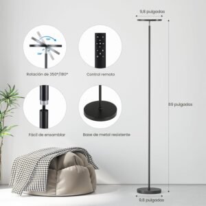 Lámpara de pie súper brillante y regulable: la nueva lámpara de pie LED de SUNMORY para sala de estar soporta brillo de atenuación continua (5%-100%) y temperatura de color (3000K-6000K). Y esta es una lámpara de pie súper brillante con 32W/3000LM, proporcionando suficiente iluminación para tu sala de estar o dormitorio. Ya sea que estés leyendo, escribiendo, la lámpara de pie proporciona una luz suave y brillante que es más fácil para los ojos. Las luces LED de 175,3 cm para dormitorio tienen un perfil delgado que combina perfectamente con cualquier estilo de decoración de habitación. Control remoto y multifunción: la lámpara de pie con control remoto tiene la capacidad de administrar fácilmente los ajustes de la lámpara desde cualquier lugar dentro de 50 pies. Con el control remoto, puedes cambiar fácilmente entre 4 modos de iluminación (lectura, alimentación, trabajo y modos de luz nocturna) para satisfacer tus diversas necesidades de escena. Esta lámpara de pie es perfecta como lámpara de esquina, lámparas para sala de estar, lámpara para dormitorio o lámpara de oficina. También cuenta con una función de memoria para recordar tus últimos ajustes de iluminación. Cabezal de lámpara giratorio y base pesada: las lámparas de sala de estar se pueden girar 350° horizontalmente y 180° longitudinalmente para guiar la luz según sea necesario. Puede girar fácilmente el soporte de la lámpara alta al ángulo deseado para iluminar cada esquina de la habitación. Además, las luces SUNMORY para dormitorio tienen una base gruesa, que es lo suficientemente fuerte y estable, por lo que no tienes que preocuparte por inclinarla demasiado, haciéndola muy segura y confiable. Larga vida útil y ahorro de energía: las lámparas de pie modernas utilizan tecnología avanzada LED de alto brillo y bajo calor. Bajo la corriente y voltaje correctos, estas perlas de lámpara LED tienen una vida útil de hasta 30,000 horas, y su brillo es comparable a las lámparas incandescentes de 200W. Pero consume menos energía y es más eficiente, ahorrando más del 80% de las facturas de electricidad de iluminación. Un índice de reproducción cromática alto de 80+ te ofrece colores vívidos y naturales, mejor disfrute visual y una atmósfera confortable. Fácil de montar: consulta el manual de usuario incluido en nuestro paquete, que explica la instalación exacta de la lámpara de pie negra con un video. Lo suficientemente simple como para garantizar que solo necesitas unos 5-10 minutos para completar con éxito la instalación. Si tienes alguna pregunta o es probable que no estés satisfecho con las lámparas para la sala de estar después de recibirlas, no dudes en ponerte en contacto con nosotros. Lo trataremos lo antes posible para lograr un resultado mutuamente satisfactorio.